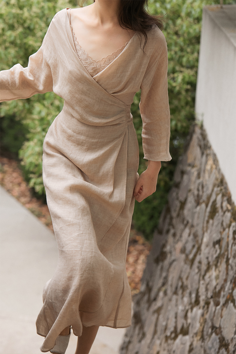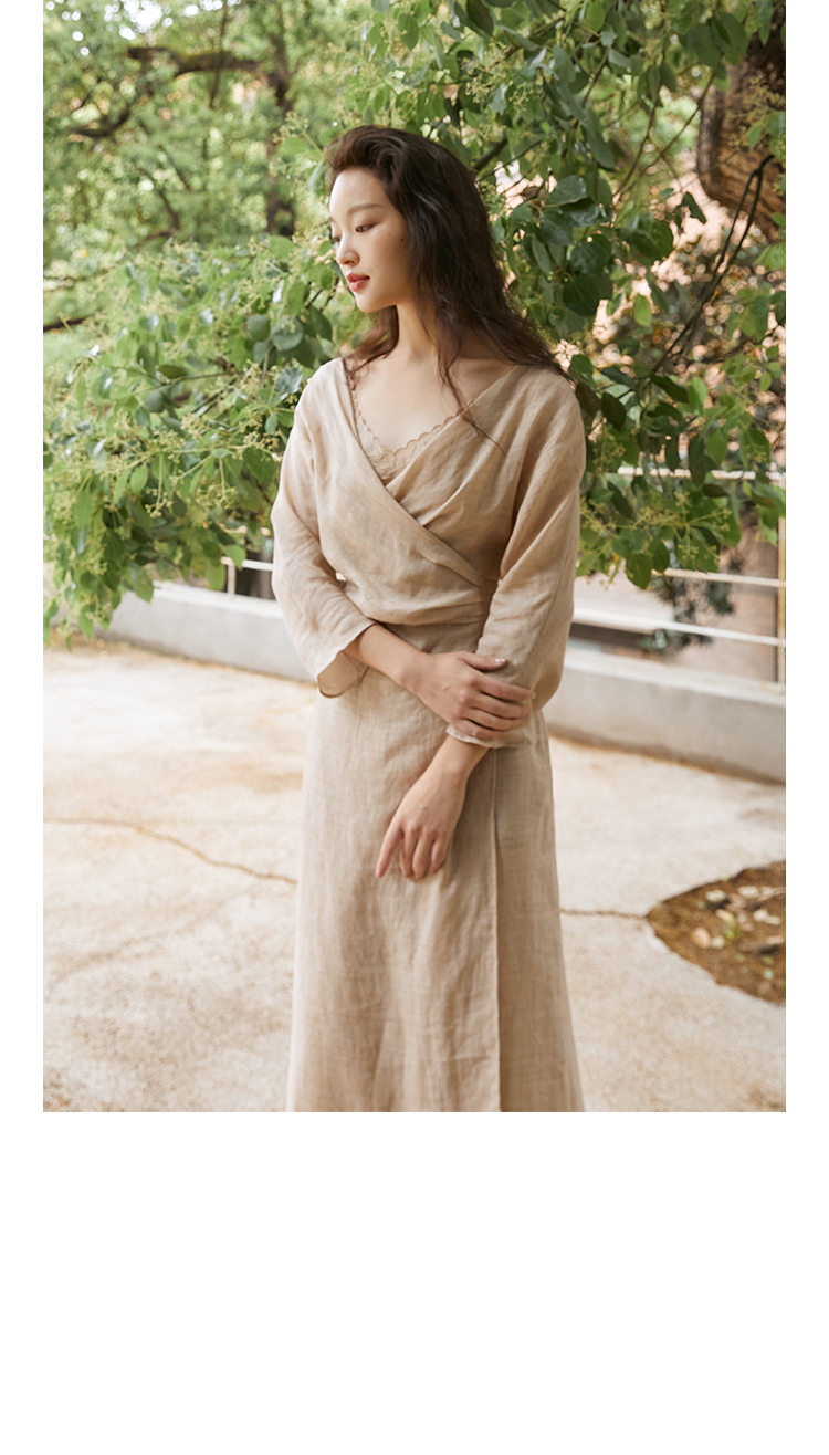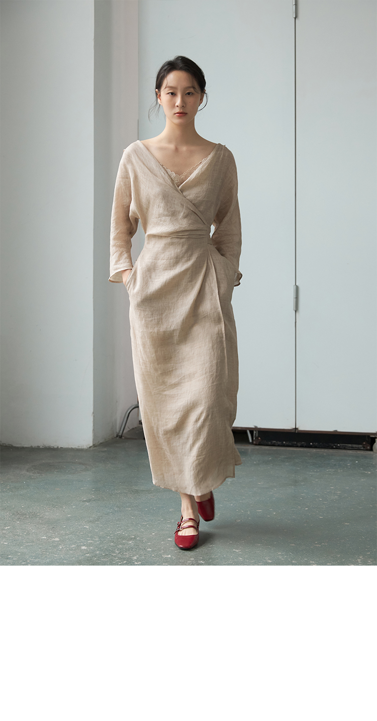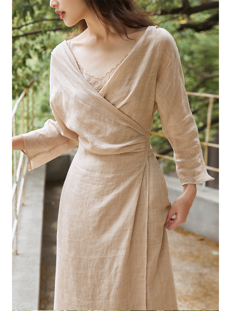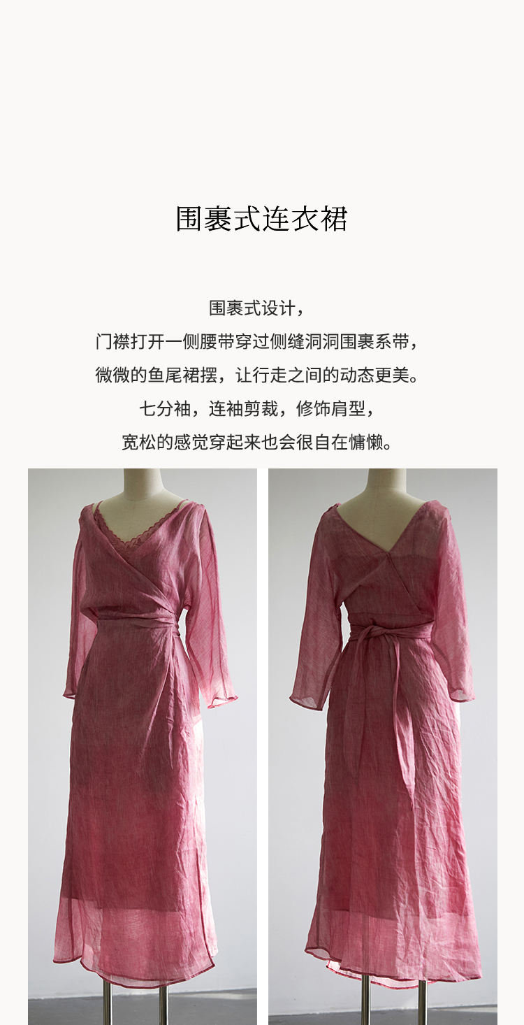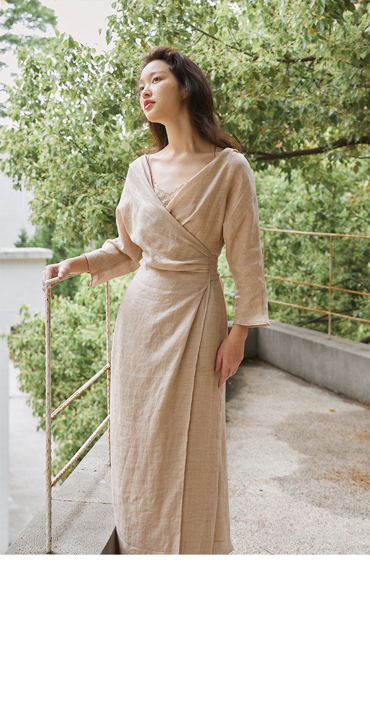 Asaya2156 : Wrap-style tie design dress with V neck collar