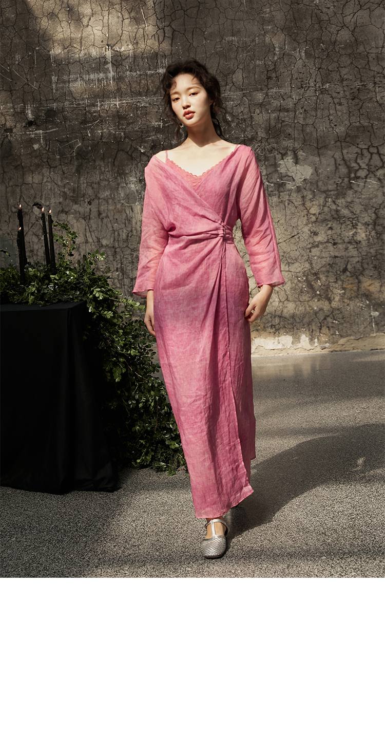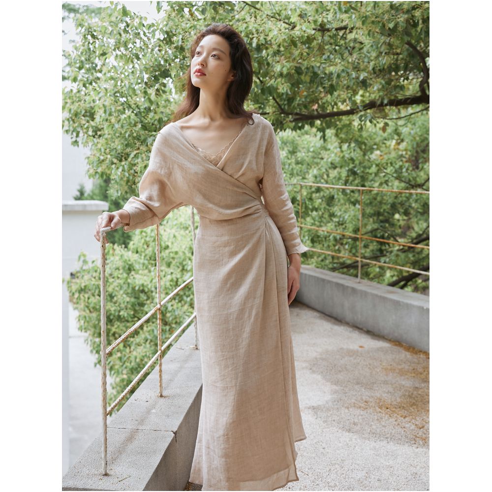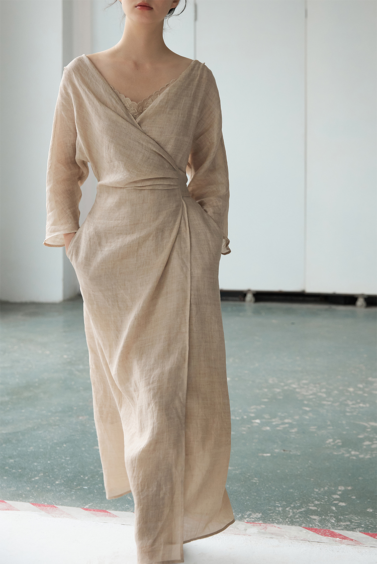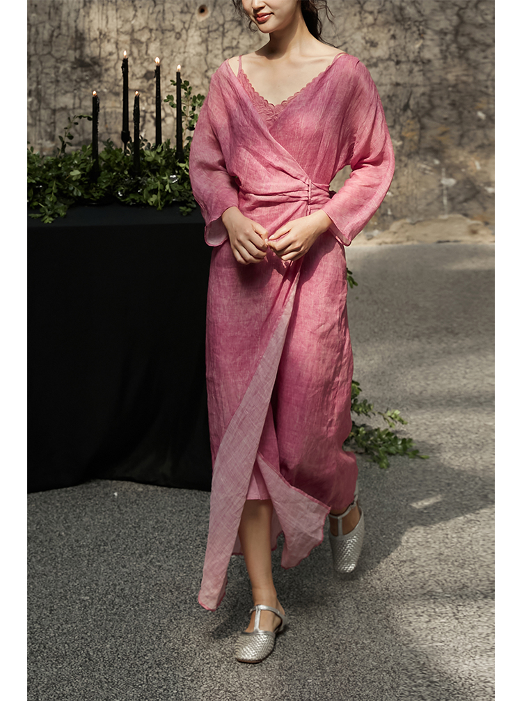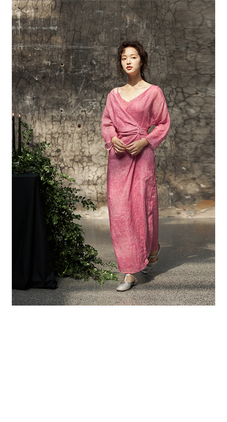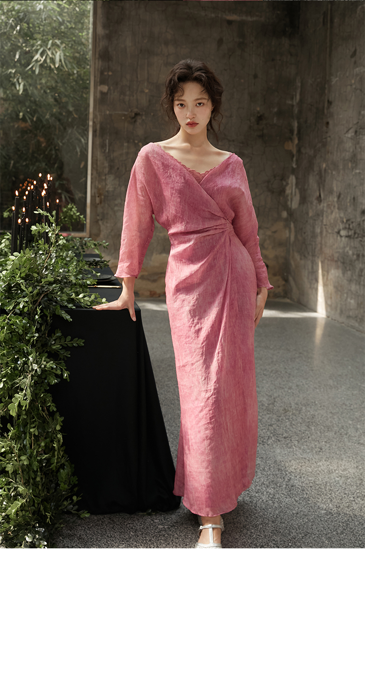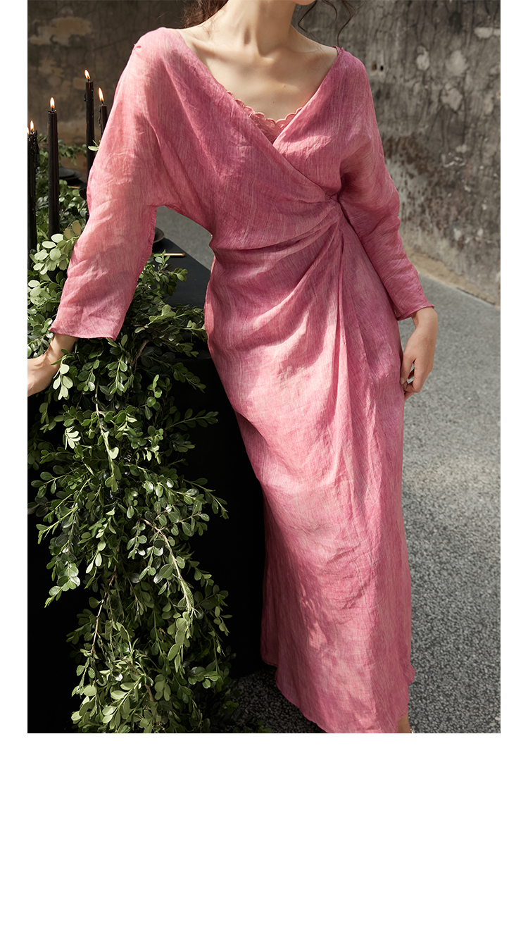 Asaya2156 : Wrap-style tie design dress with V neck collar
