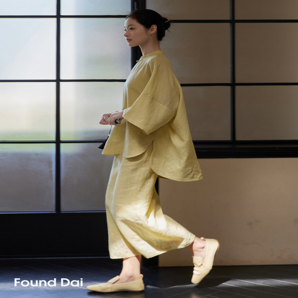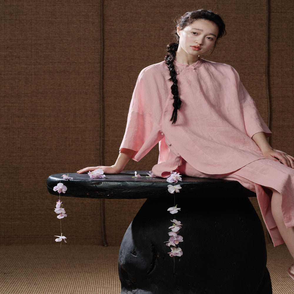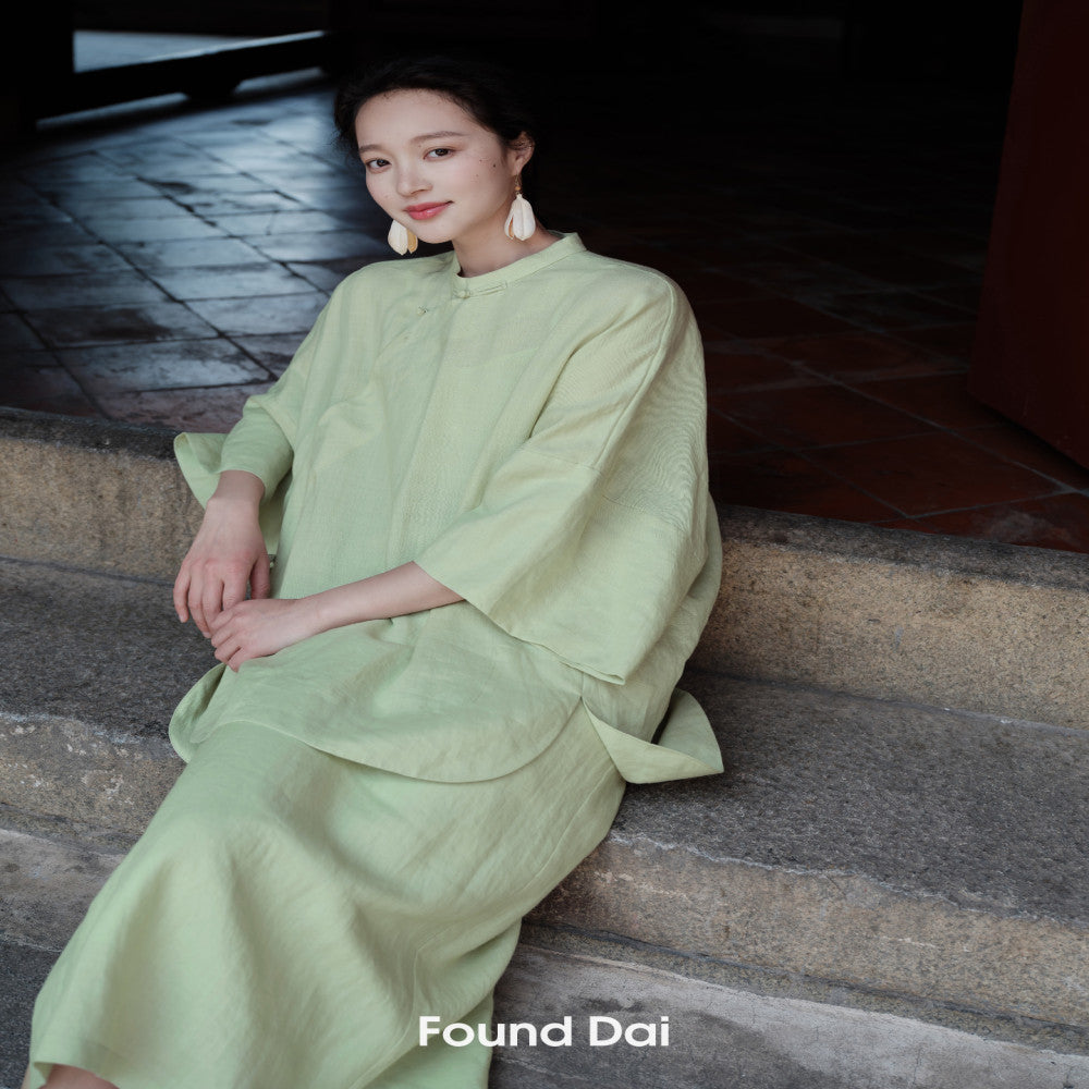 ASAYA3412 100% ramie | New Chinese style tailoring, stand-up collar and large placket top | Wide side hem and layered skirt