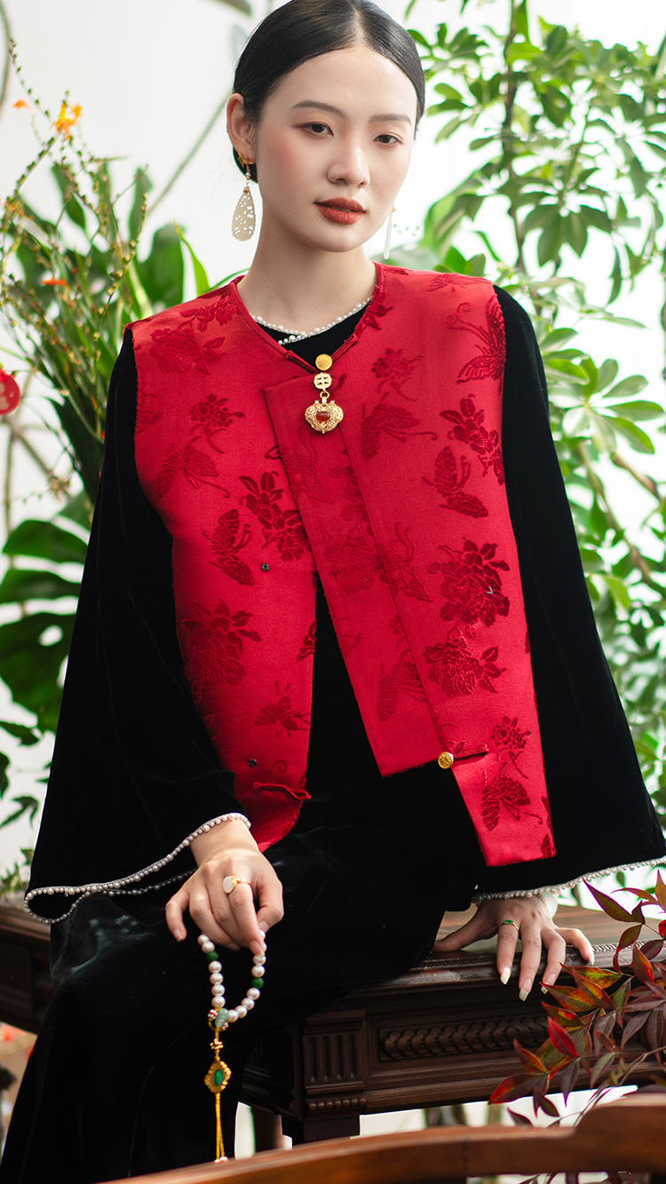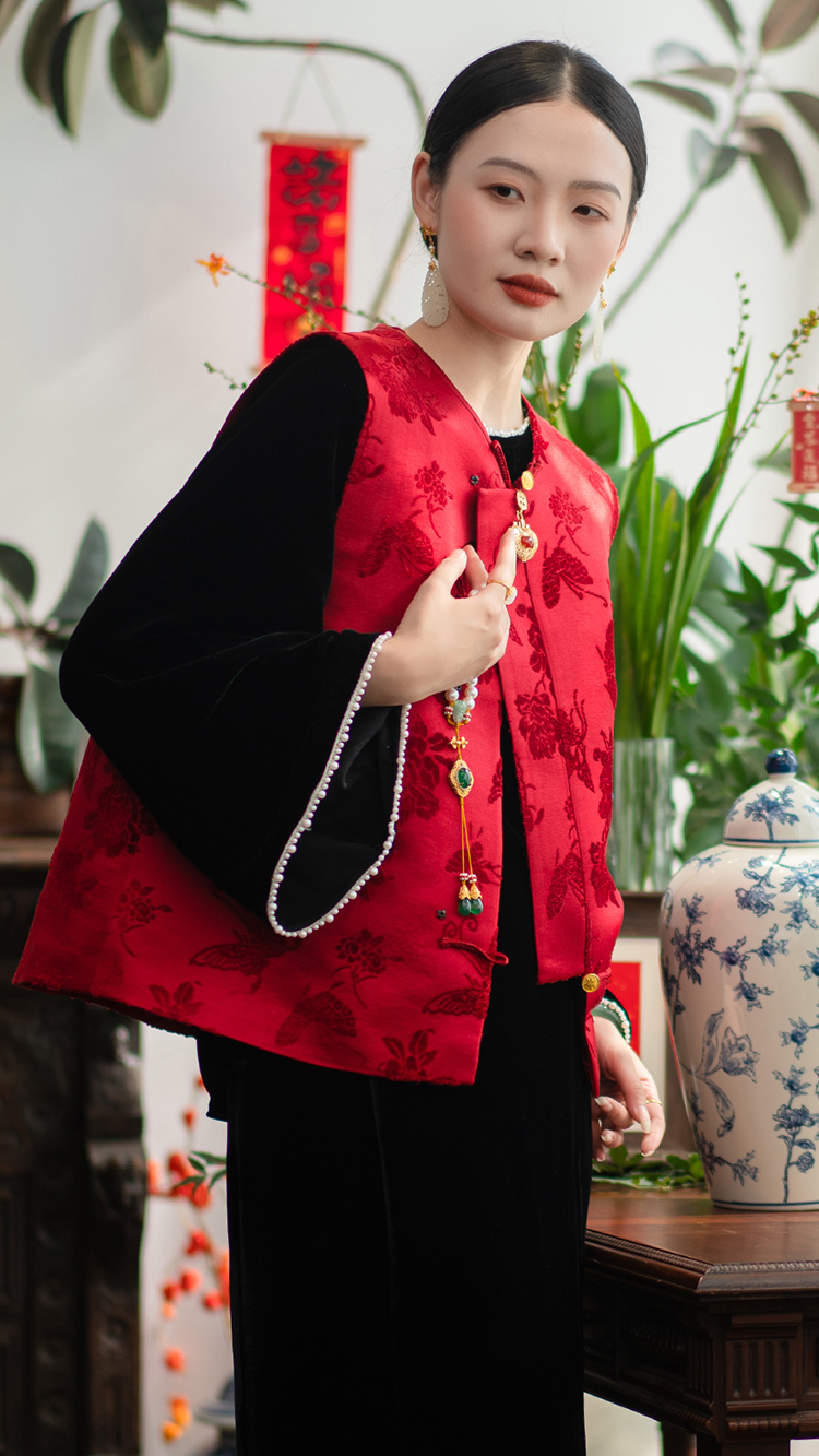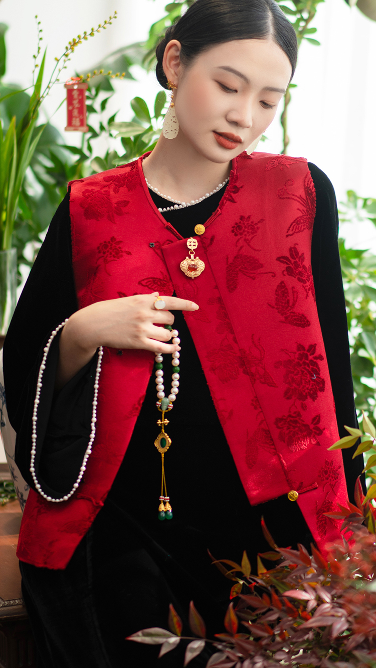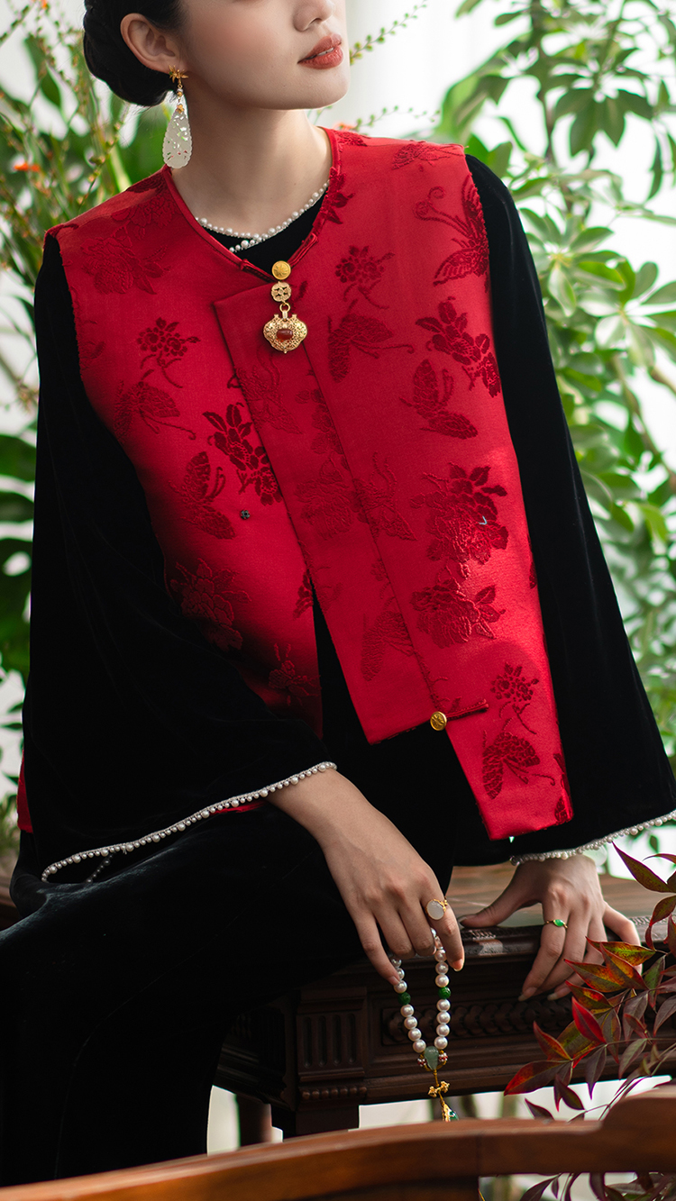 ASAYA2762 Red Dielianhua Chinese Retro Round Neck Vestole Waistcoat Jacket