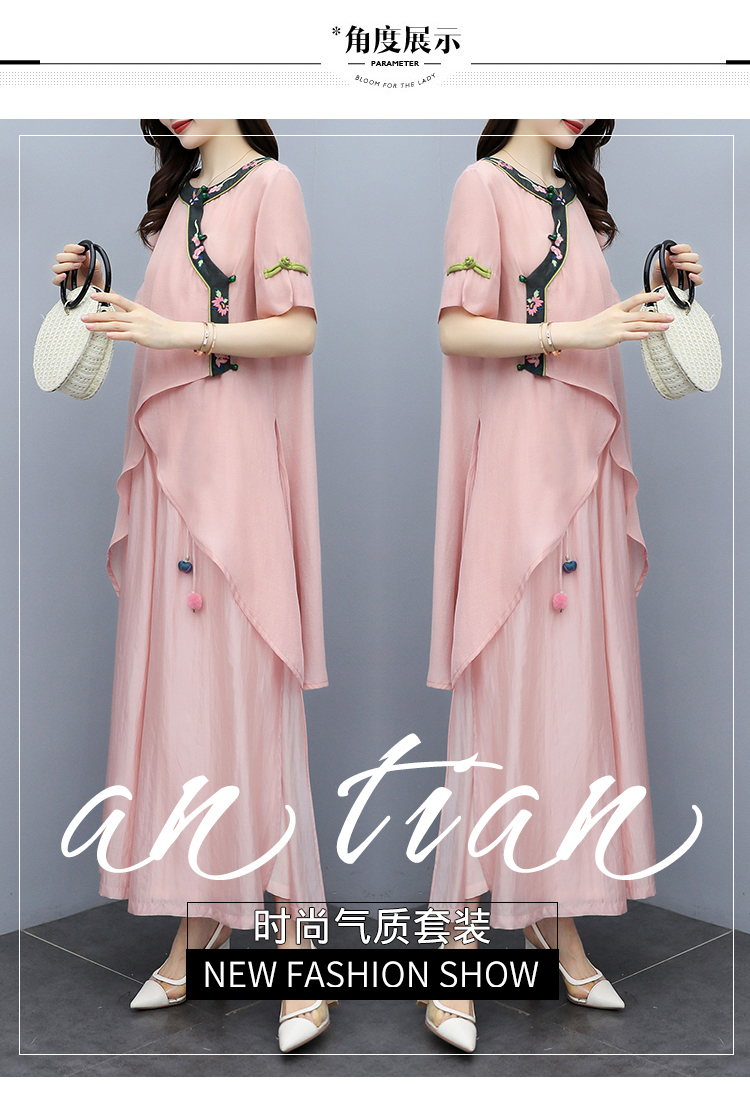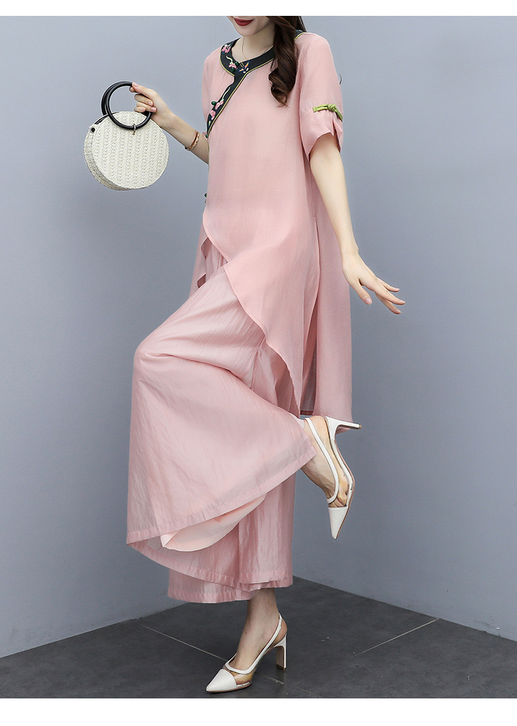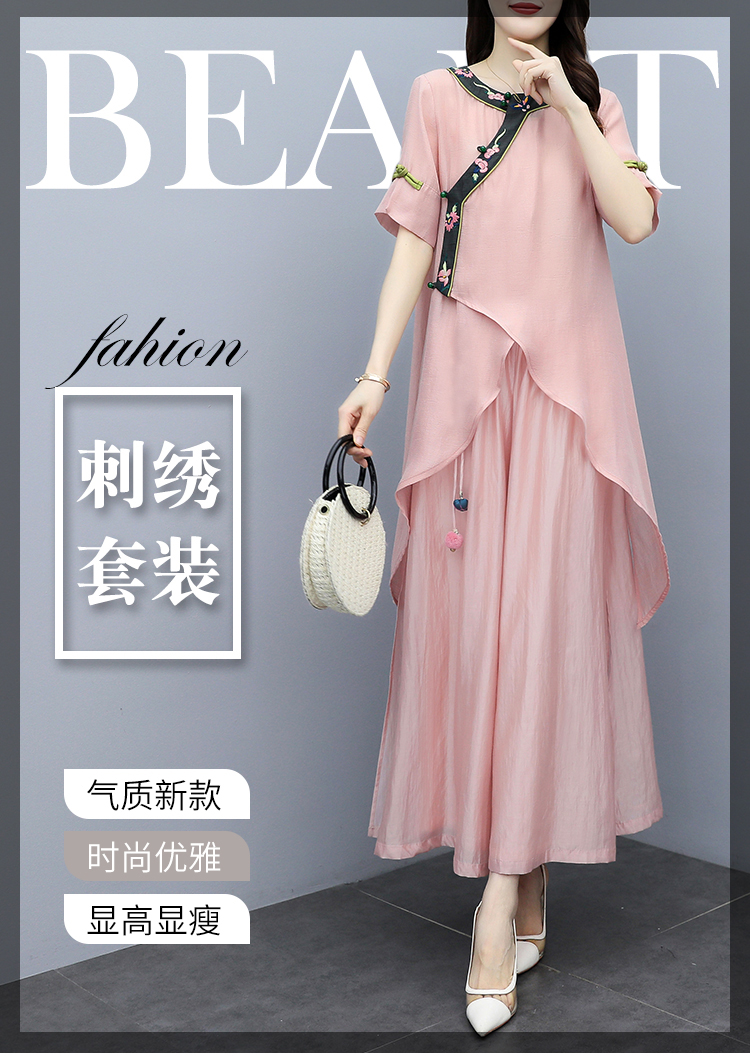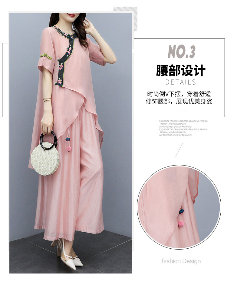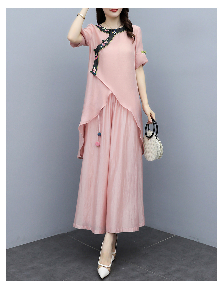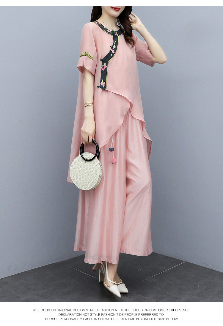 Asaya337 - New Women s Clothing Pink Embroidered New Chinese Mother s Clothing Two Piece Set Wide Leg Pants Set Fashion Set