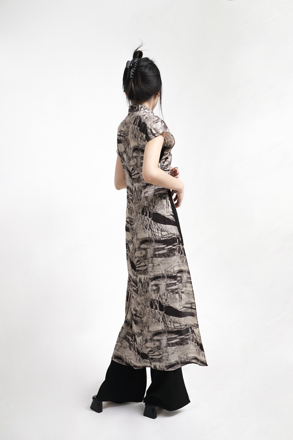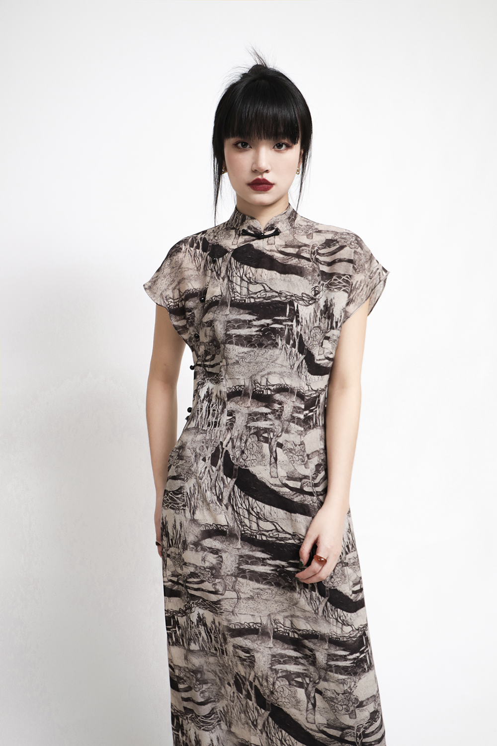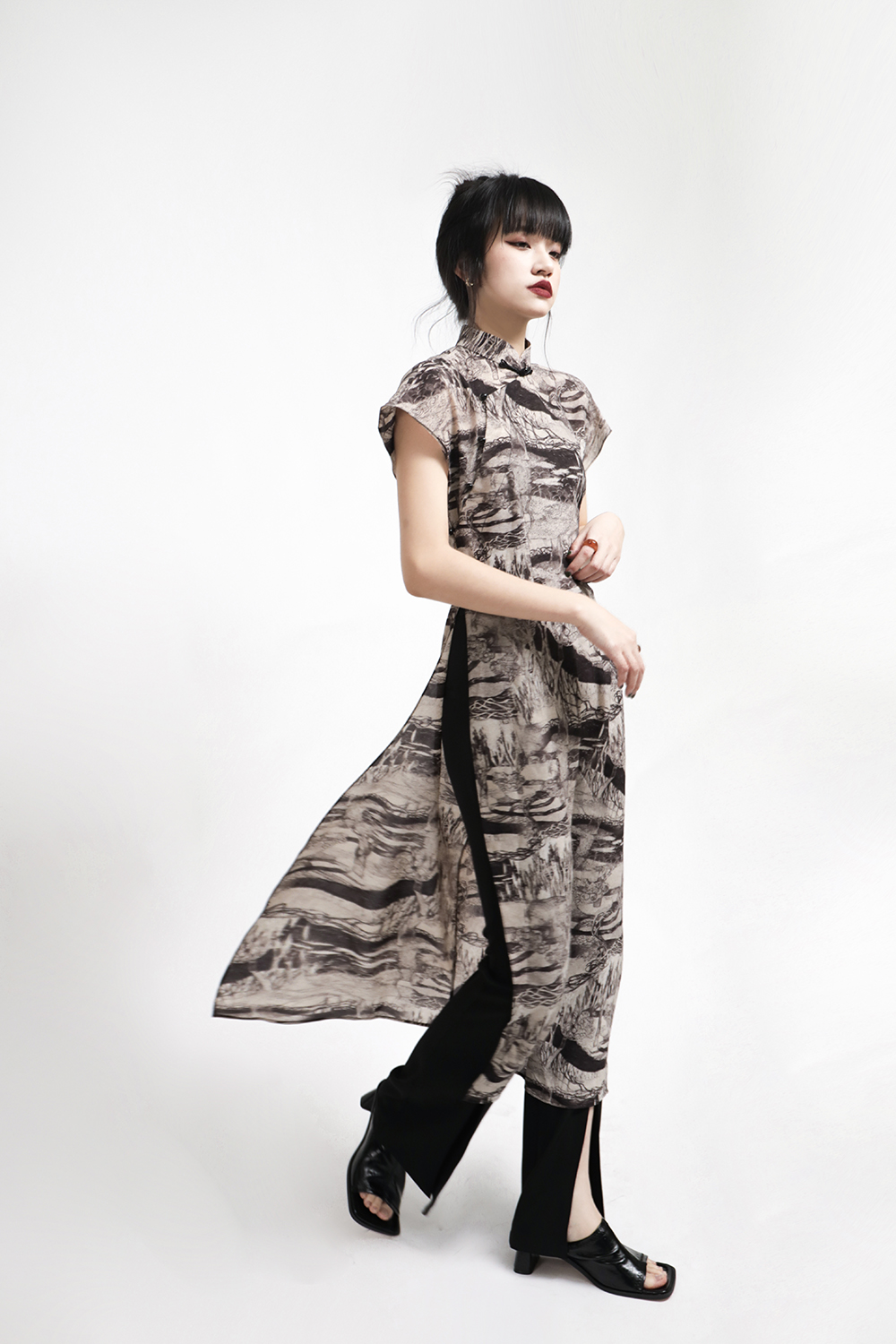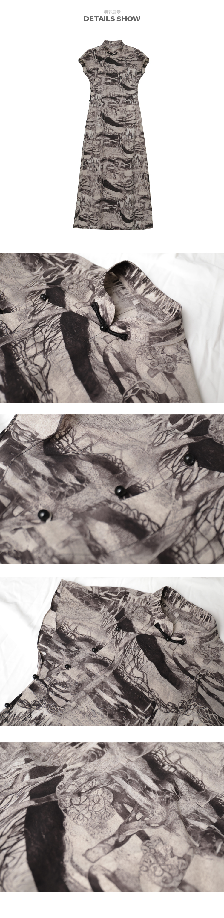 Asaya649- APOZi Ink Mark Series New Chinese style High slit Improved Cheongsam Dress Women s Abstract Printed Retro Long Dress
