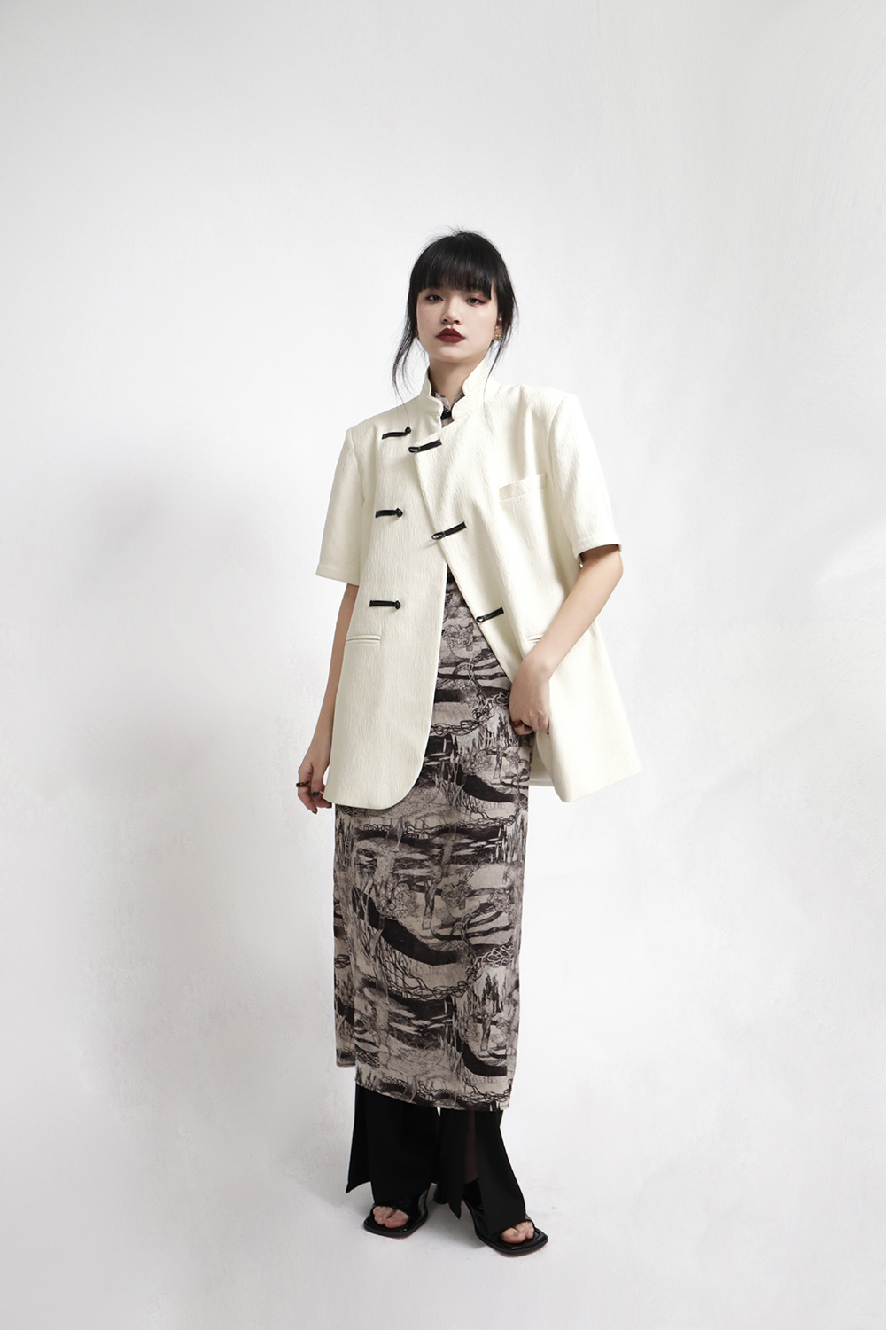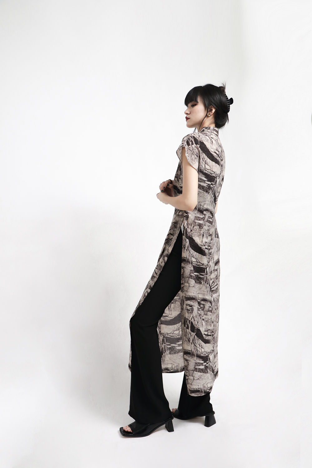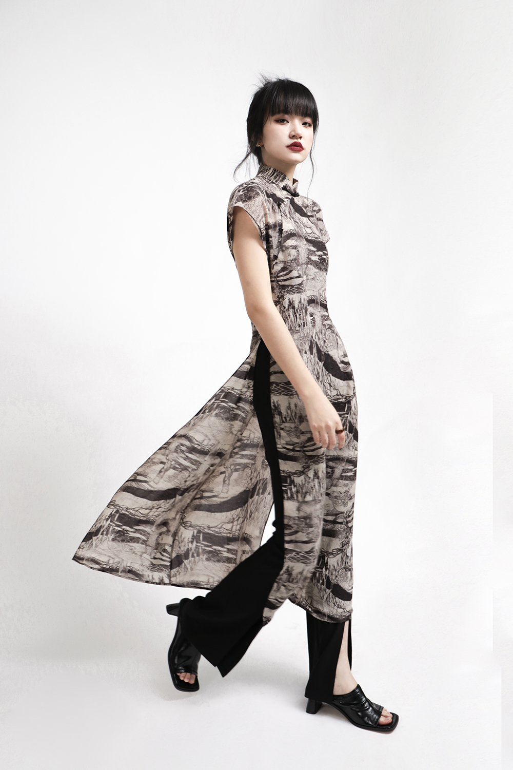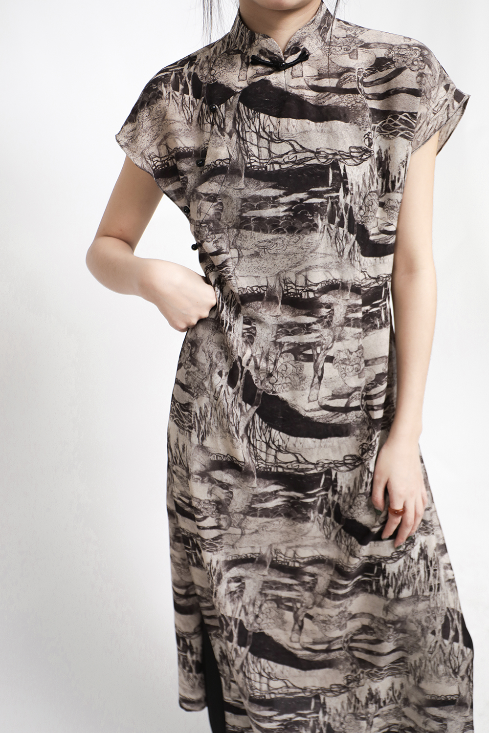 Asaya649- APOZi Ink Mark Series New Chinese style High slit Improved Cheongsam Dress Women s Abstract Printed Retro Long Dress