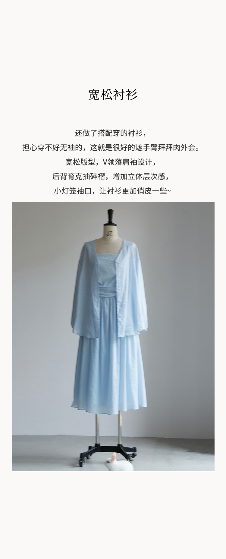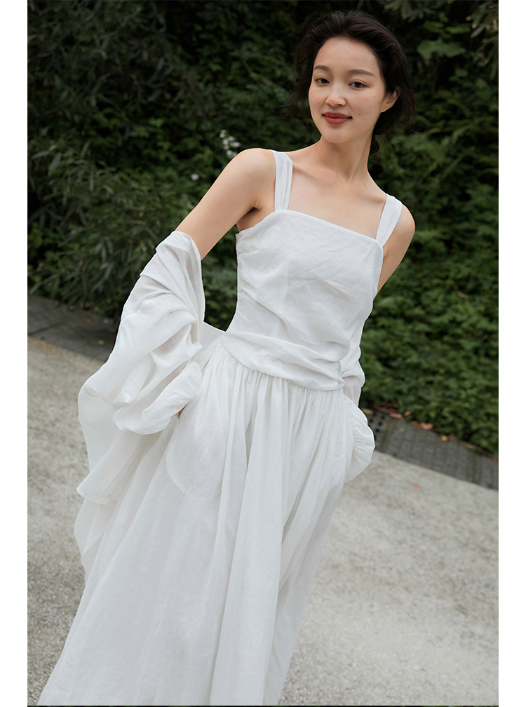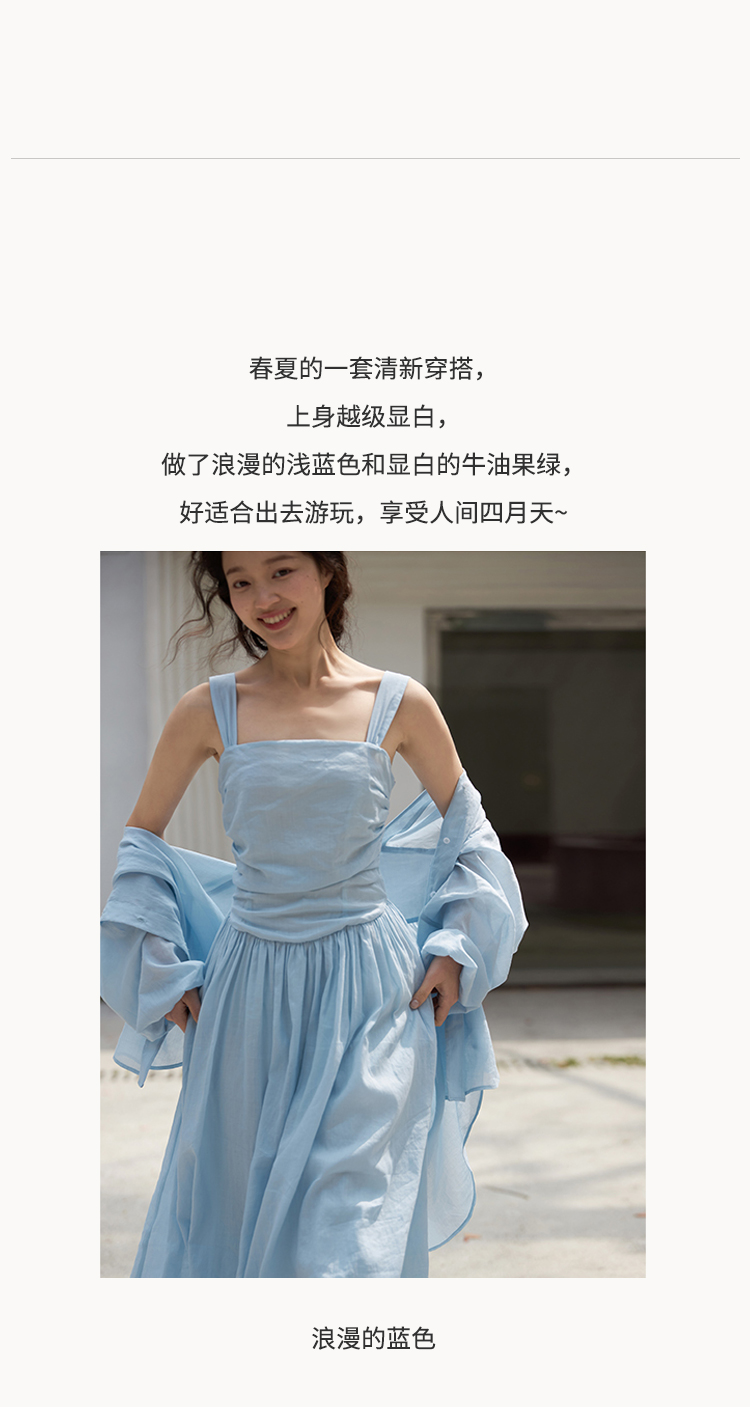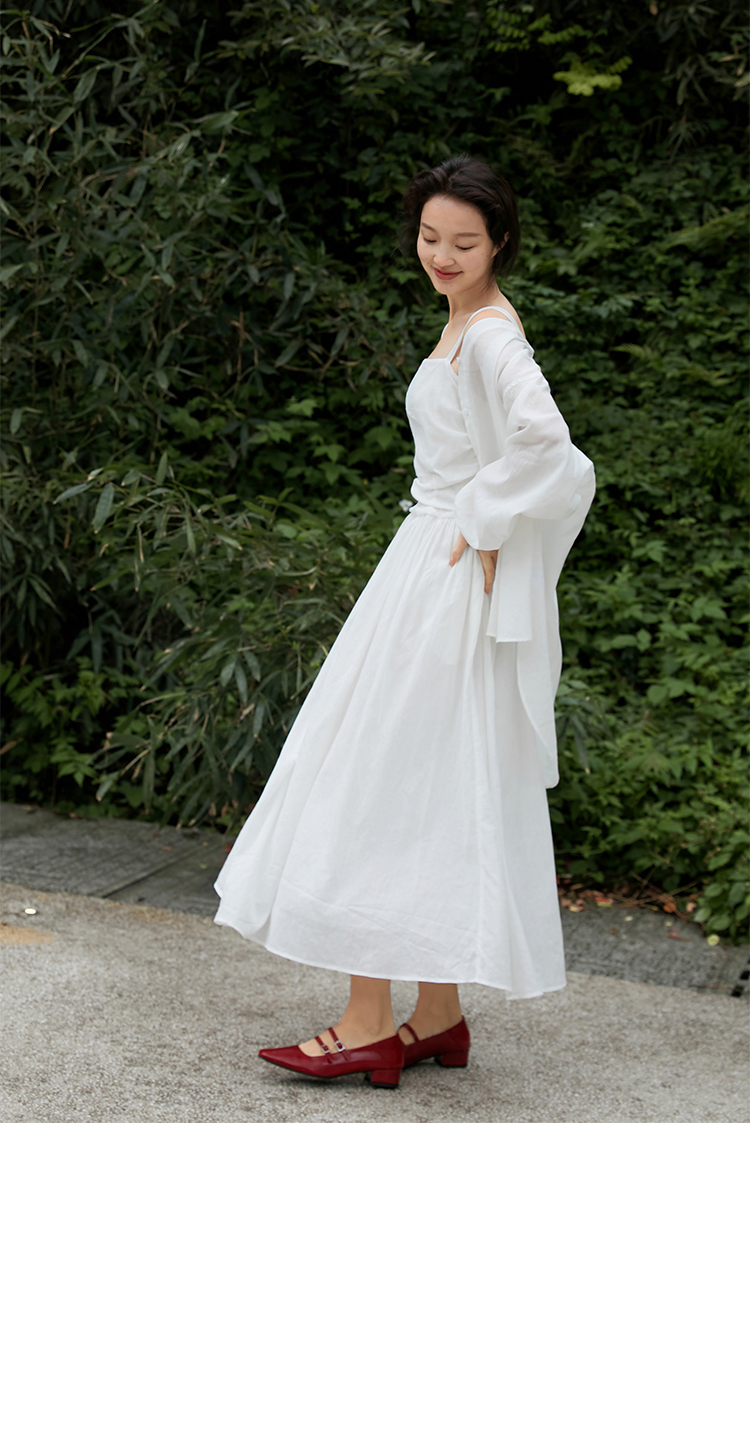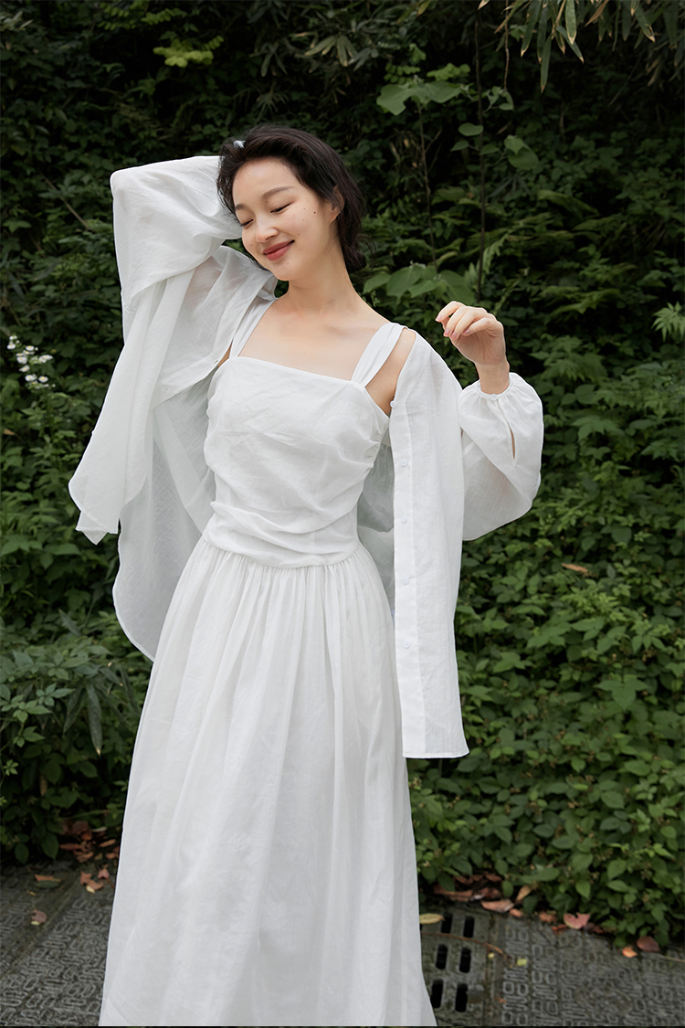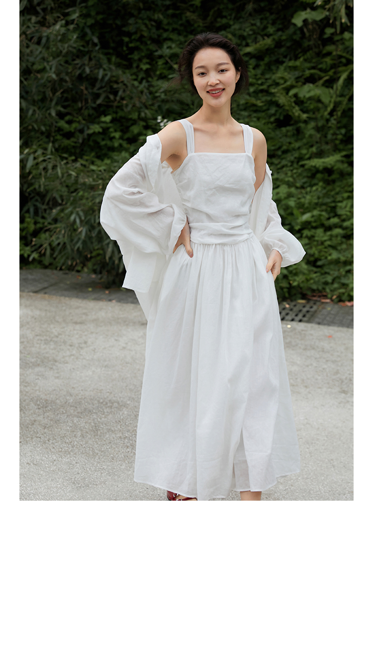 Asaya2154 : April in the world shows white ramie cotton suit retro arc waist line suspender skirt / small lantern sleeve shirt female