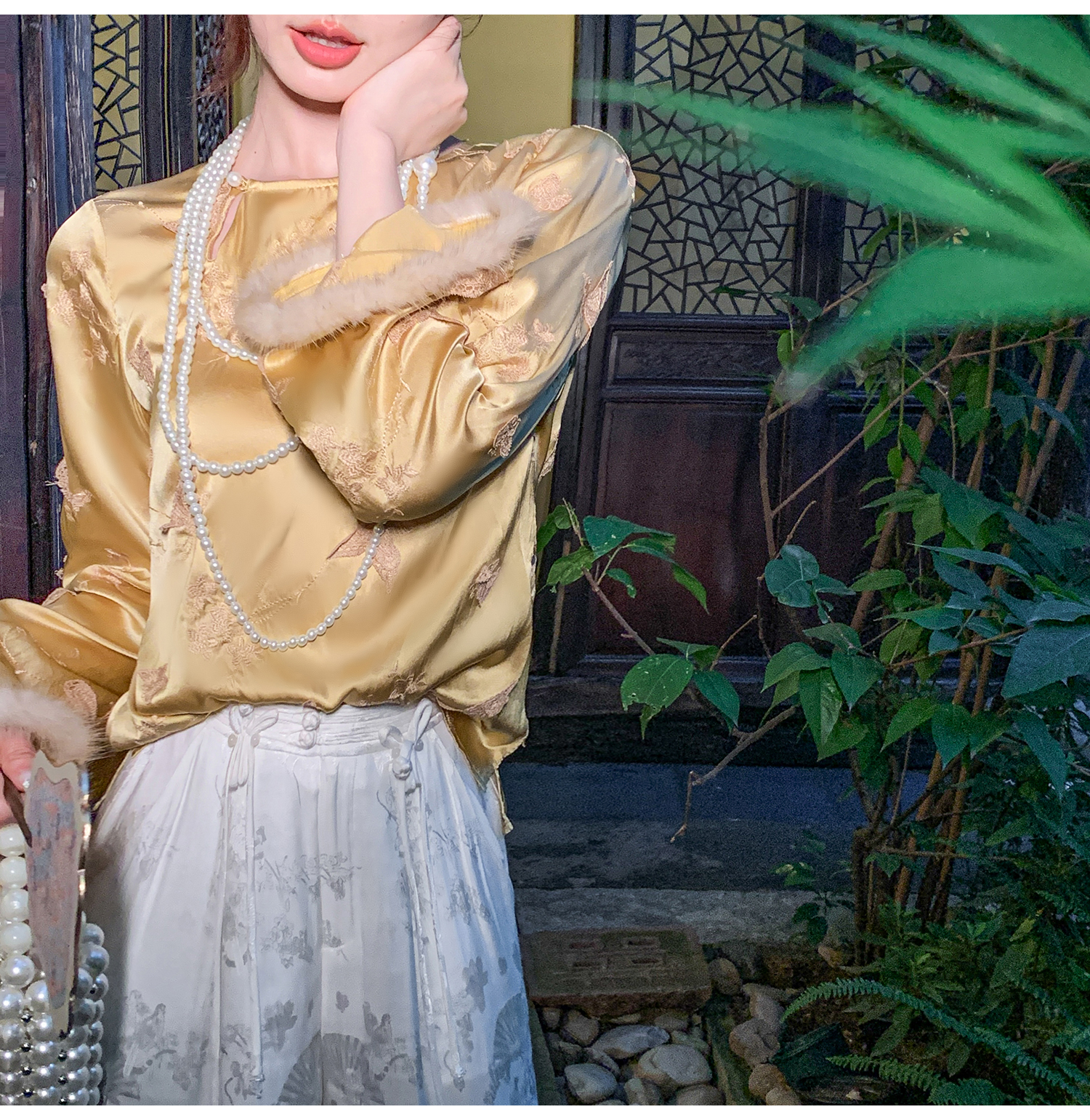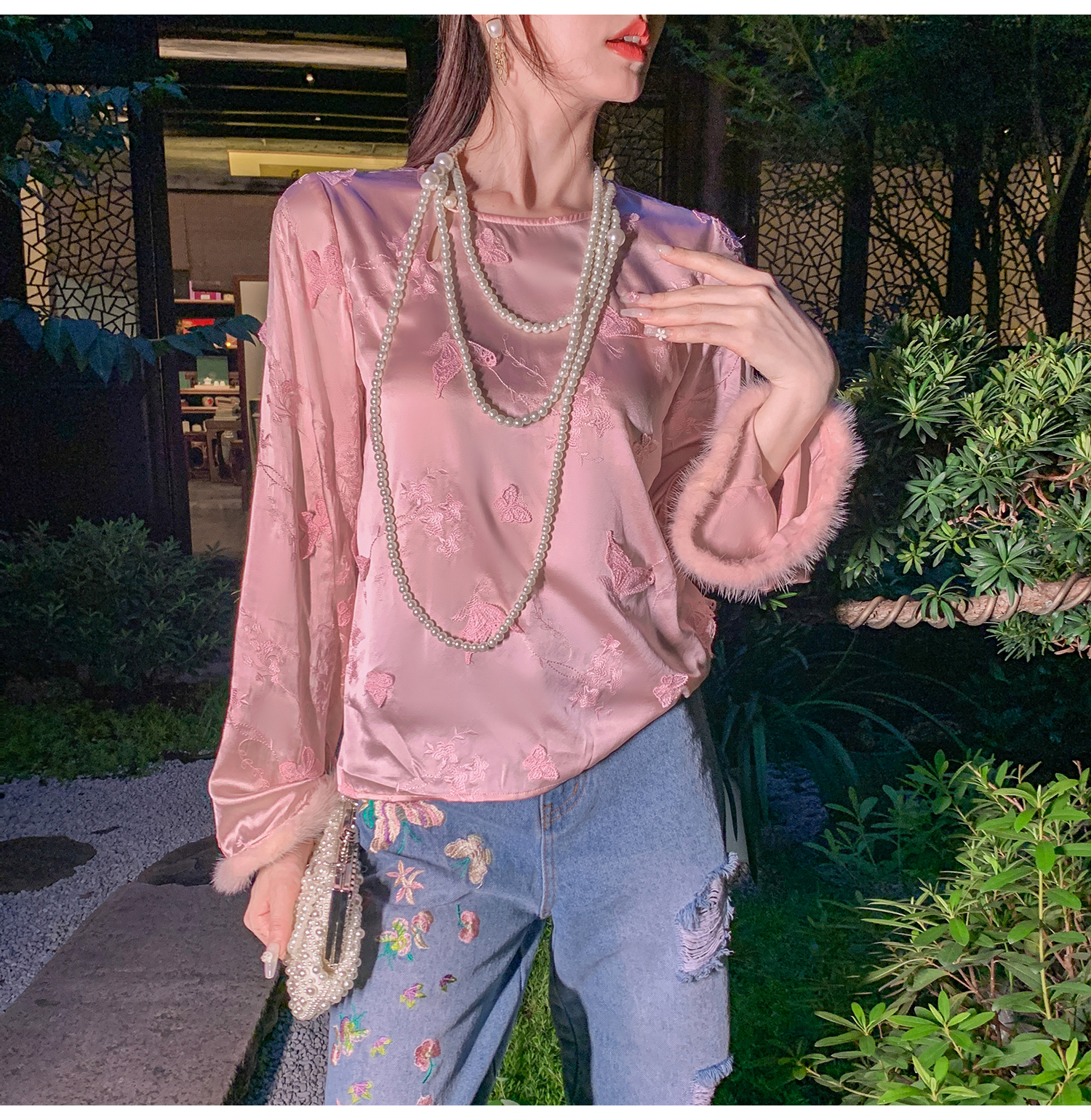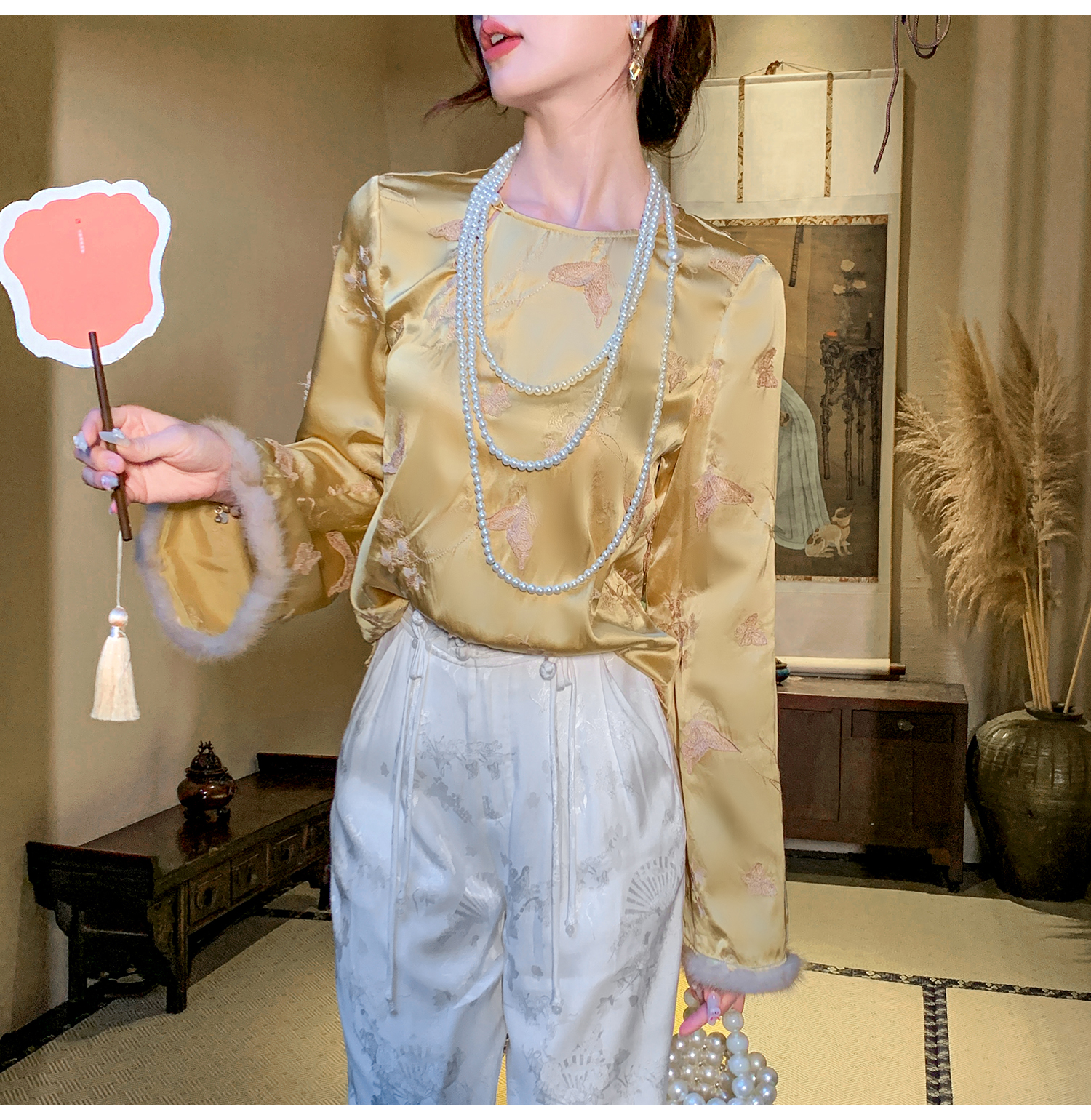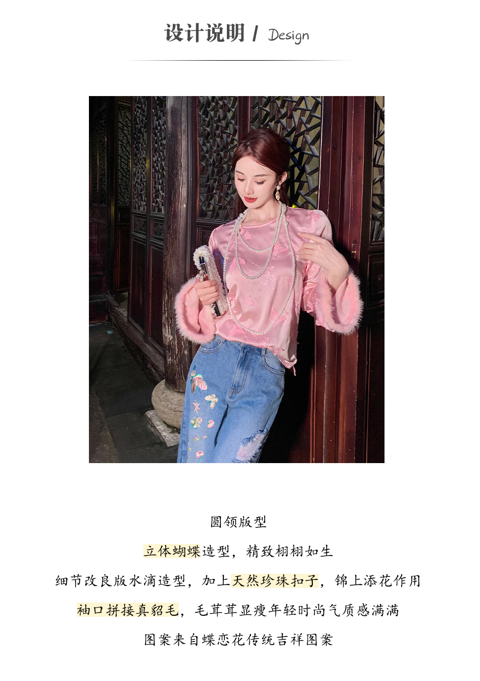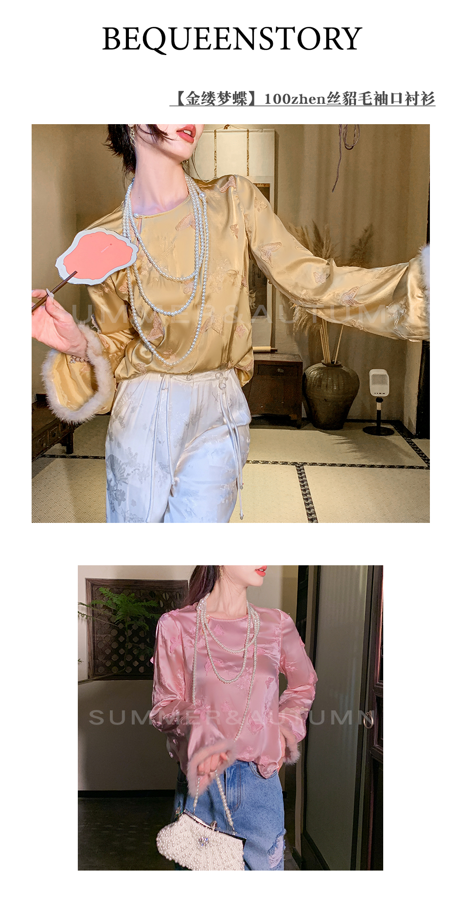 ASAYA2342 Mirror Flower Butterfly] Temperament 100 silk mink fur cuffs splicing slimming shirt