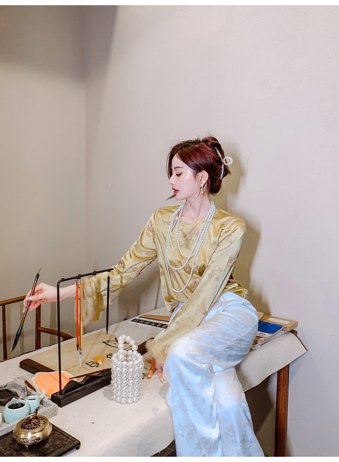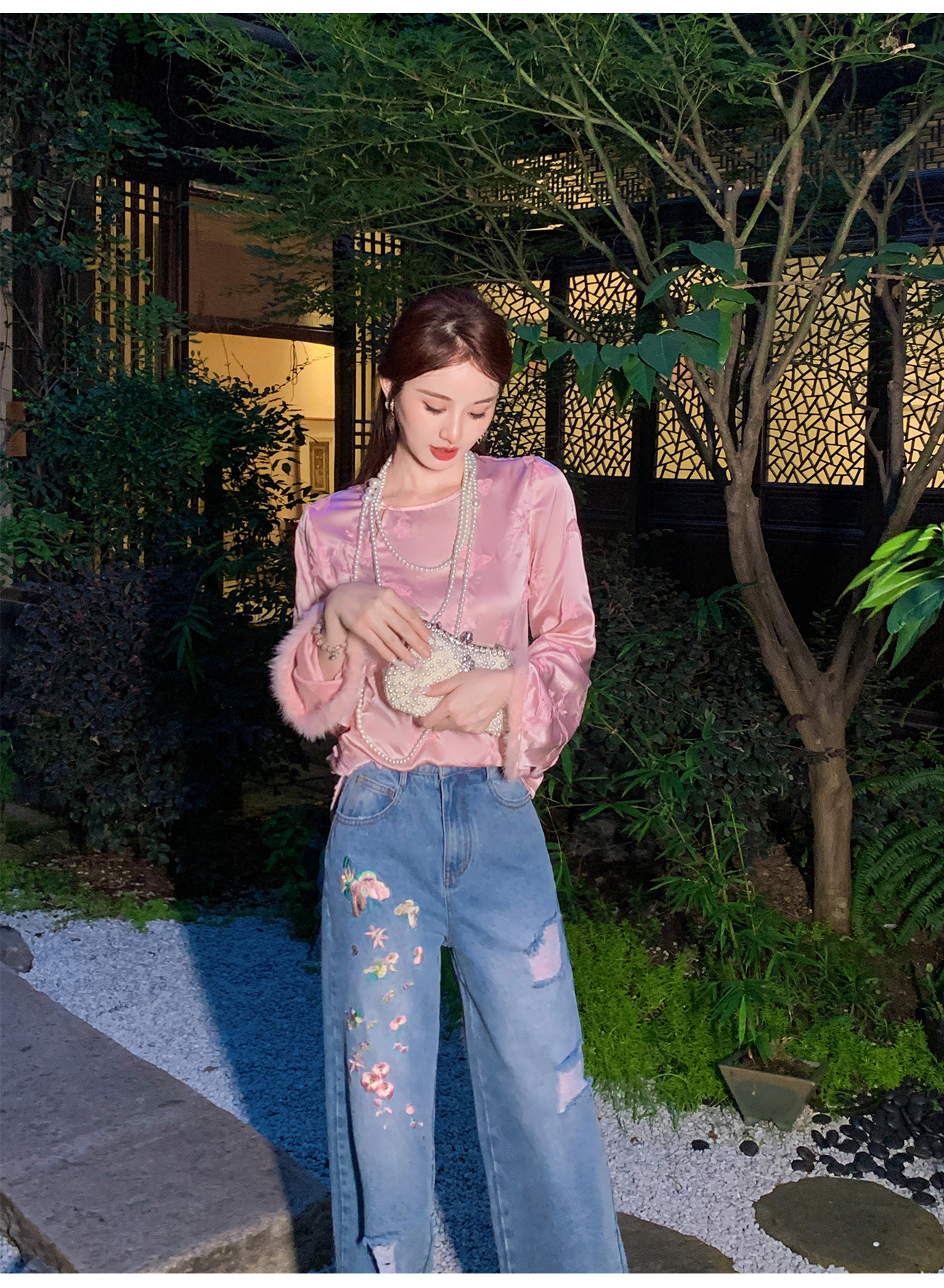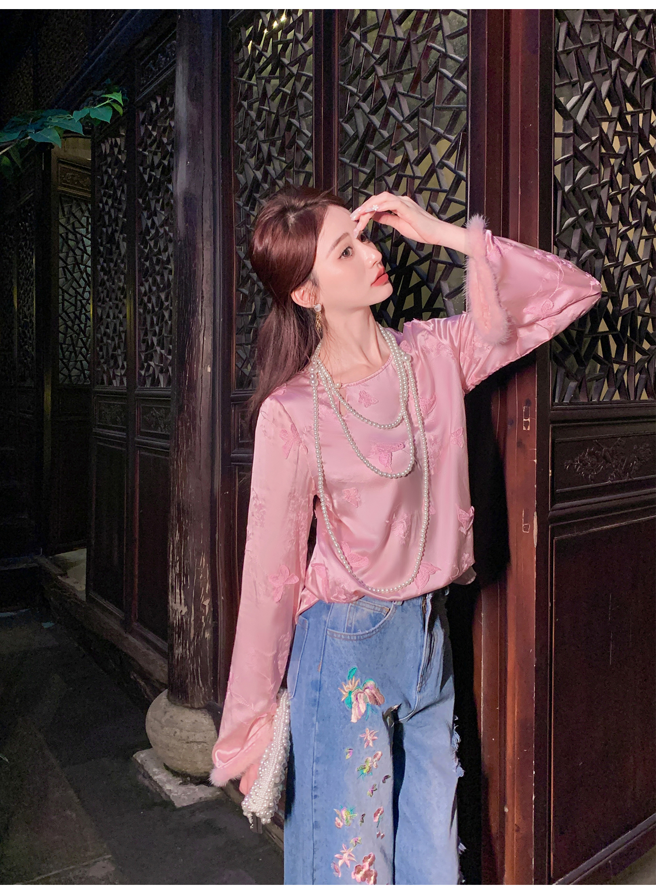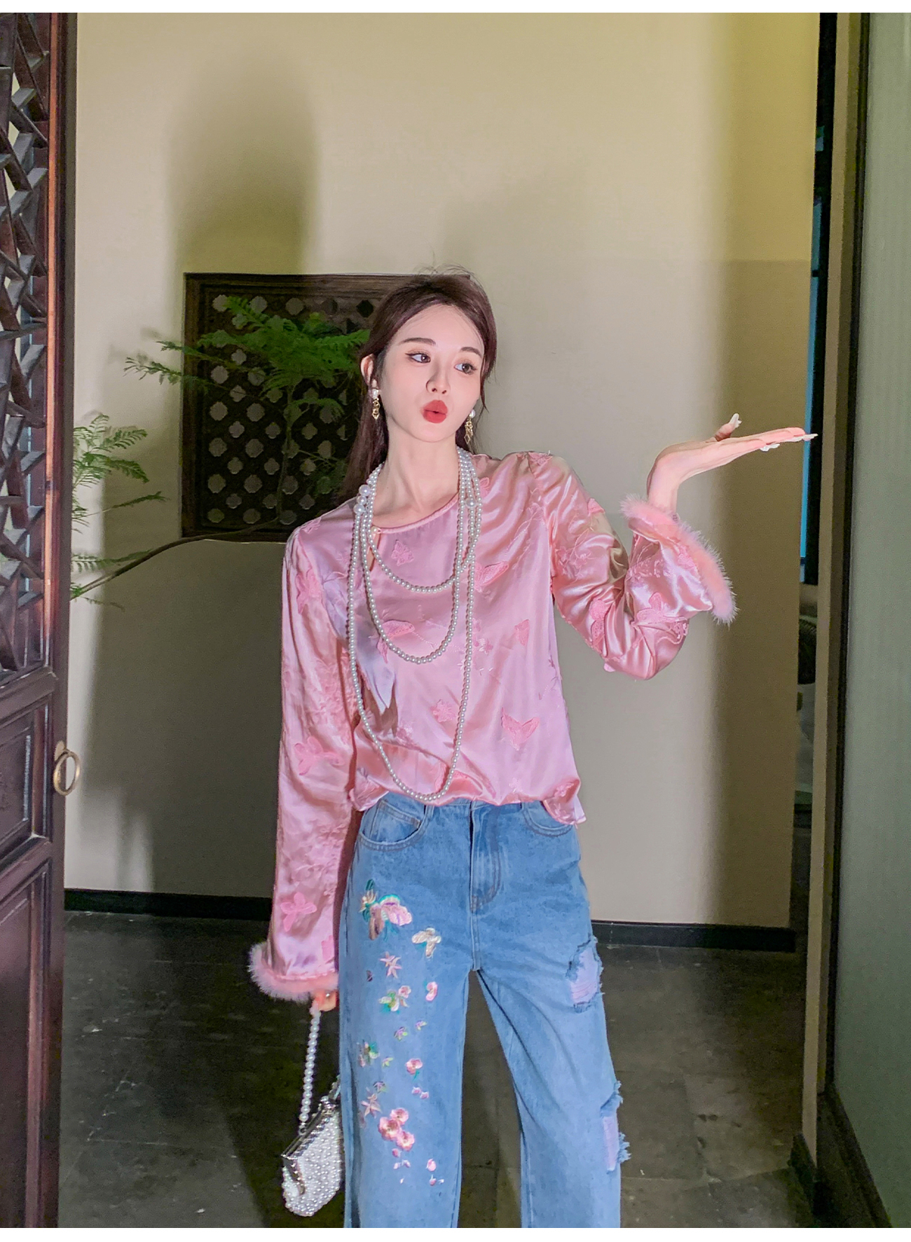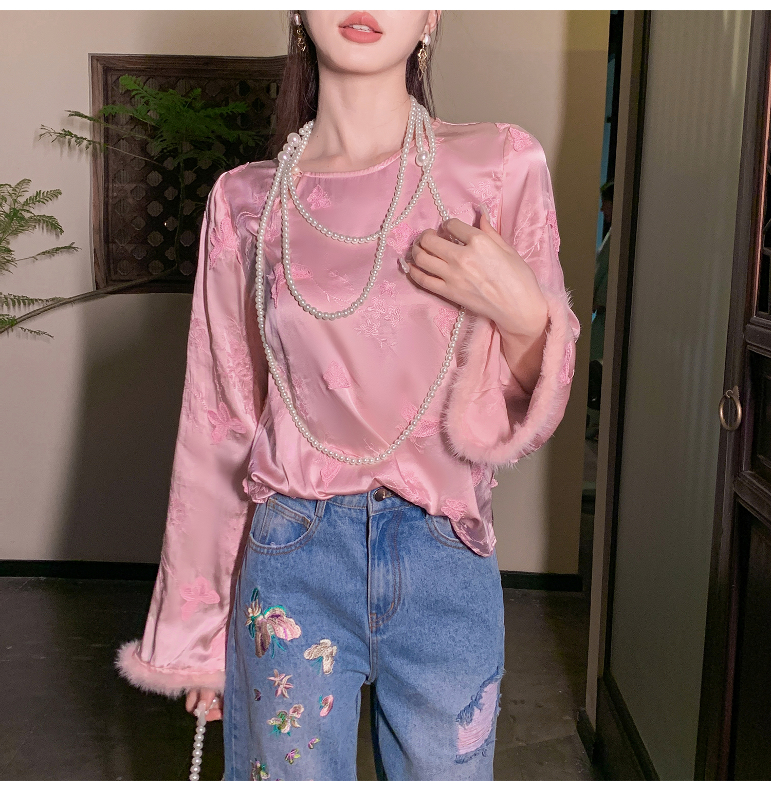 ASAYA2342 Mirror Flower Butterfly] Temperament 100 silk mink fur cuffs splicing slimming shirt