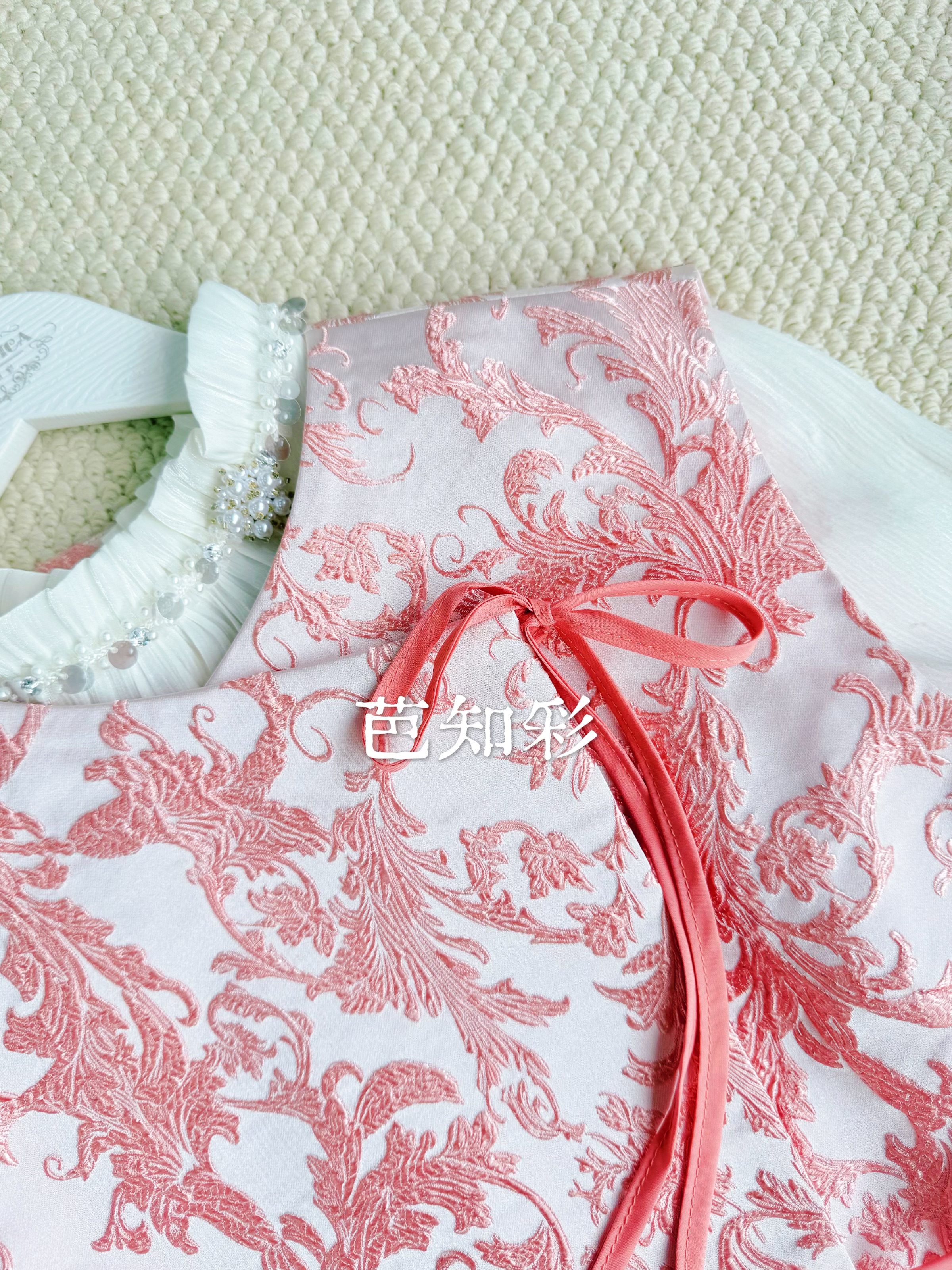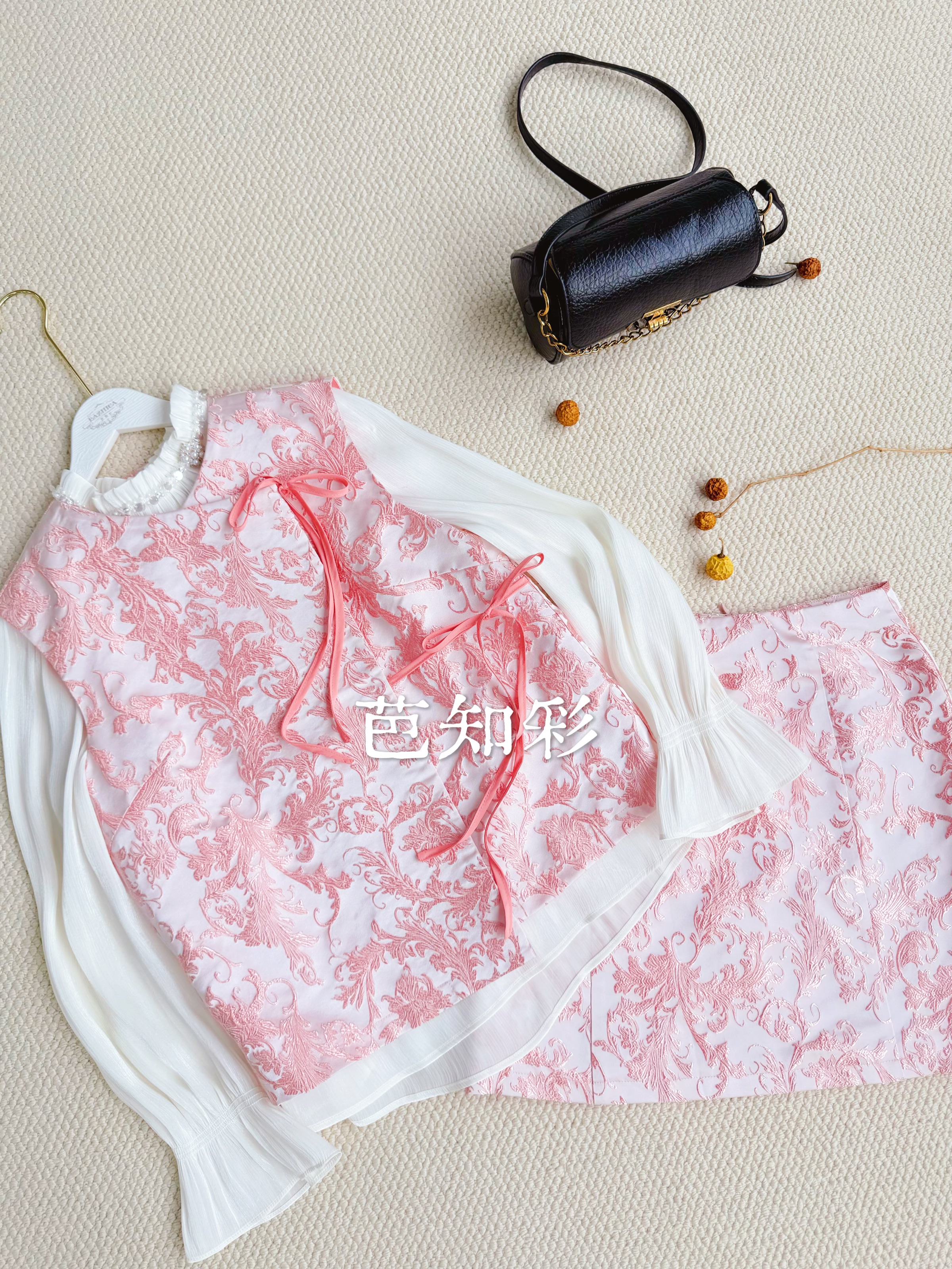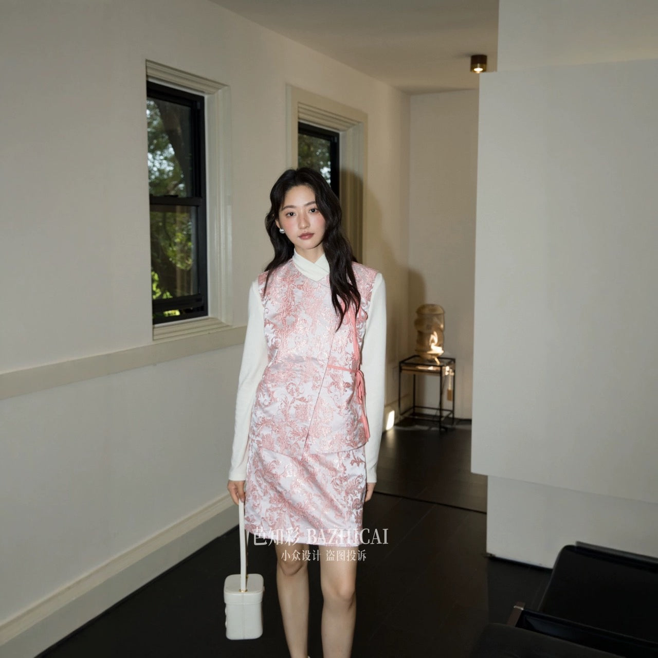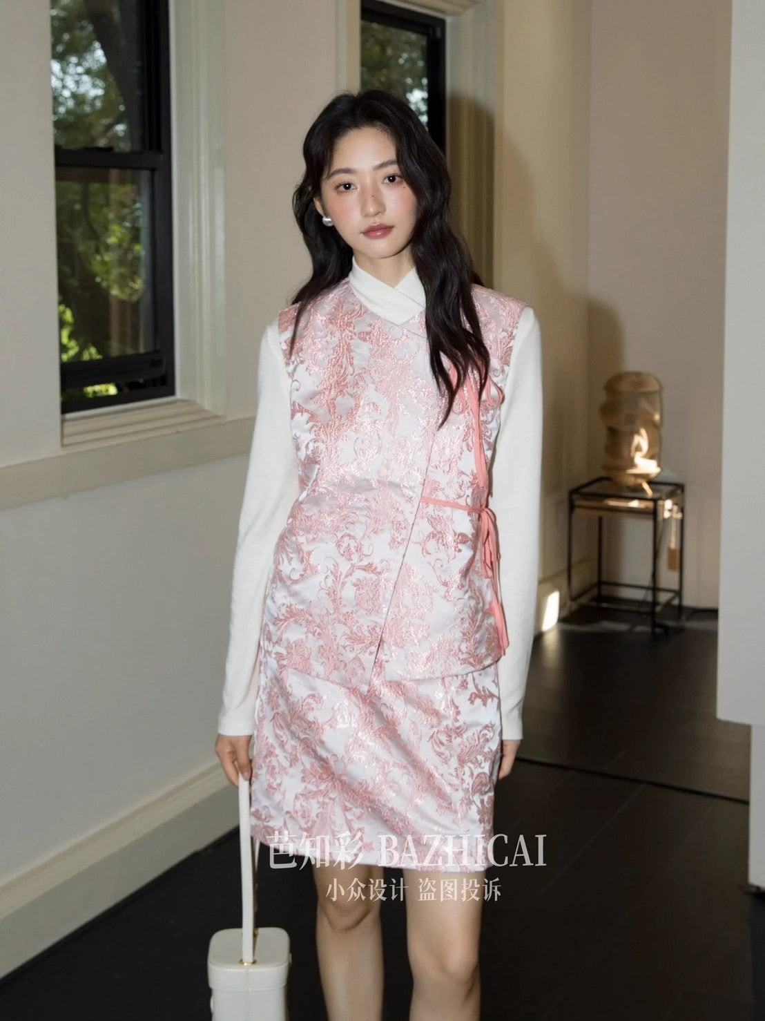 重工提花缎面马甲 以百W织机雕琢浪漫,绑带摇曳间皆是贵气,当柔粉提花与缎面光泽相遇,便是一场复古与轻奢的共舞. |