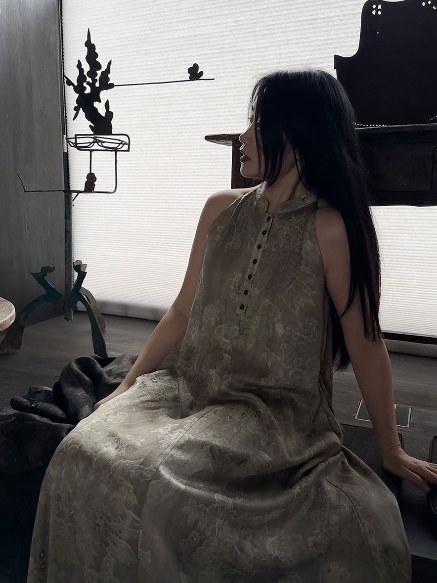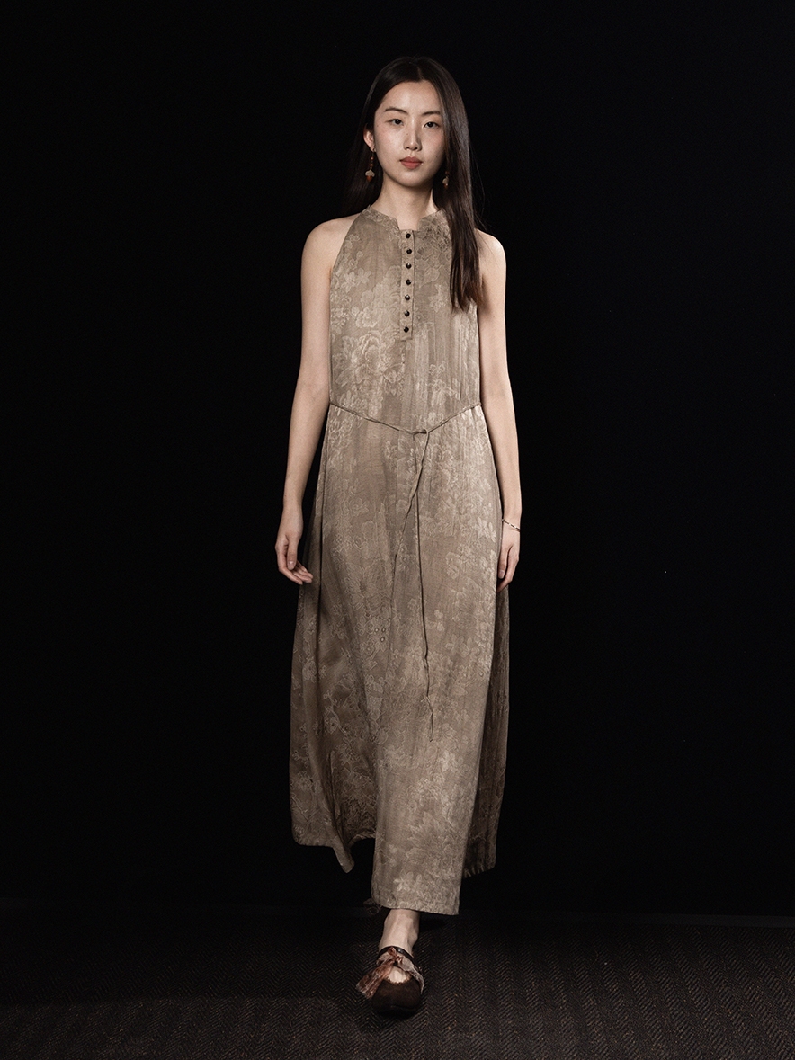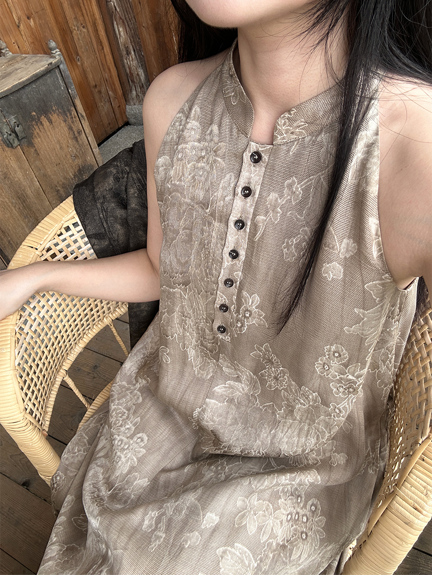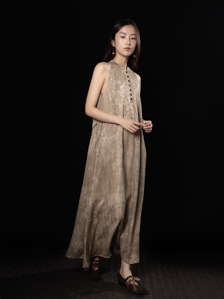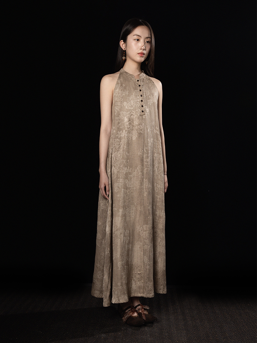 ASAYA3343 Wabi-sabi style new Chinese style stand-up collar jacquard linen off-shoulder dress