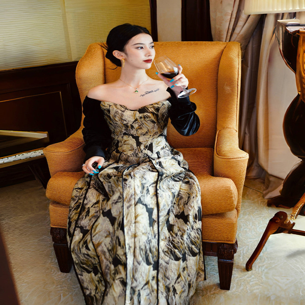 ASAYA3694 [Obsidian Jinhong] New Chinese style black and gold diamond velvet flower two-wear coat dress