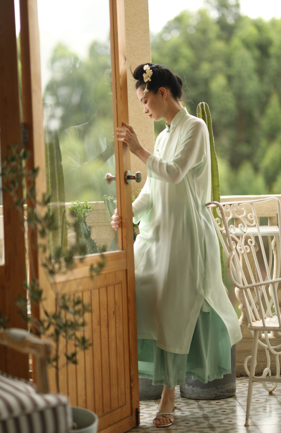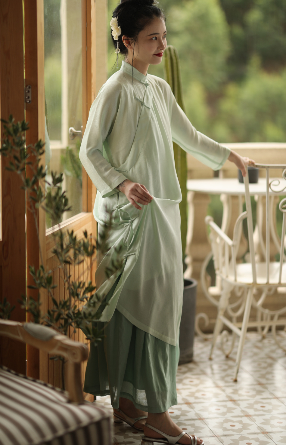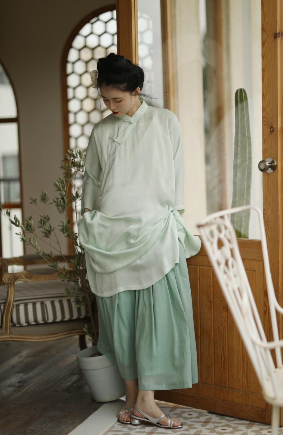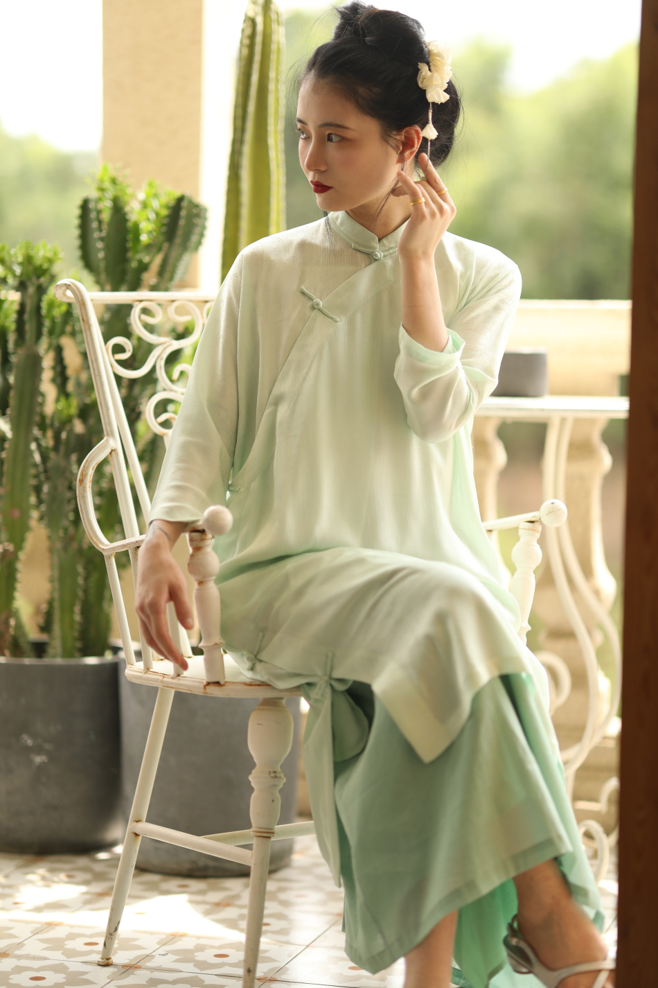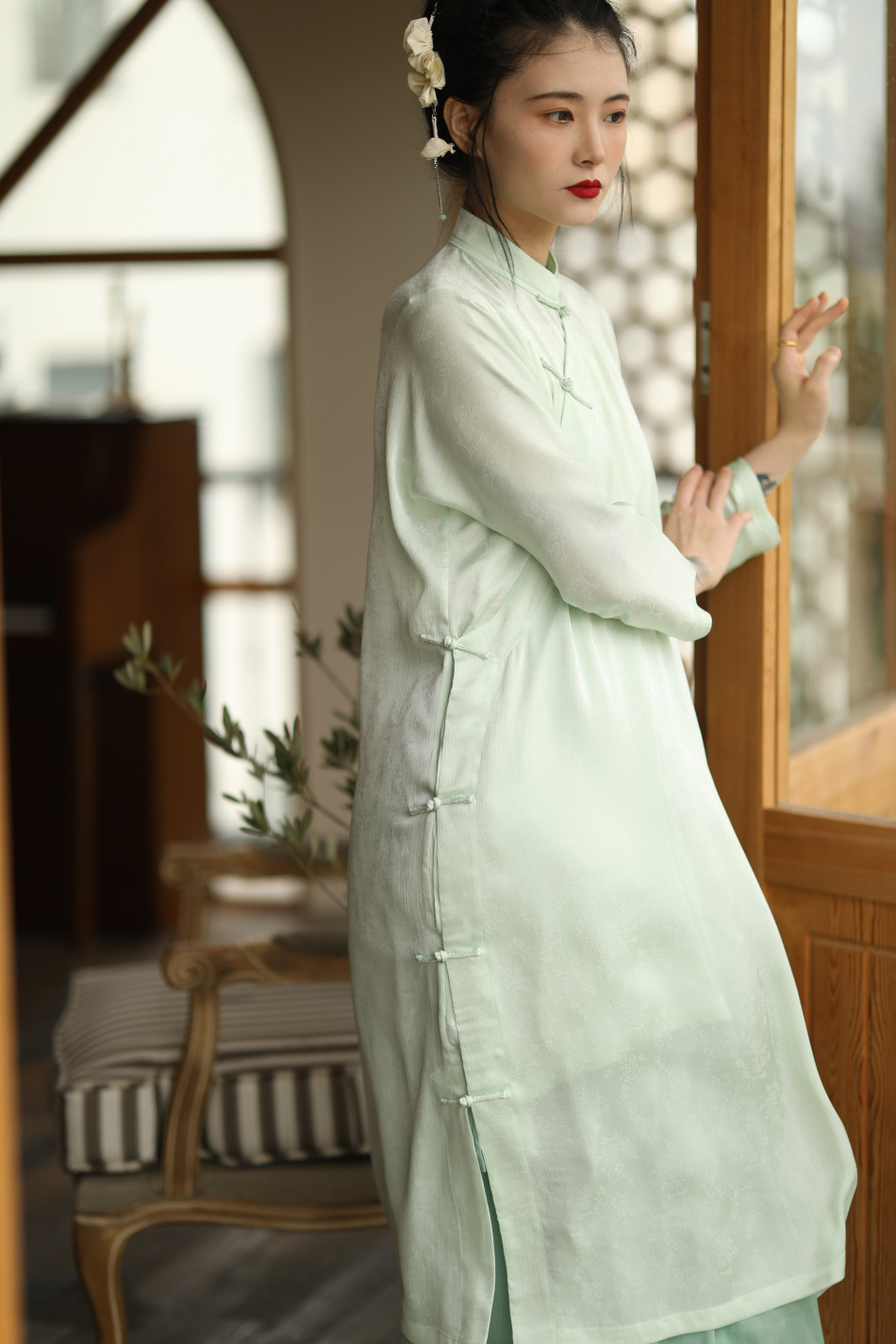 ASAYA1857 The ninth cloud "Flower Shadow Green Rose" green version dark pattern jacquard delicately hand-inverted large-sleeved cheongsam