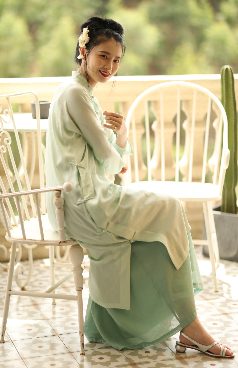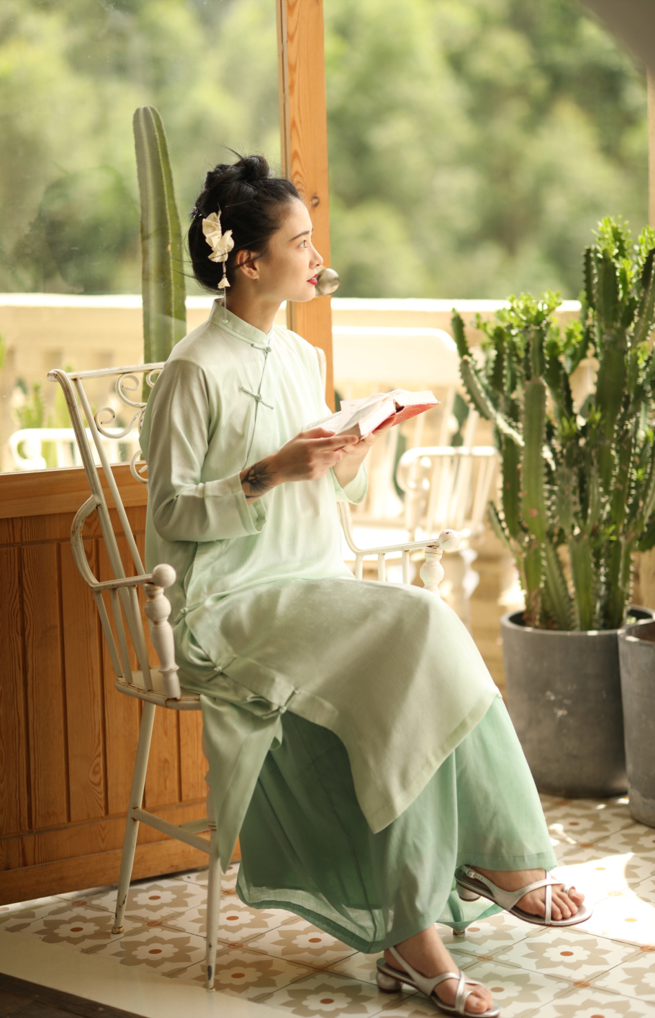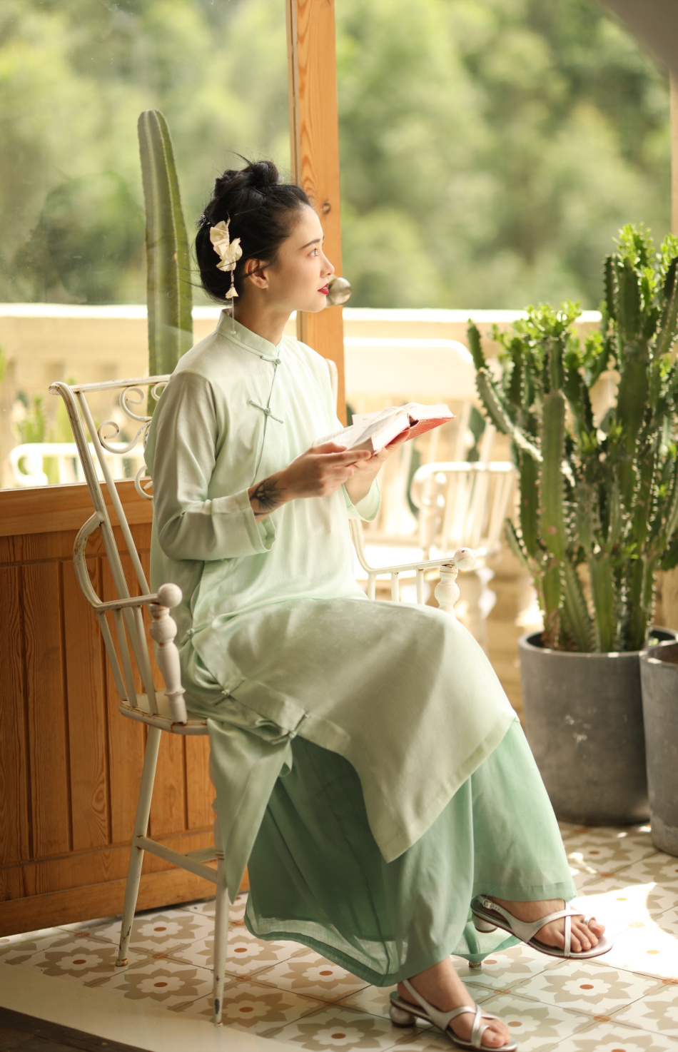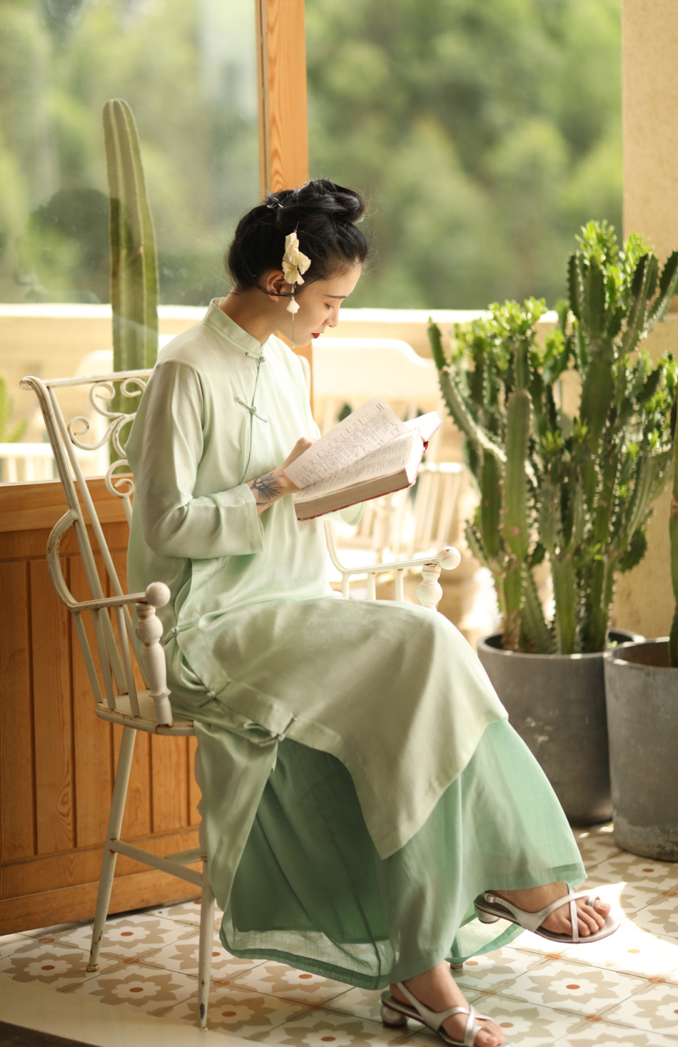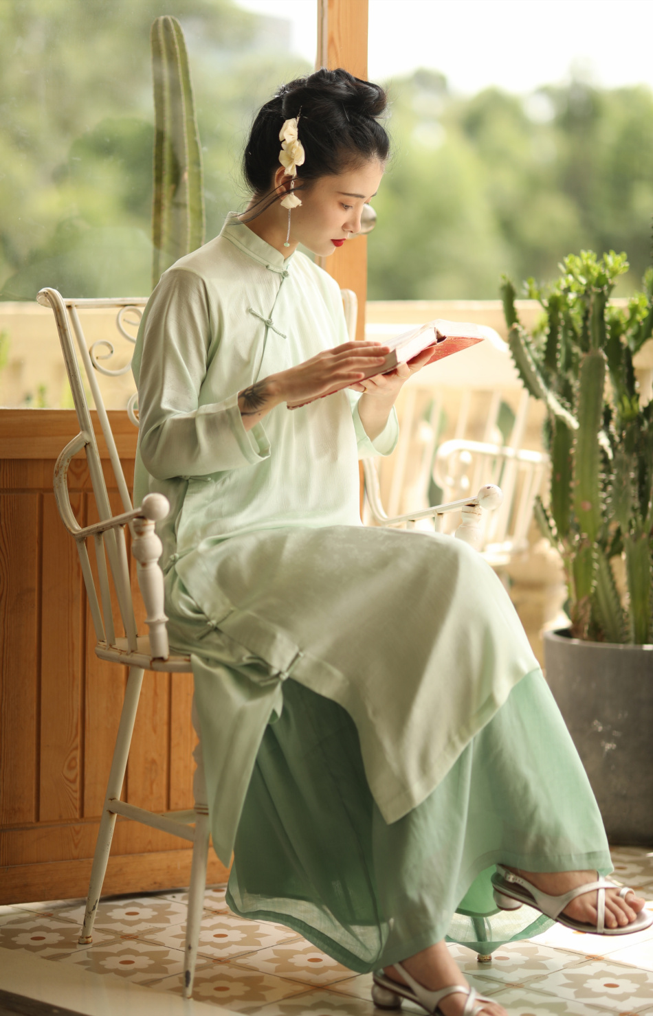 ASAYA1857 The ninth cloud "Flower Shadow Green Rose" green version dark pattern jacquard delicately hand-inverted large-sleeved cheongsam