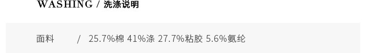 Material composition | Polyethylene terephthalate (polyester) 41% viscose fiber (viscose) 27.7% cotton 25.7% polyurethane elastic fiber (spandex) 5.6% |