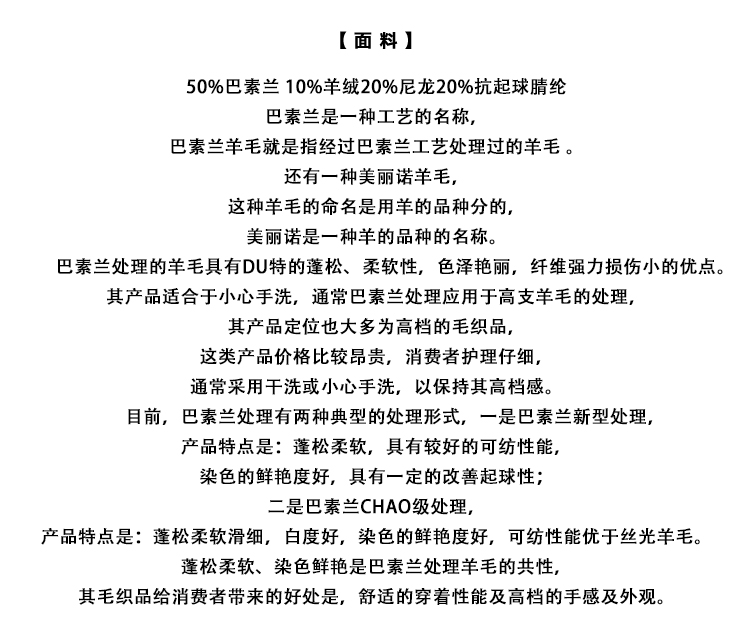 Material composition | Wool 50% polyacrylonitrile fiber (acrylic) 20% cashmere (cashmere) 10% other 20% |