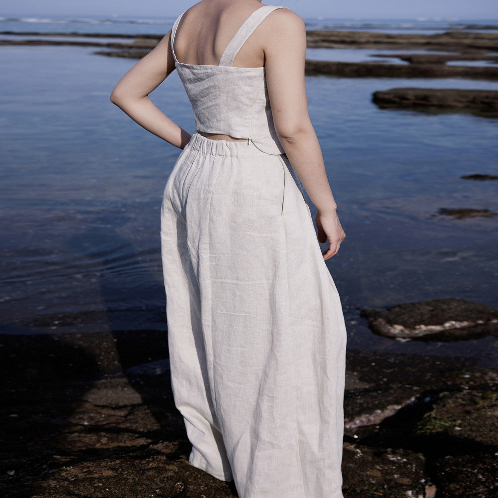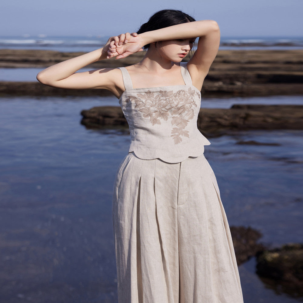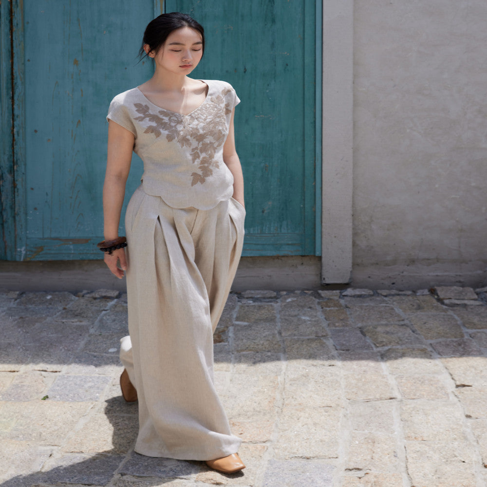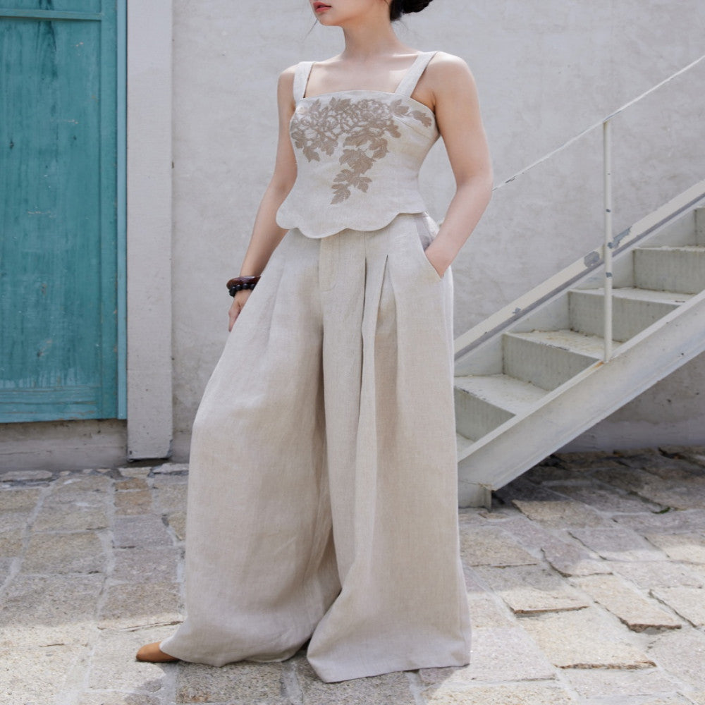 ASAYA3665 Designer hand-painted peony flowers | Heavy yarn-dyed linen | Slim-fit vest, short sleeves and wide-leg pants