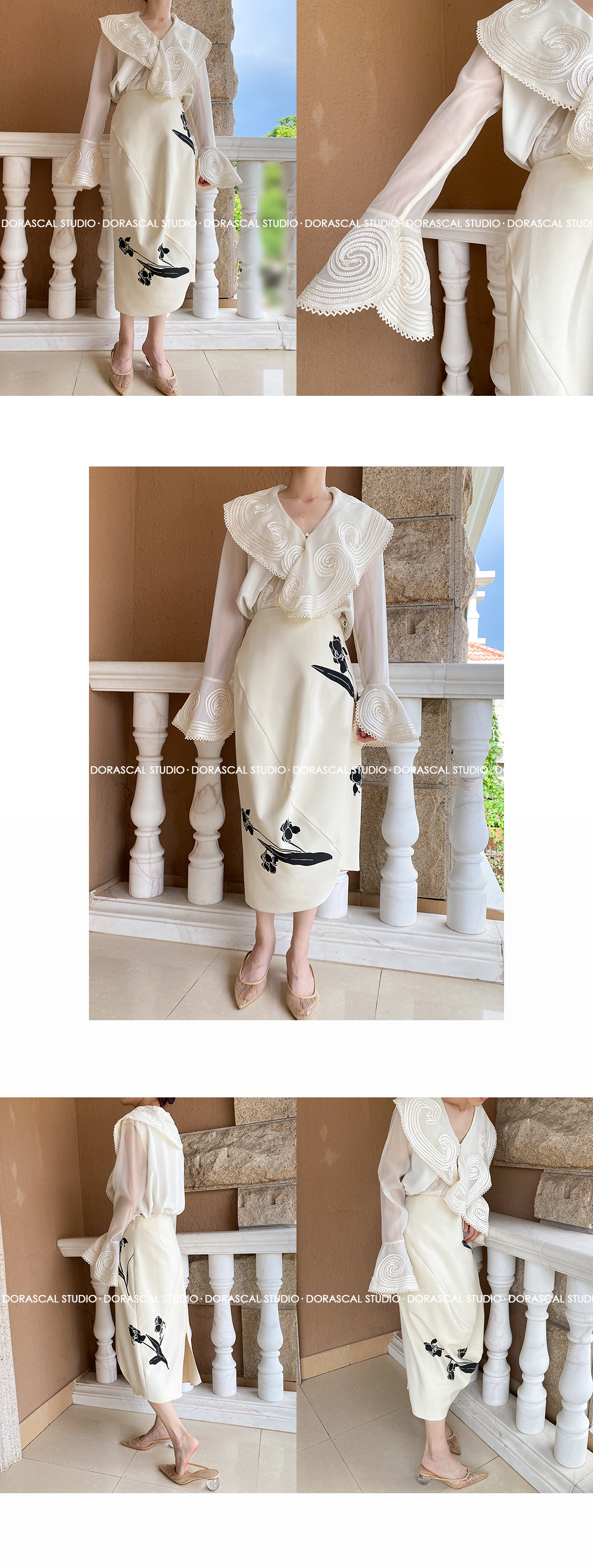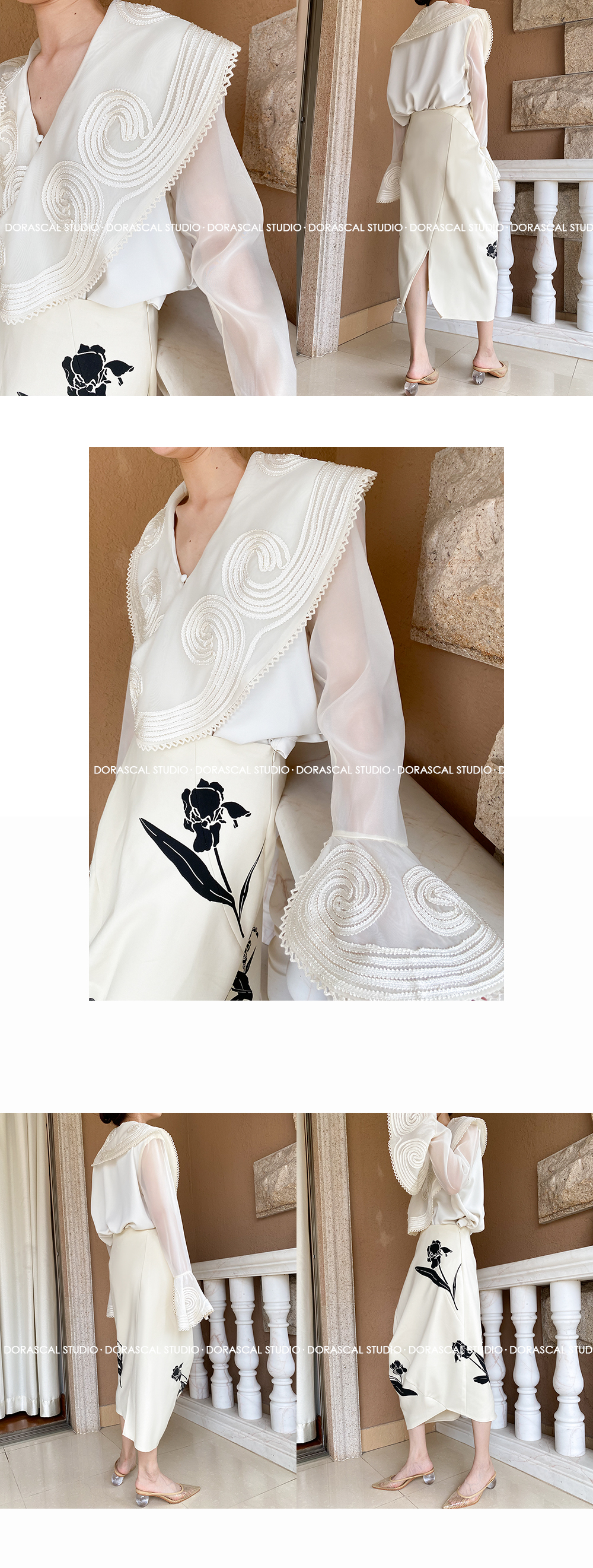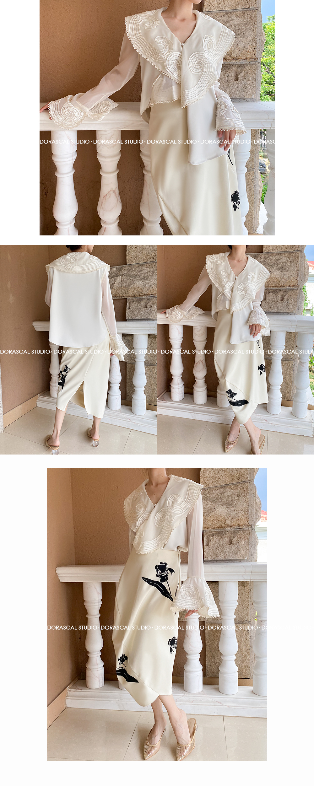 Asaya0393 - Design Elegant Large Collar Lace Jacquard Transparent Splicing Lace Chiffon Shirt Shirt
