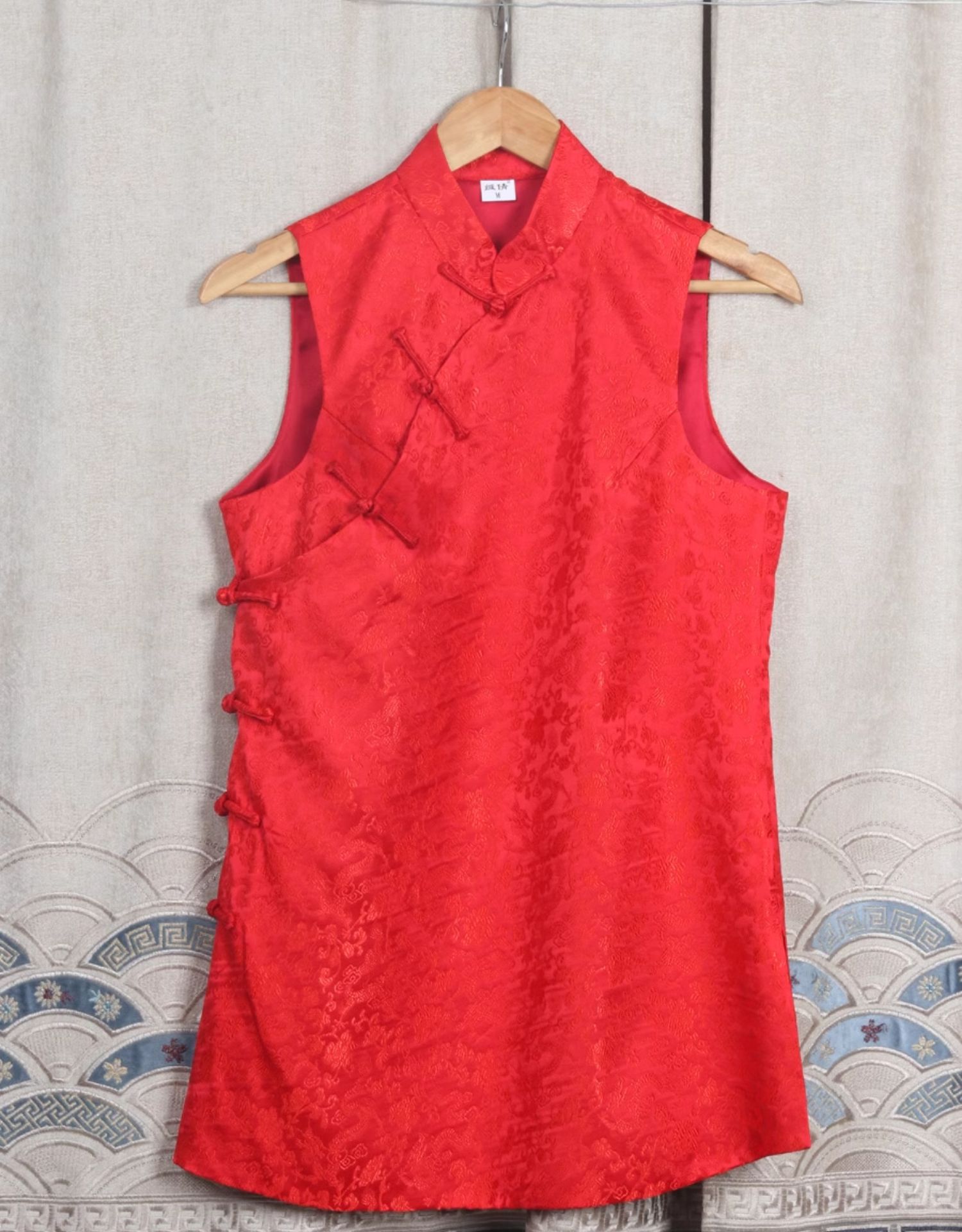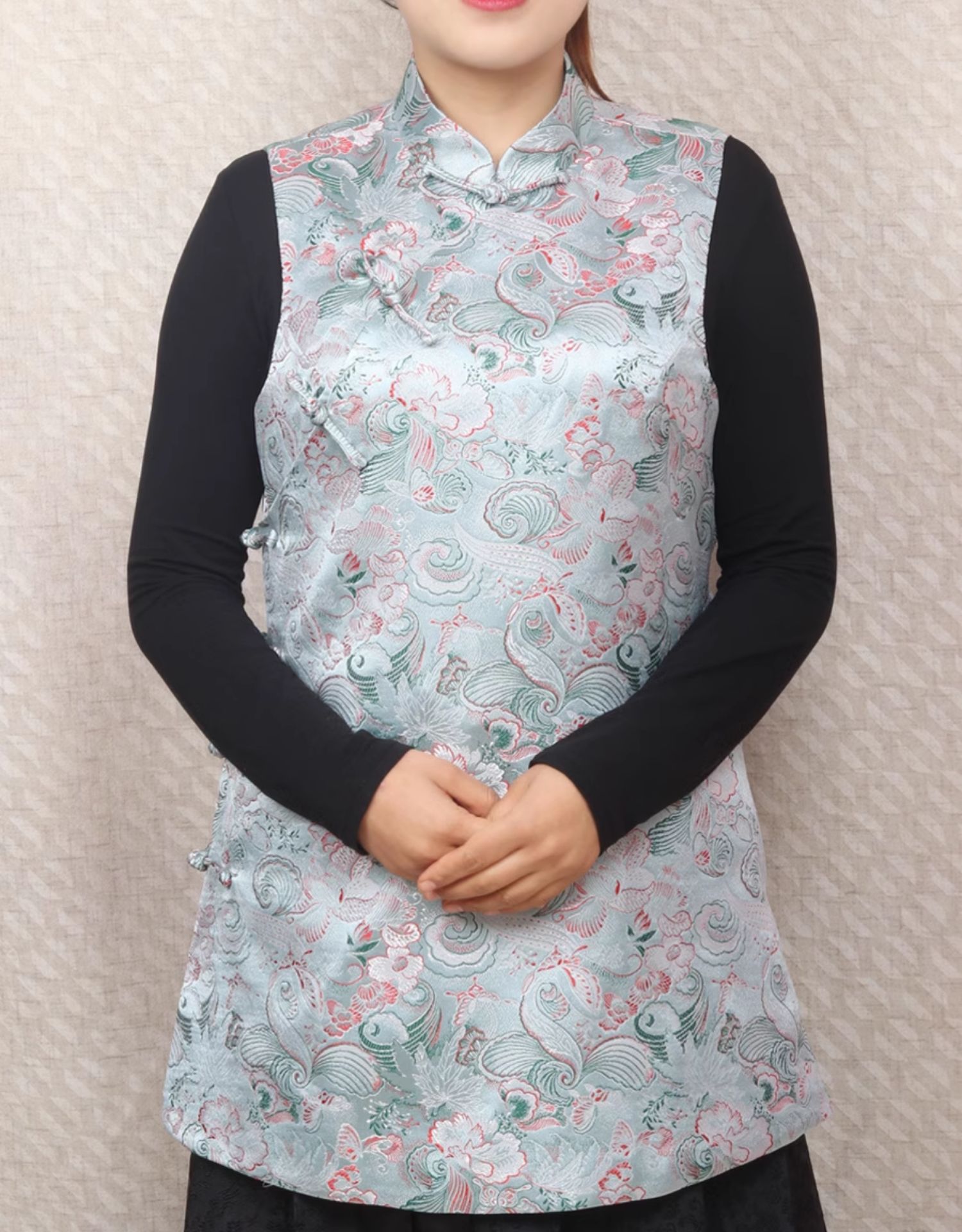 Asaya0443 - Early Spring and Autumn ethnic style Chinese style buckle stand up collar sleeveless mid long style half breasted vest top women s woven brocade forging
