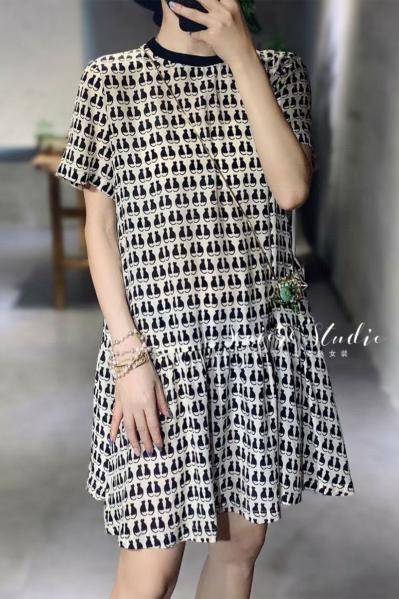 欧货100桑蚕丝猫咪印花连衣裙女韩版宽松显瘦减龄a字娃娃裙2022夏