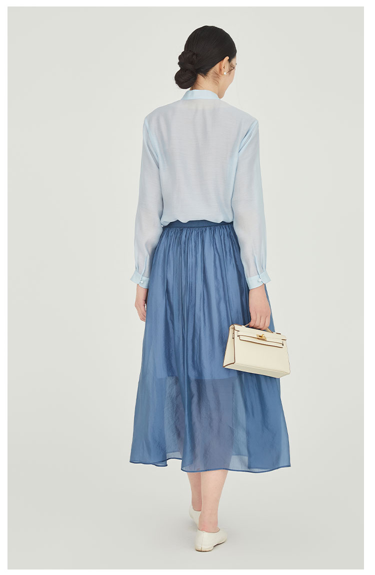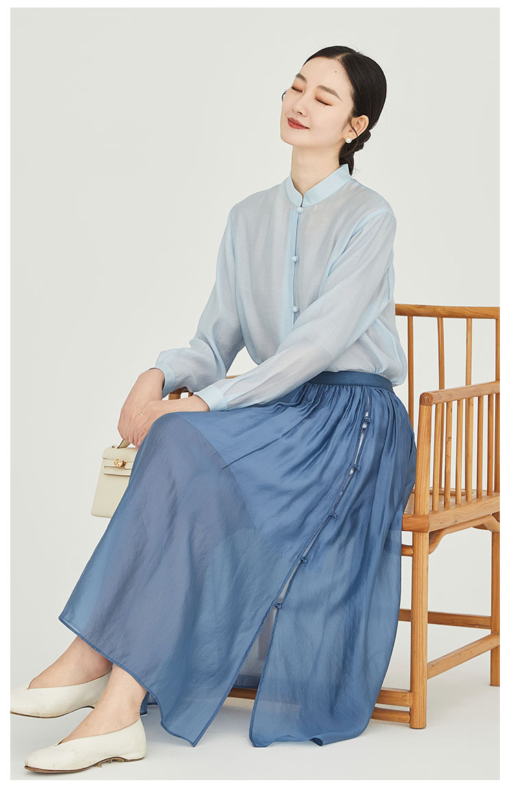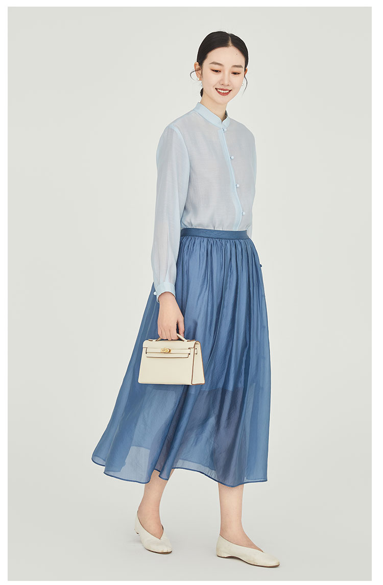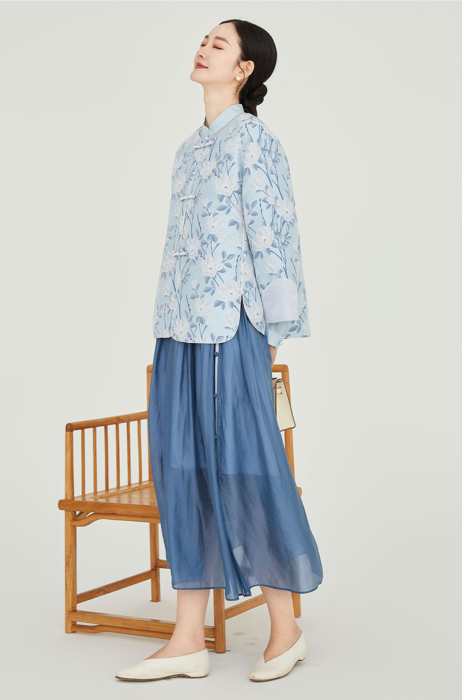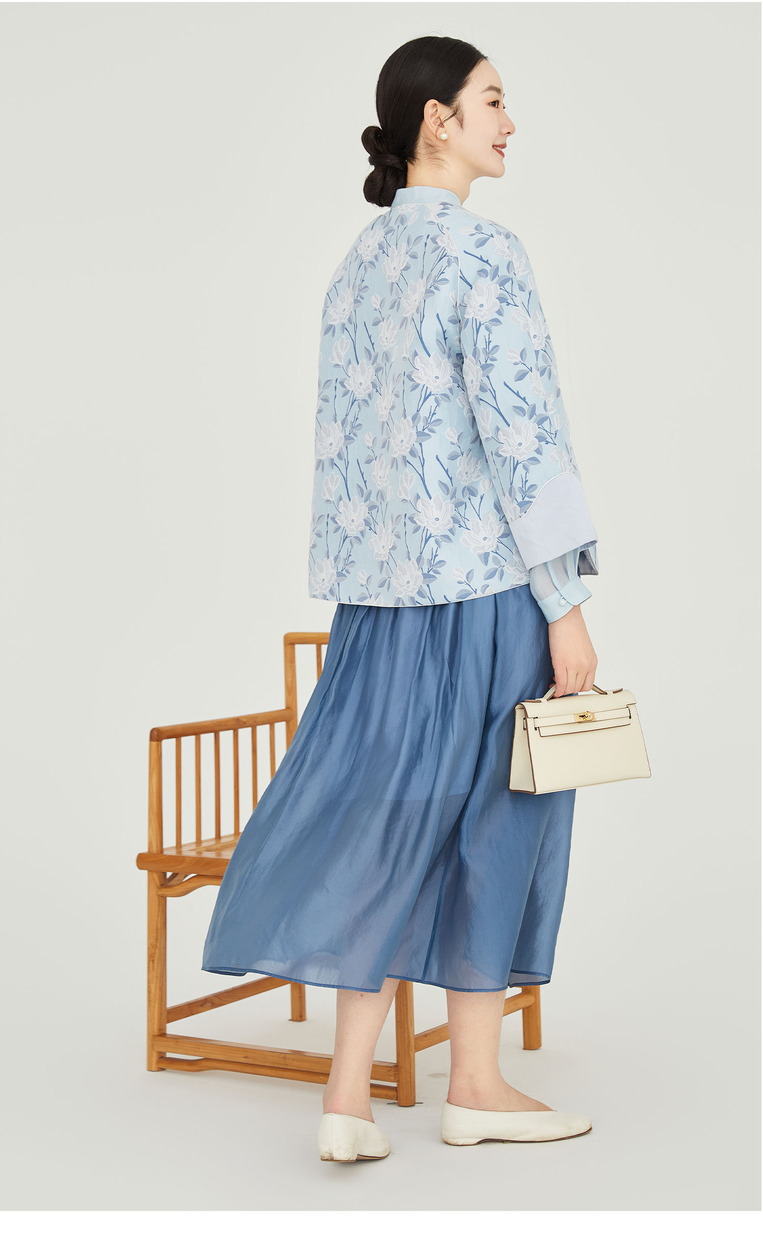 color classification | Light blue (jacket), light blue (shirt), dark blue (skirt), light green (jacket) |