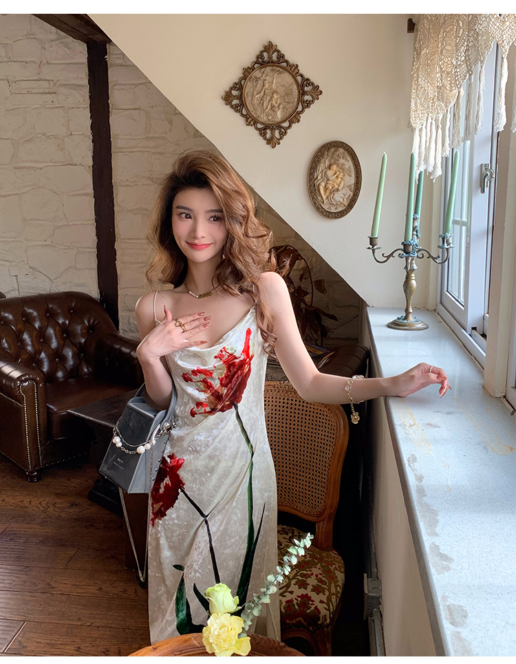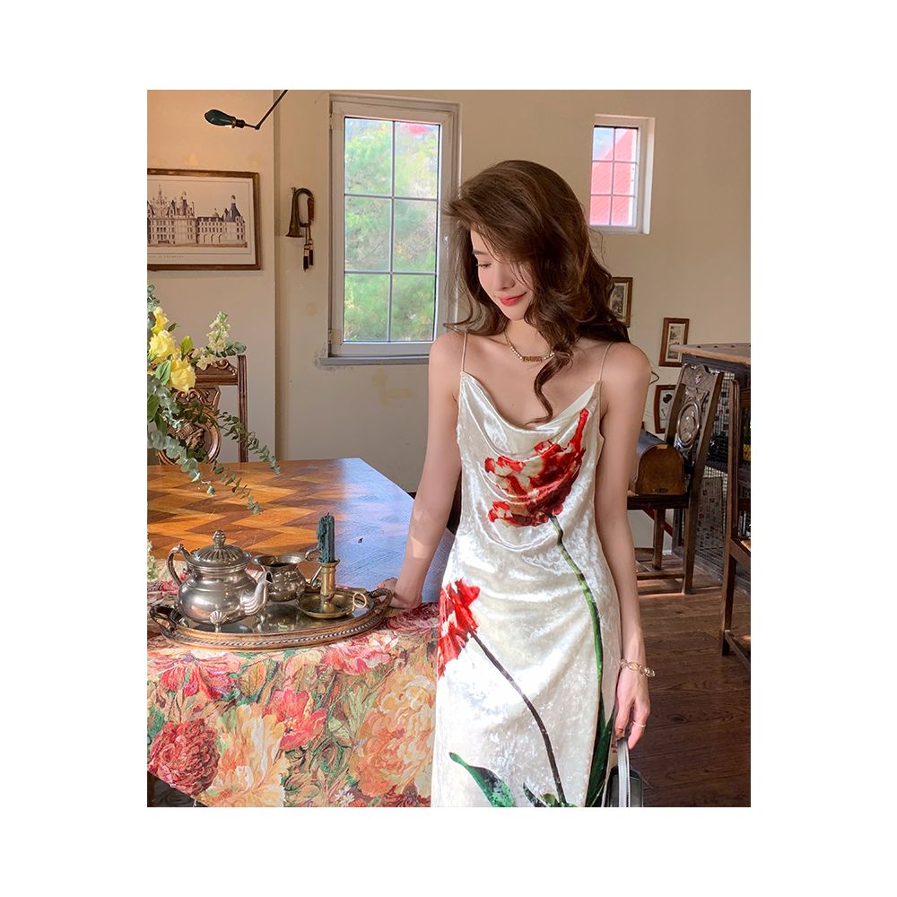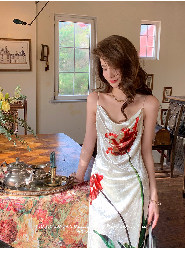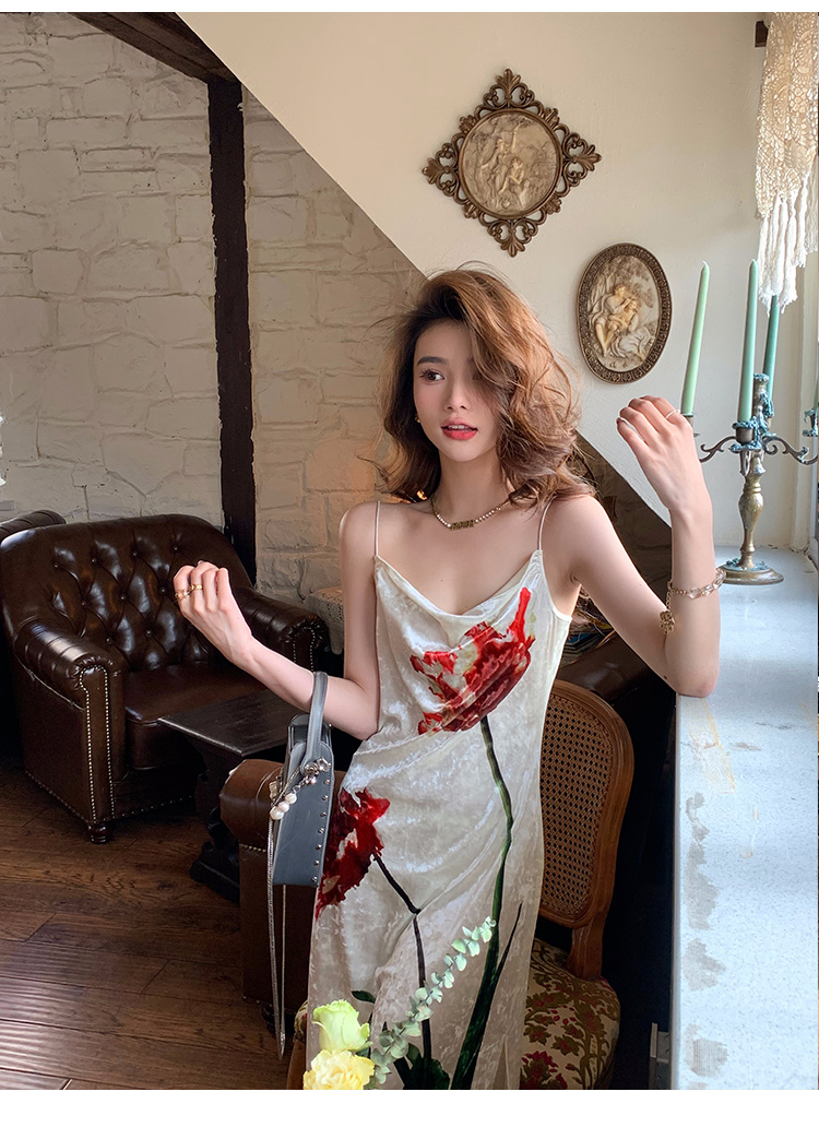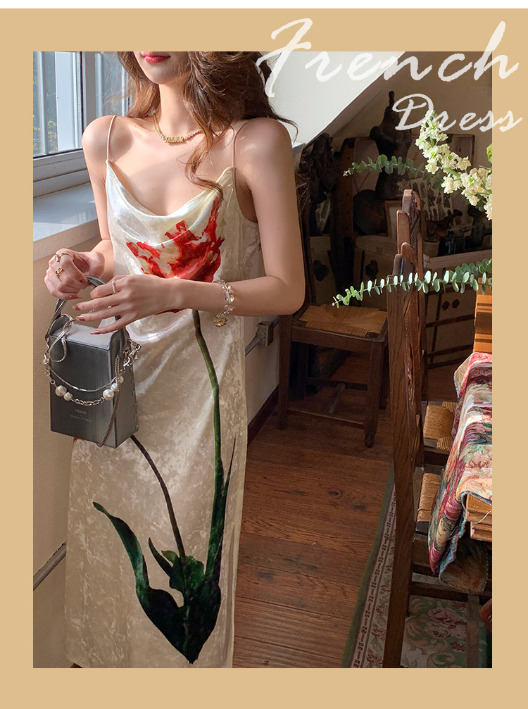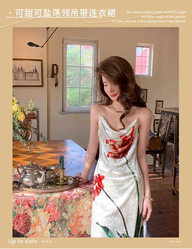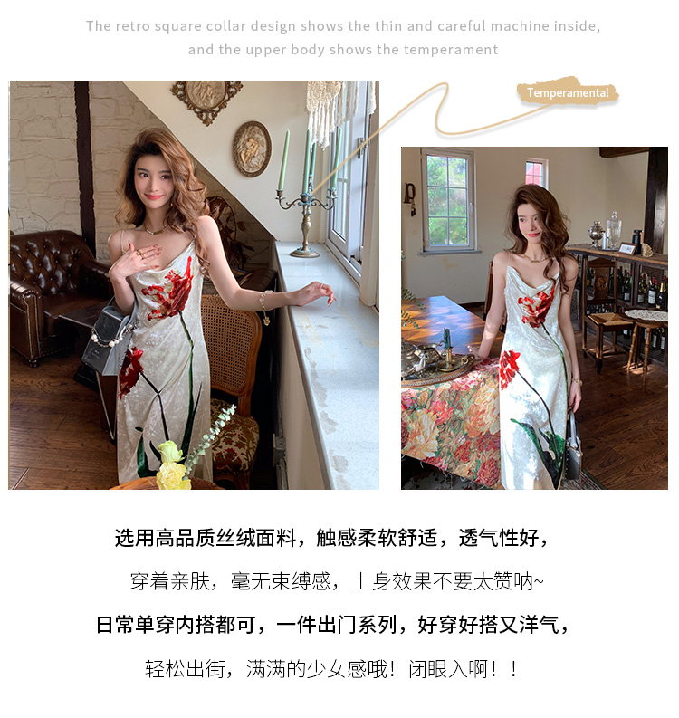 Asaya417 - French collar velvet camisole dress for women in autumn 2023 light and mature style with a unique waist closure and floral print long skirt