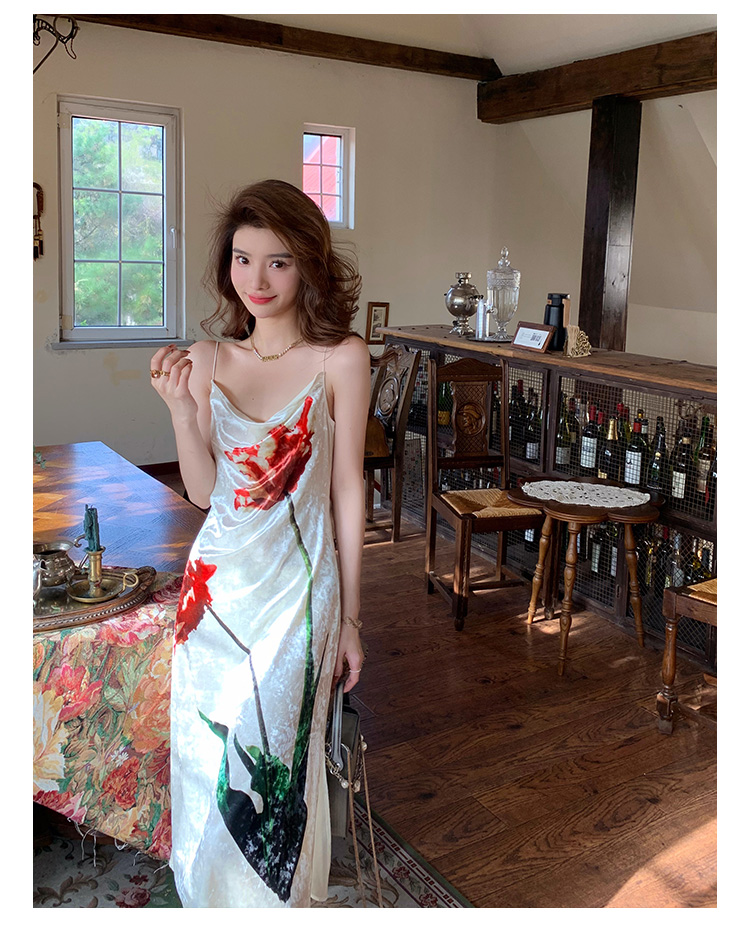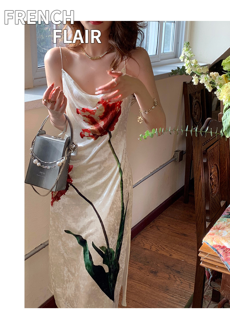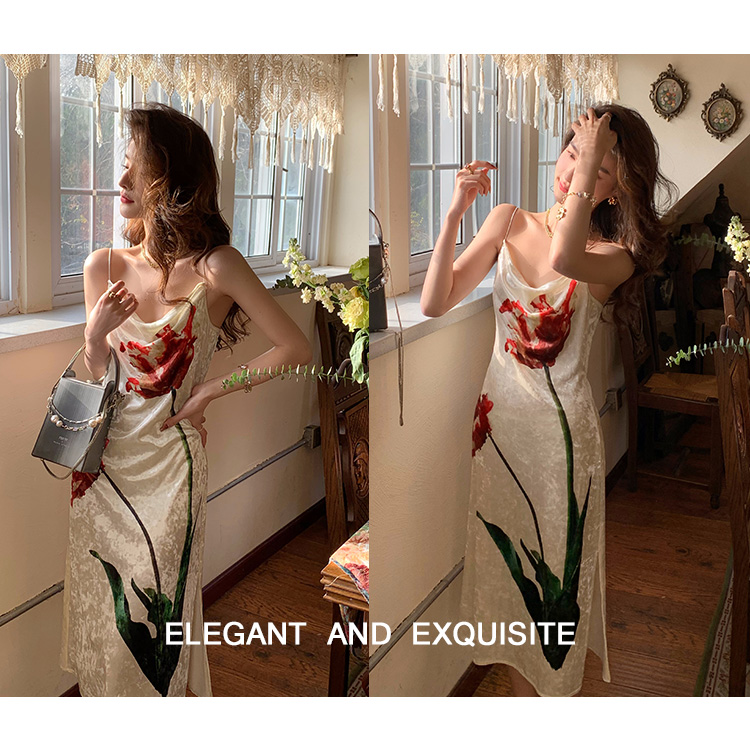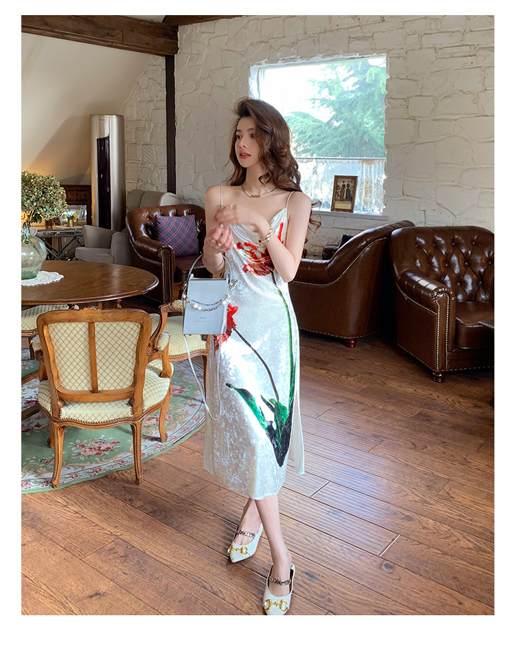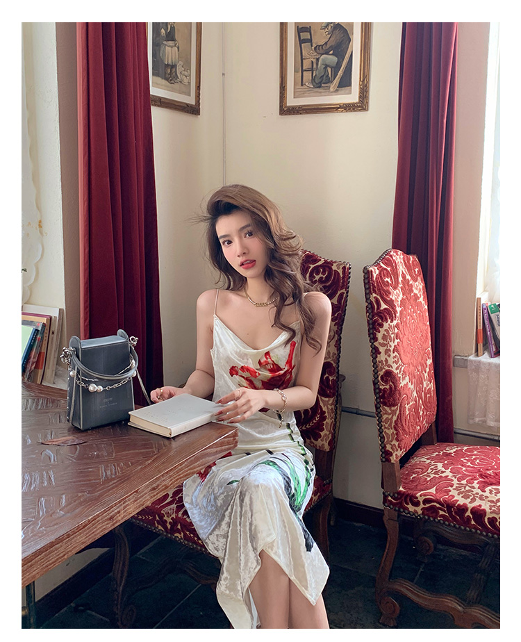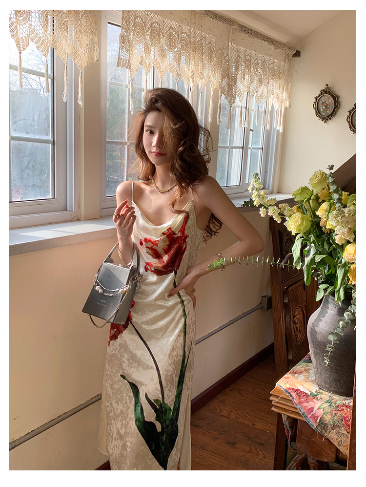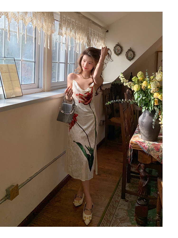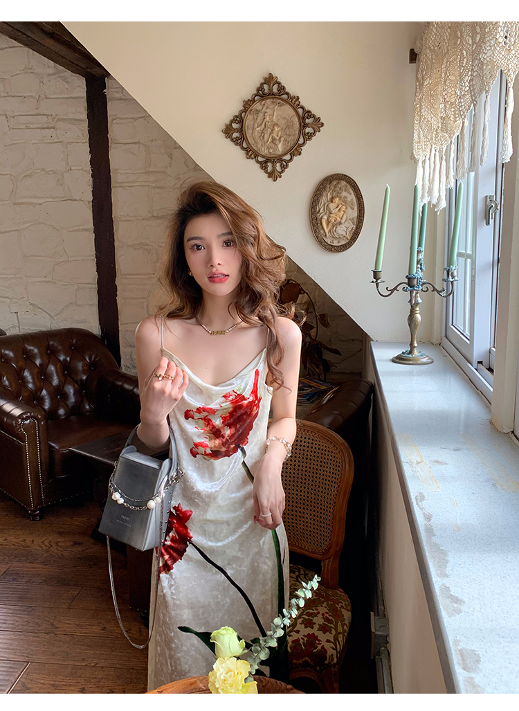 Asaya417 - French collar velvet camisole dress for women in autumn 2023 light and mature style with a unique waist closure and floral print long skirt