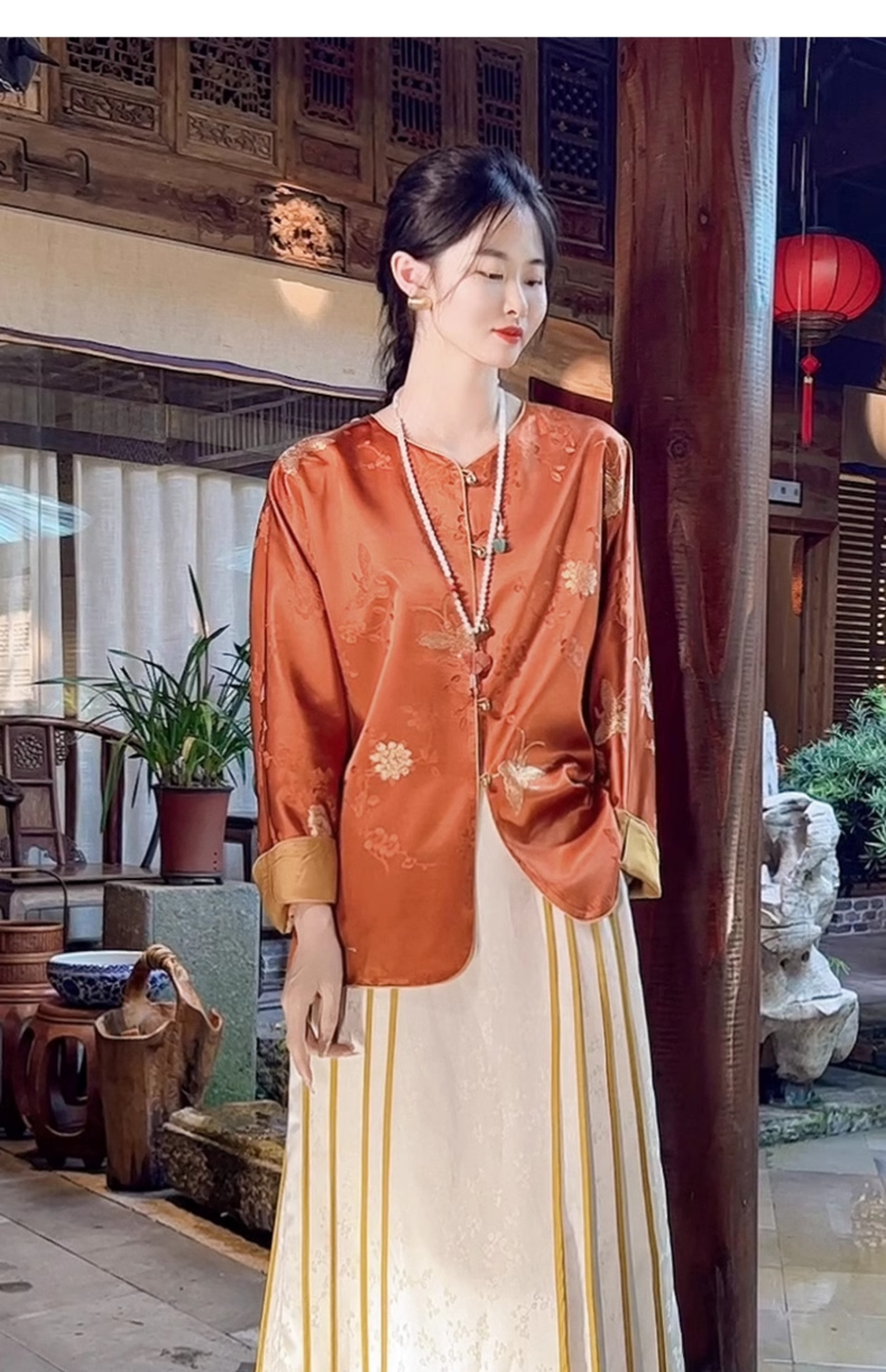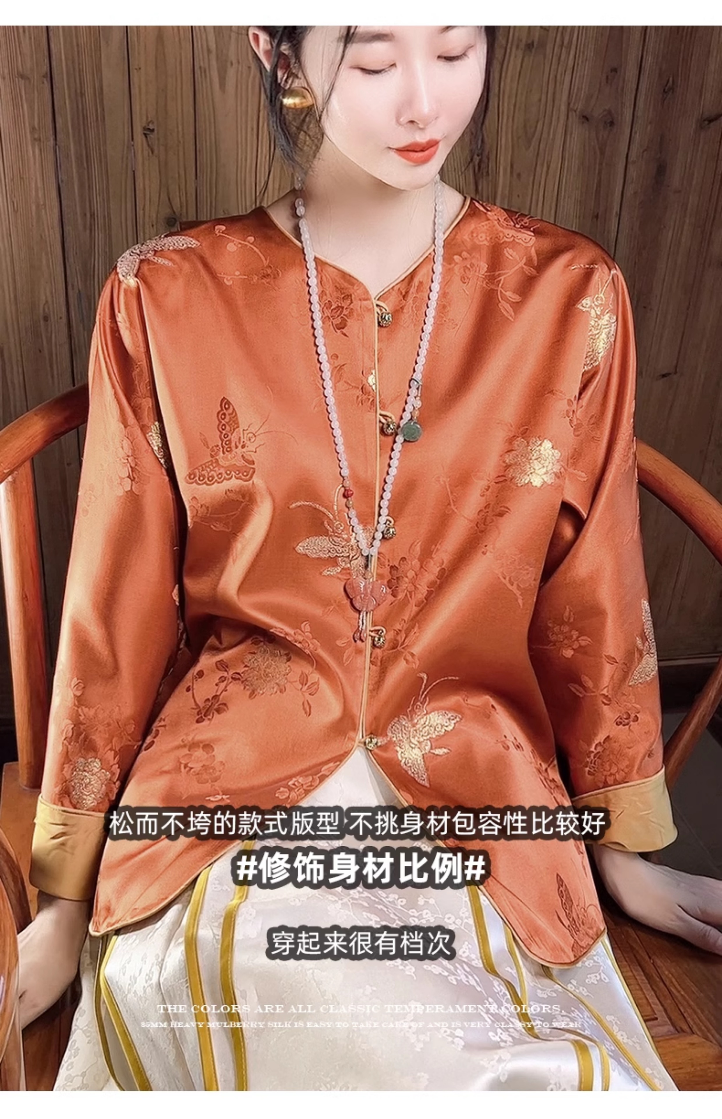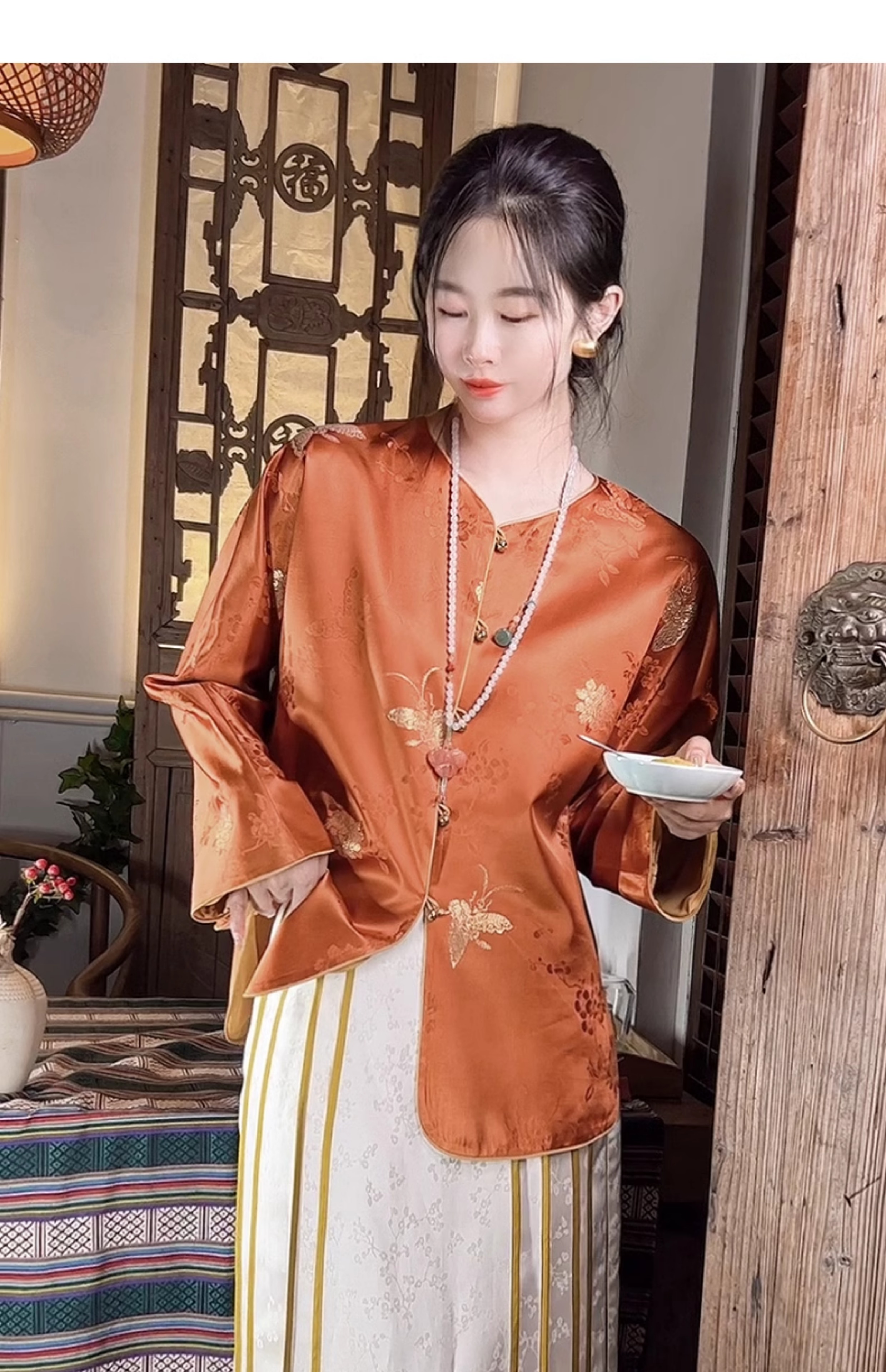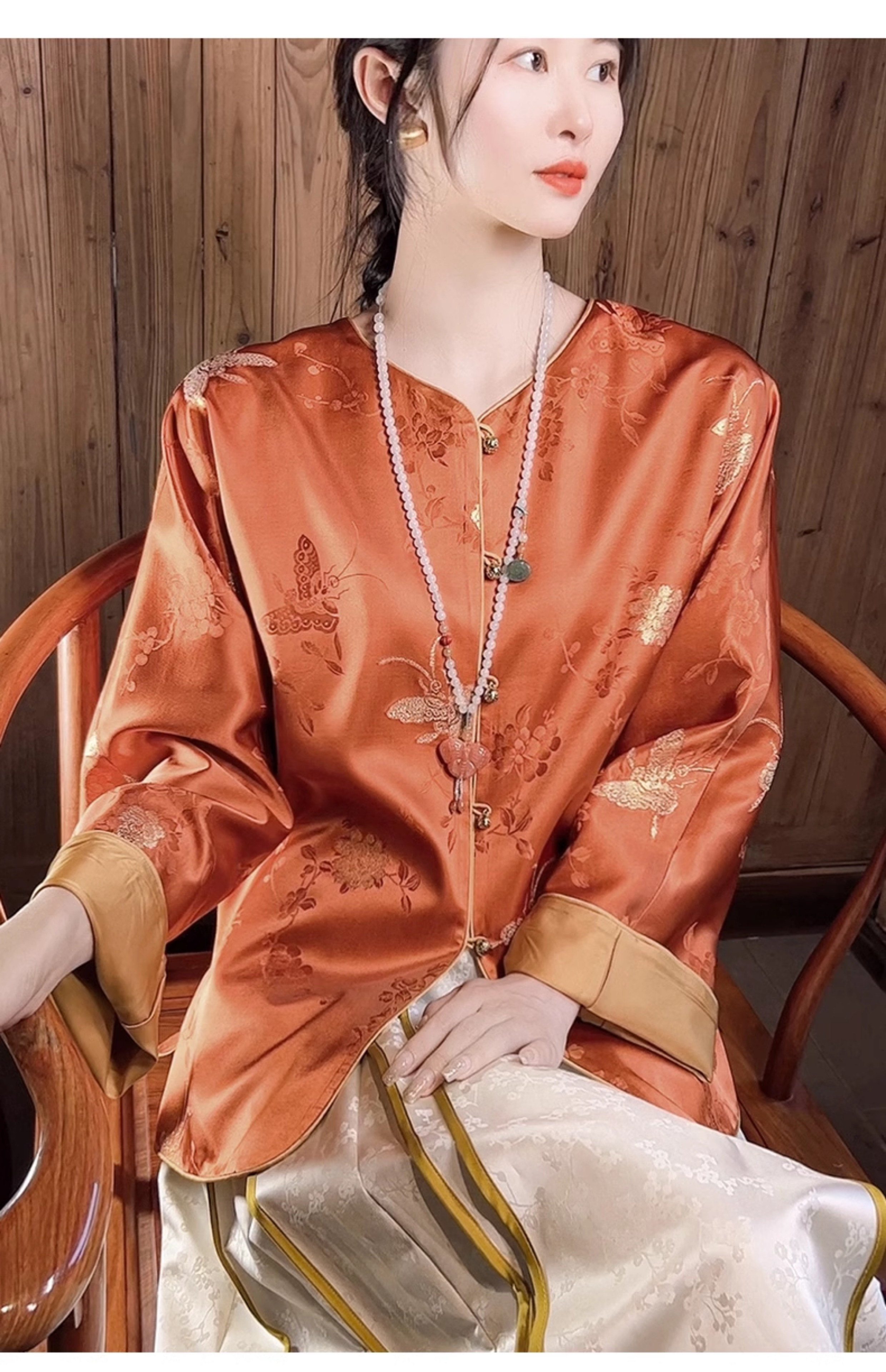 ASAYA2974 Golden Satin Butterfly Love Flower Caramel Color New Chinese Style Women’s National Style Jacket *JACKET ONLY , NO SKIRT (SILK MATERIAL)