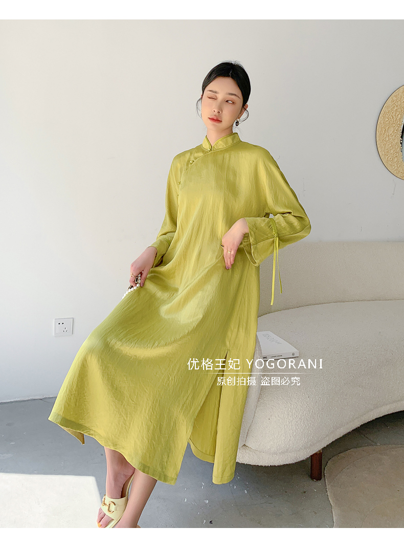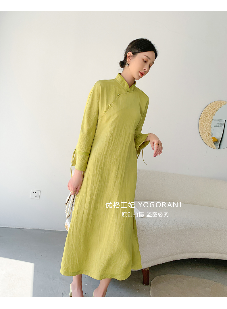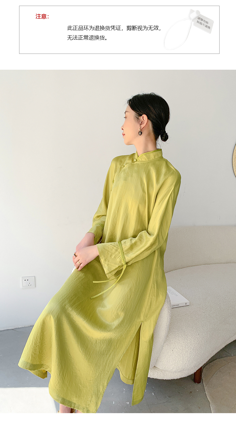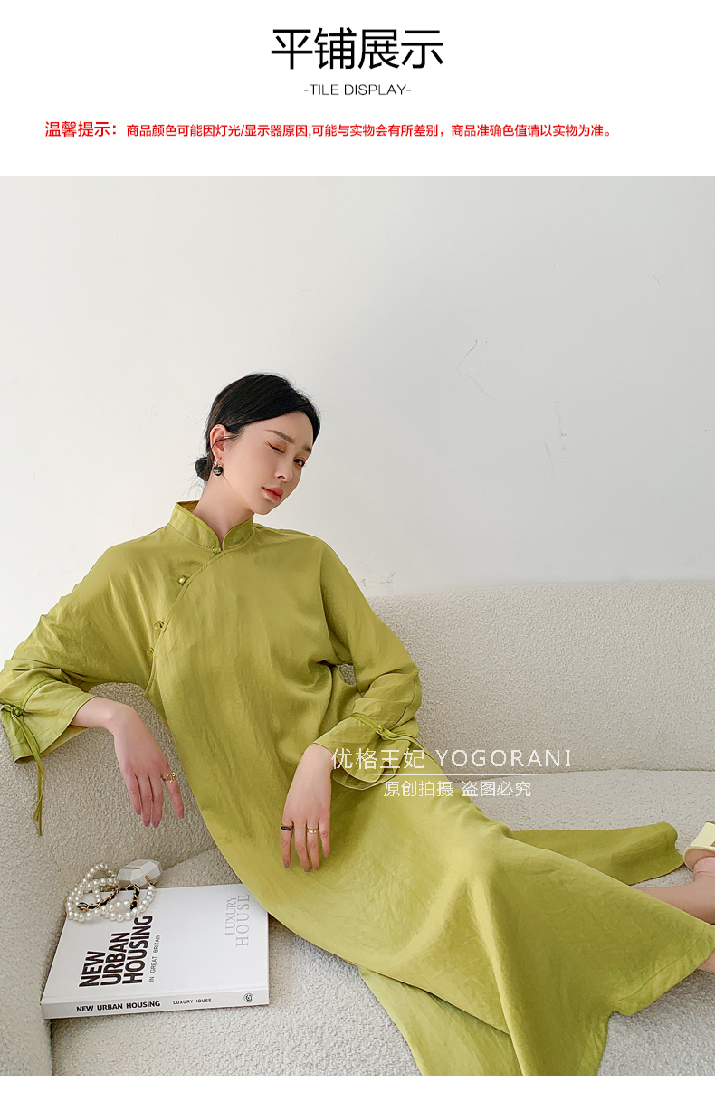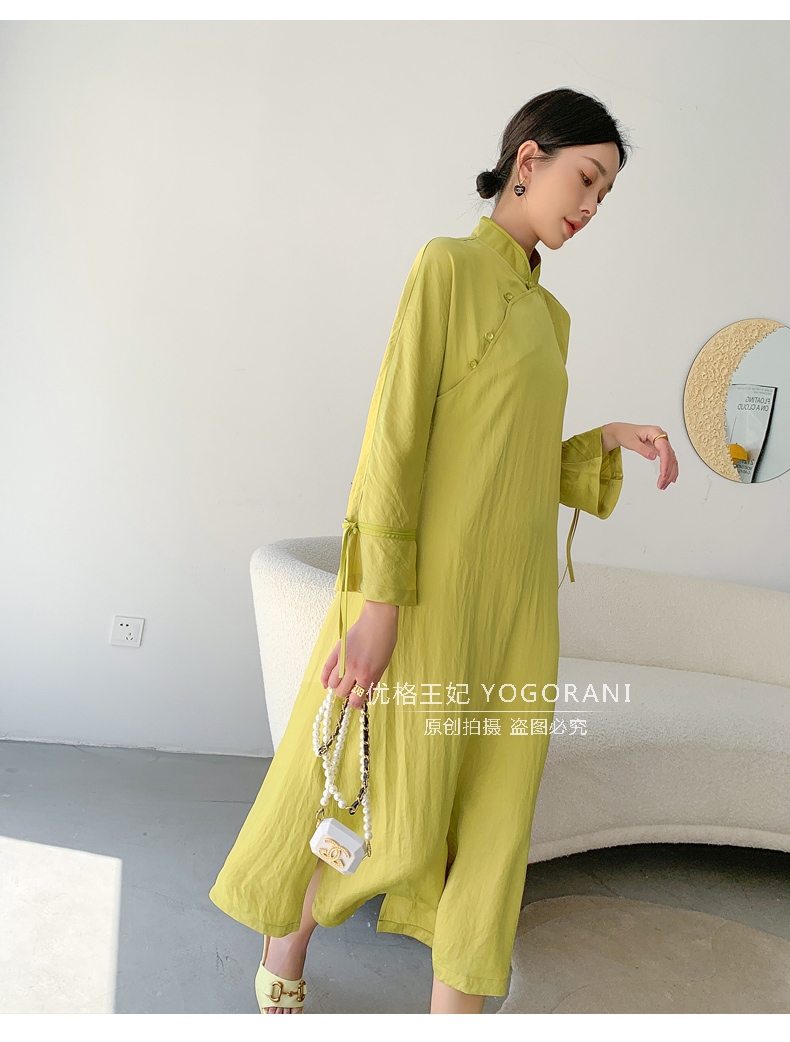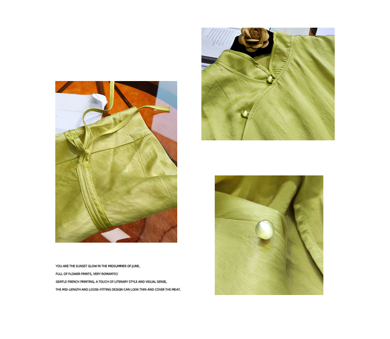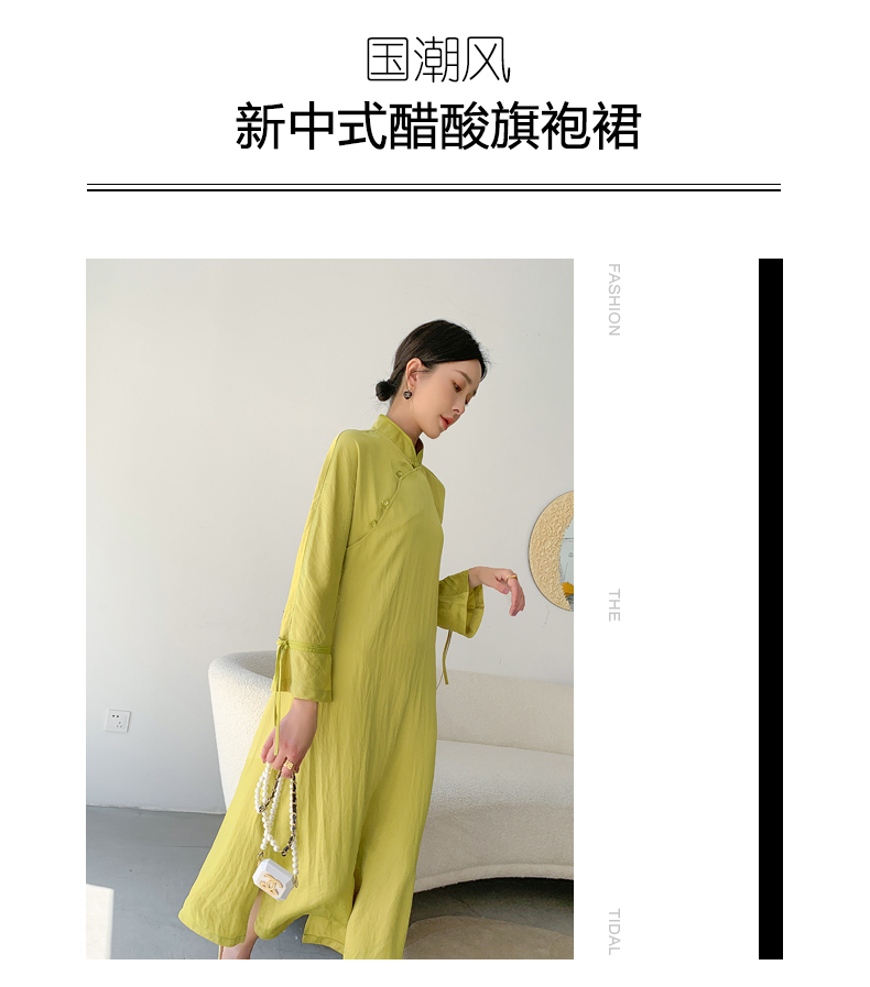 Asaya868 - Green high end acetic acid cheongsam dress for women s daily summer new style retro buckle casual loose over the knee dress
