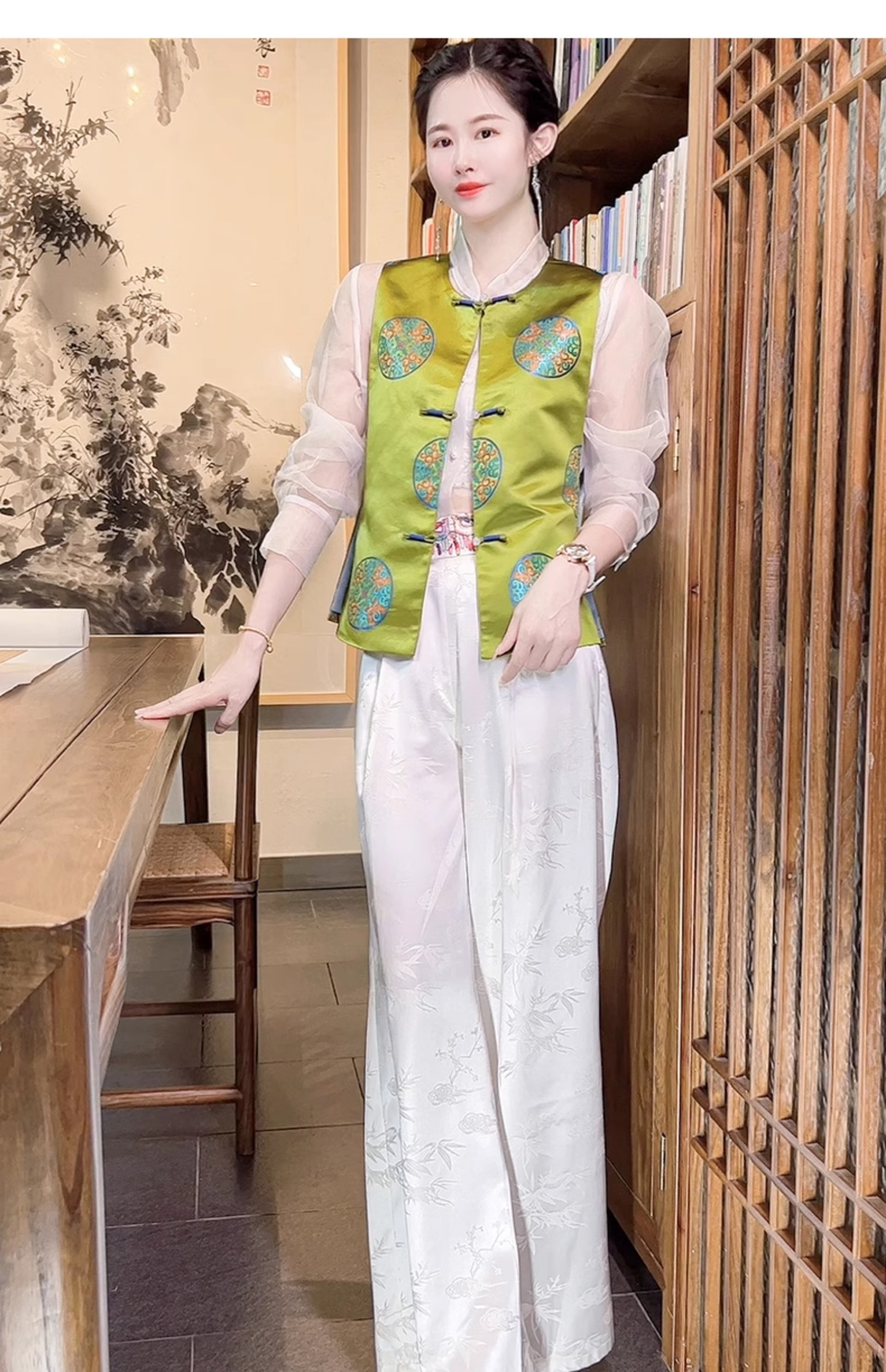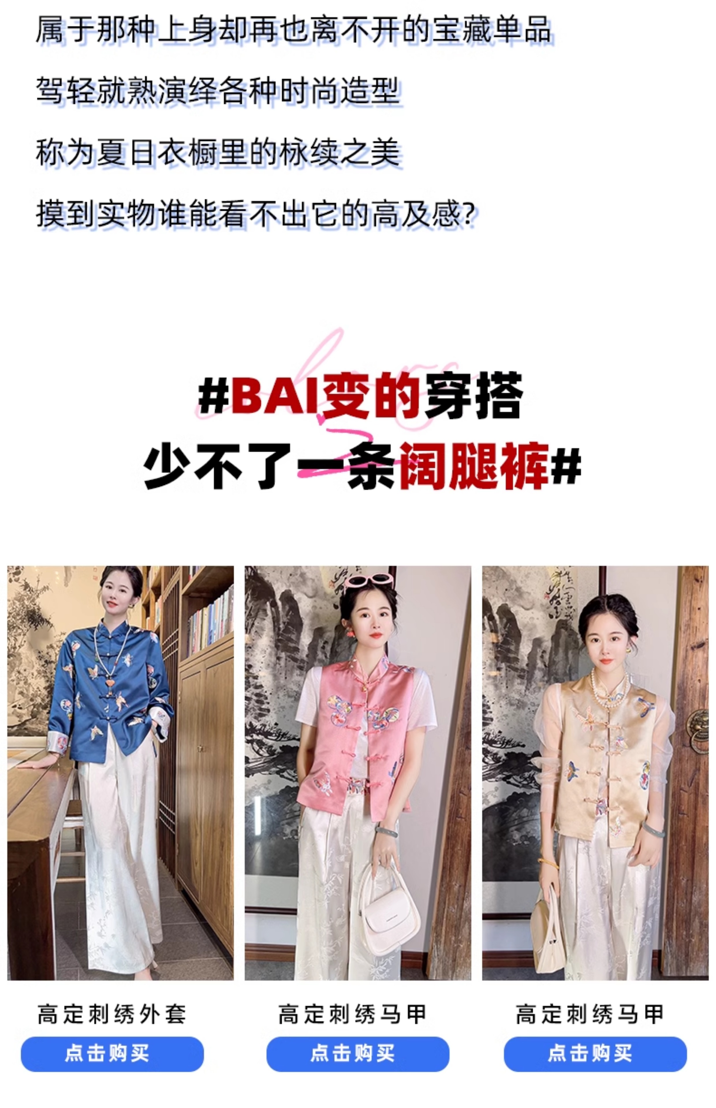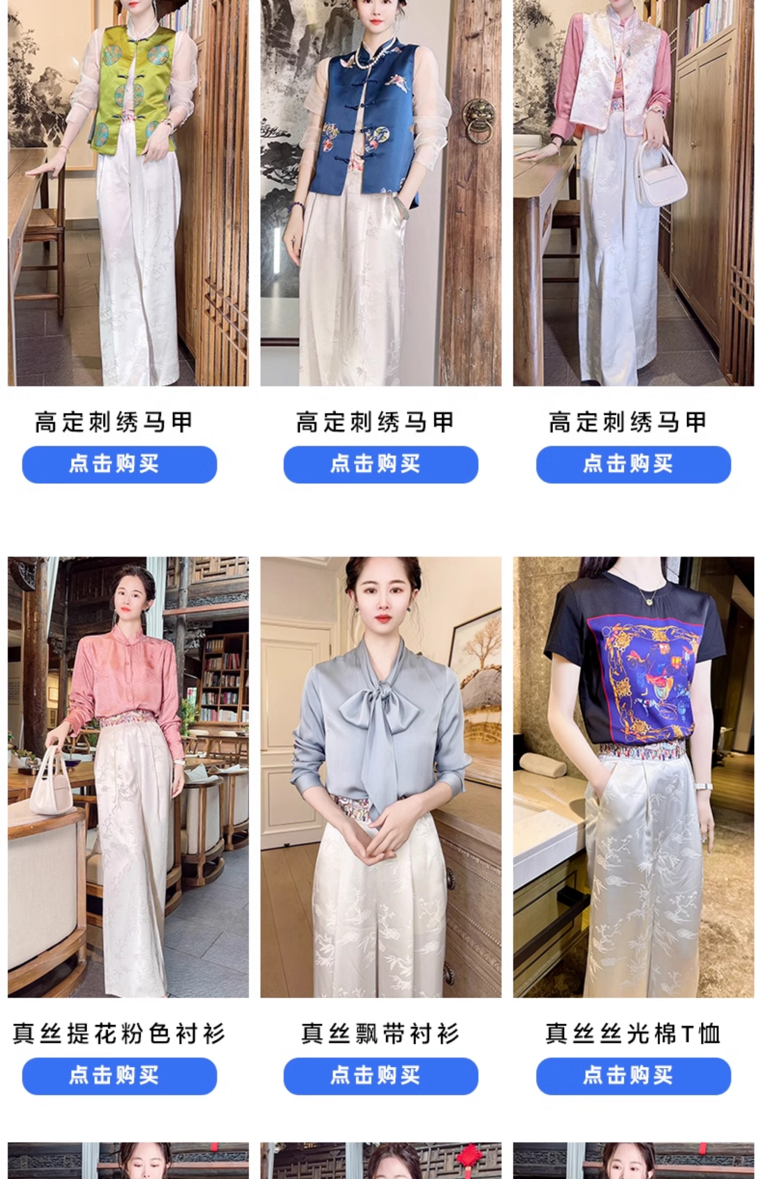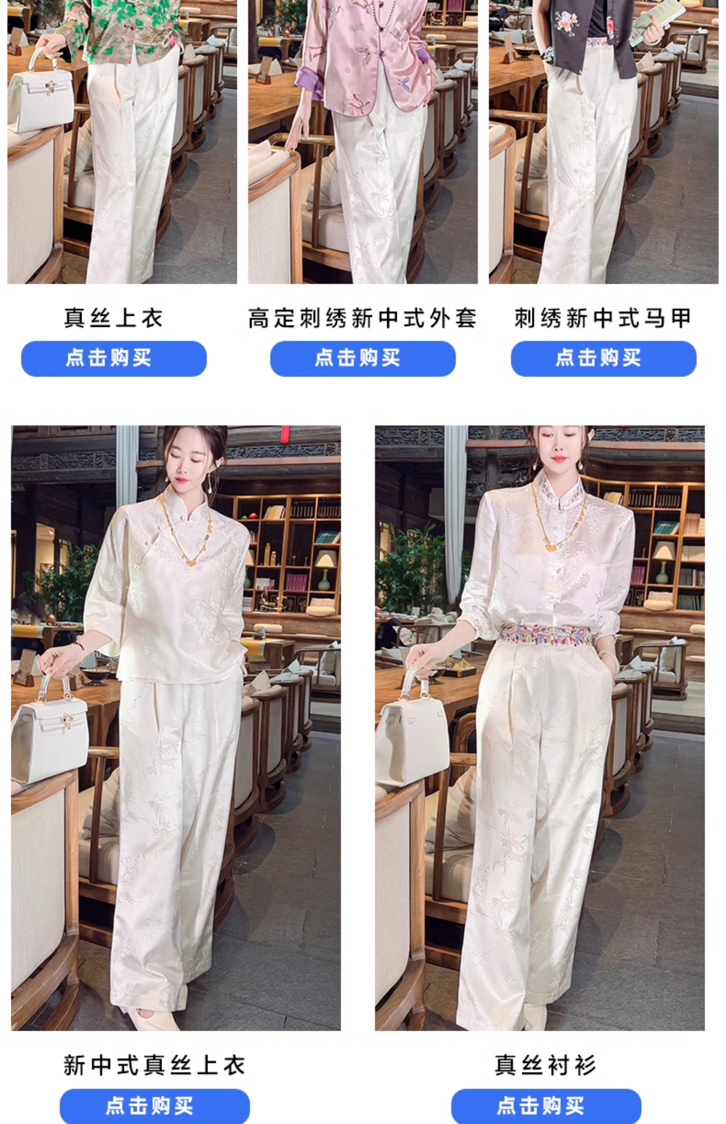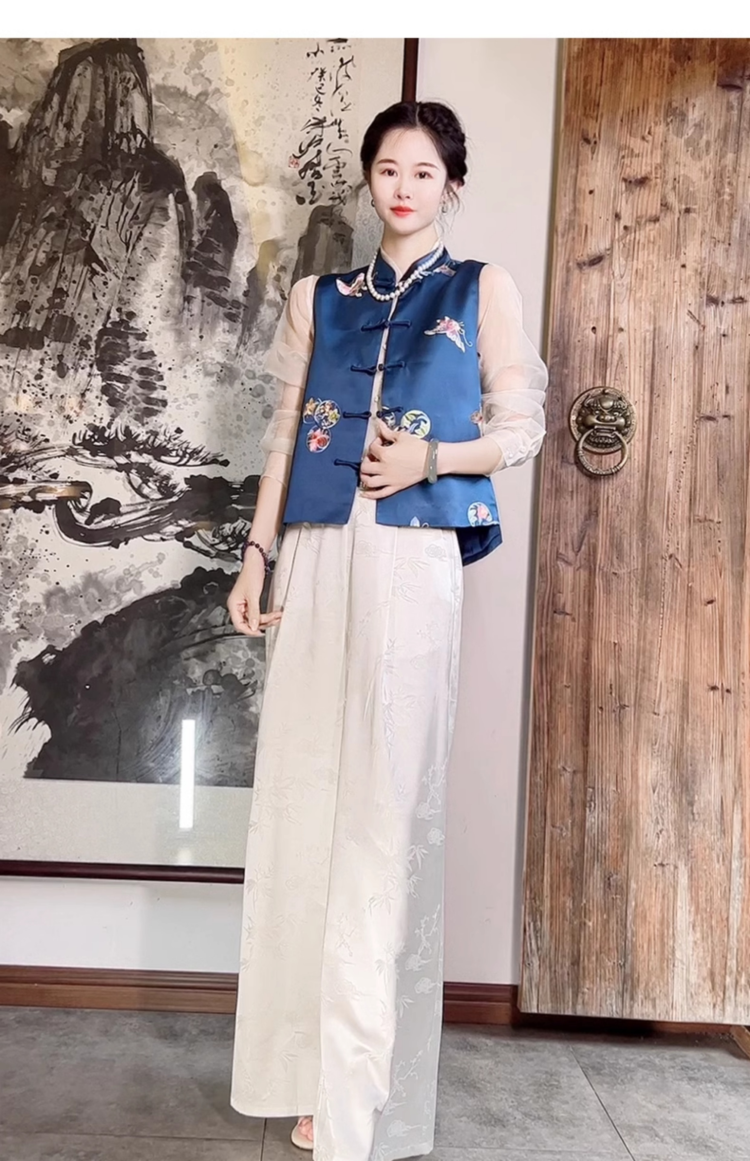color classification | White pants+blue ribbon shirt White pants+blue embroidered jacket Champagne vest+white pants+silk shirt navy vest+white pants+silk shirt White pants+pink stir fried shirt |