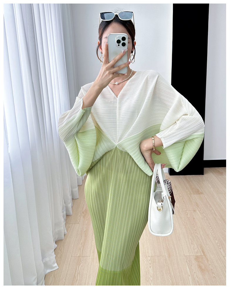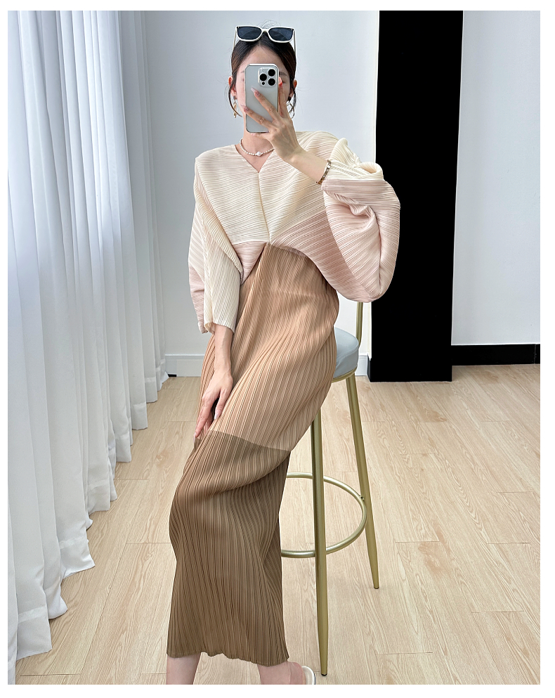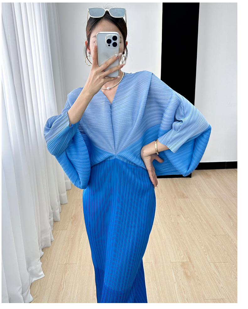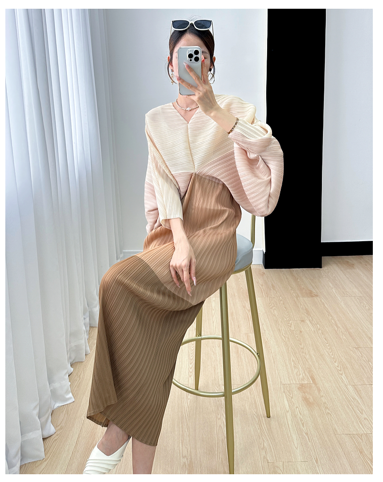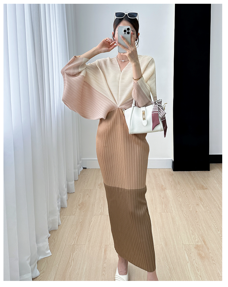 ASAYA2931 Miyake high-end niche temperament color-blocking pleated bat-sleeve dress