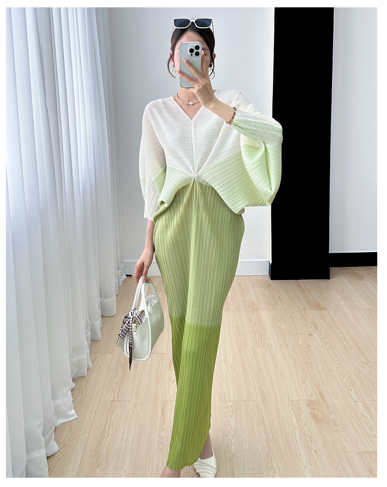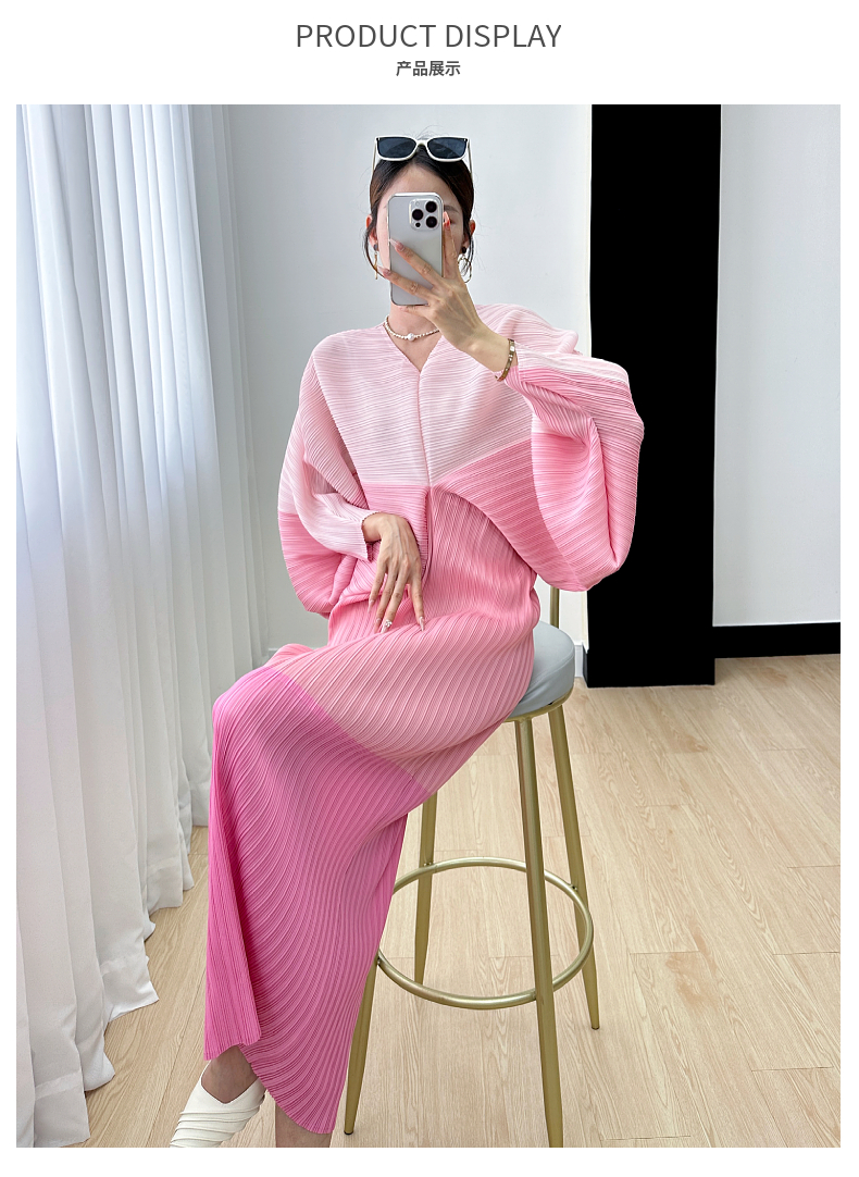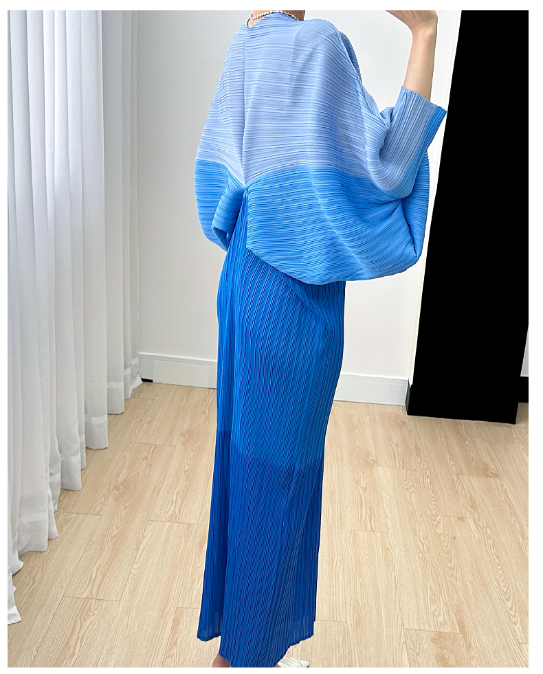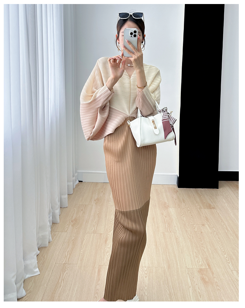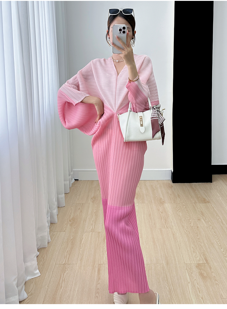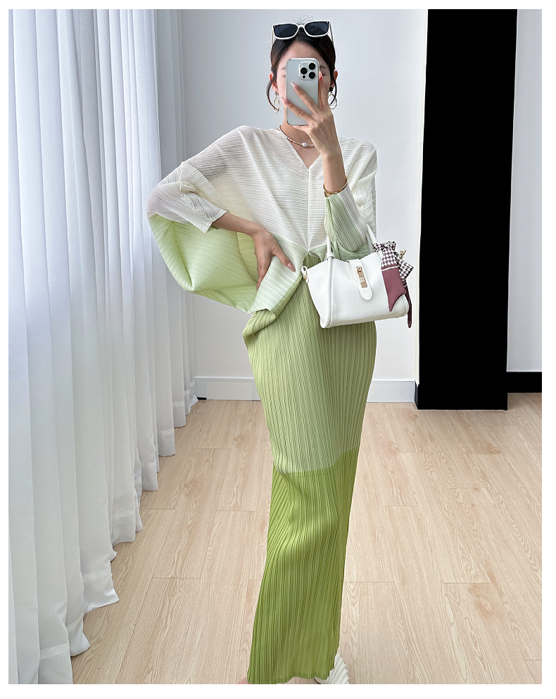 ASAYA2931 Miyake high-end niche temperament color-blocking pleated bat-sleeve dress