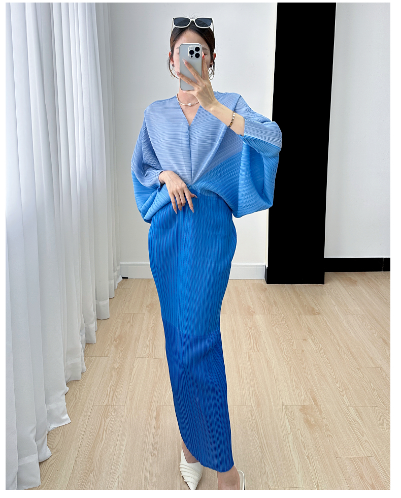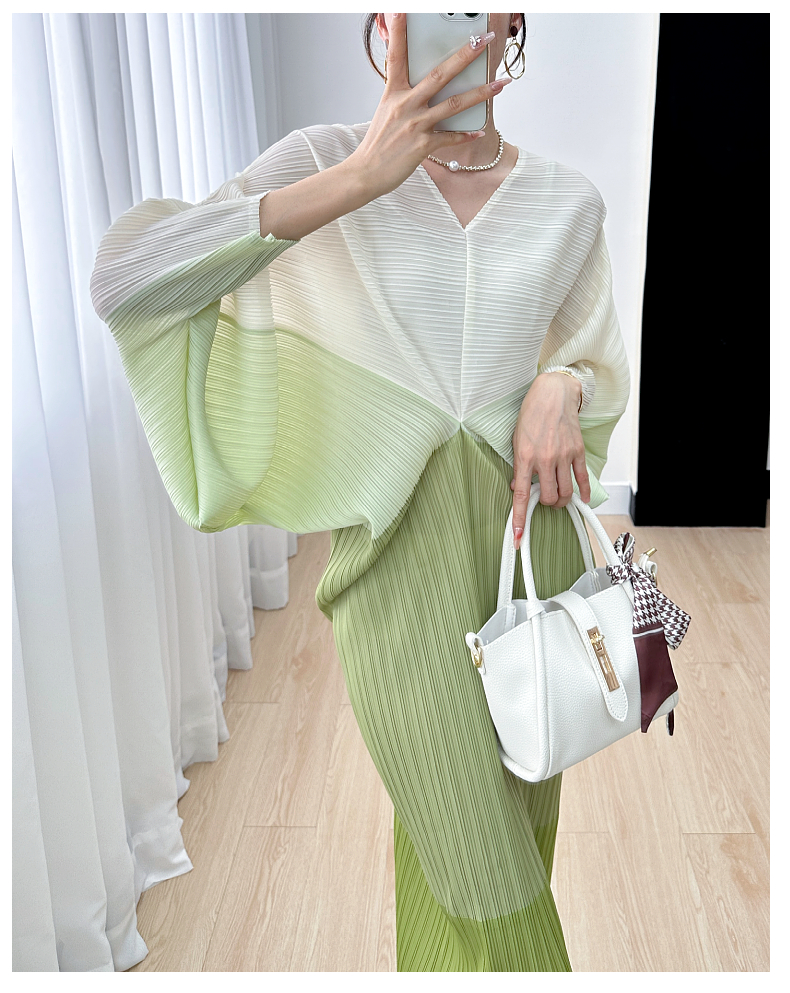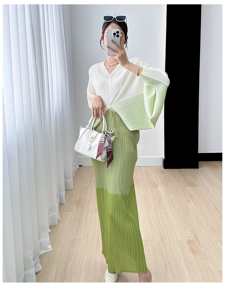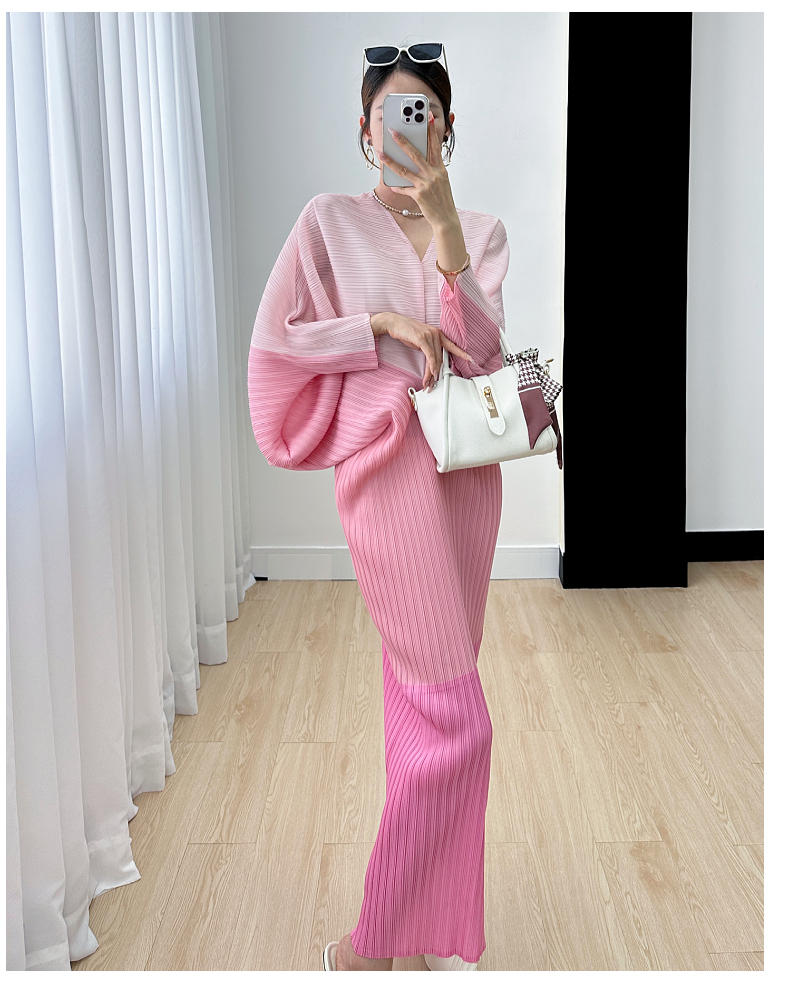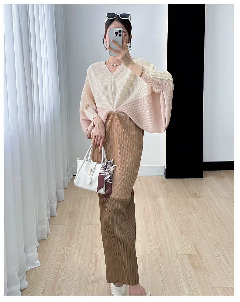 ASAYA2931 Miyake high-end niche temperament color-blocking pleated bat-sleeve dress