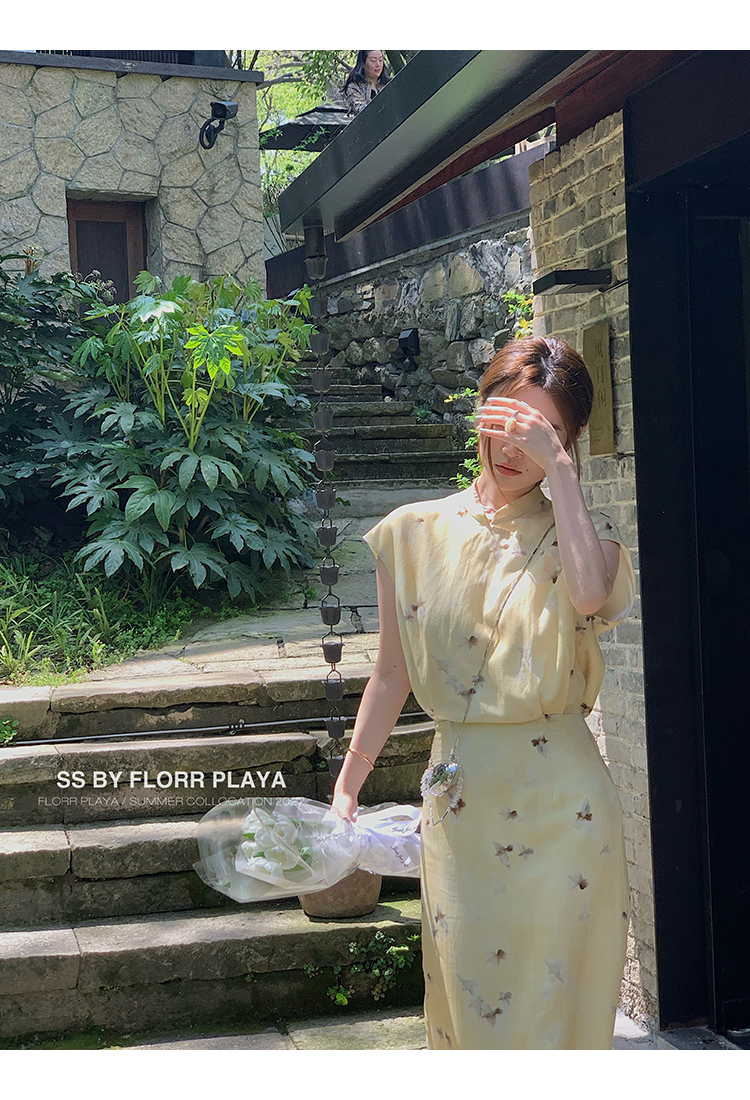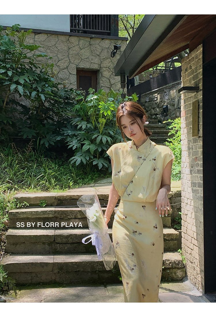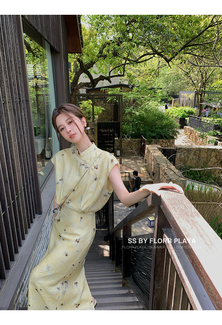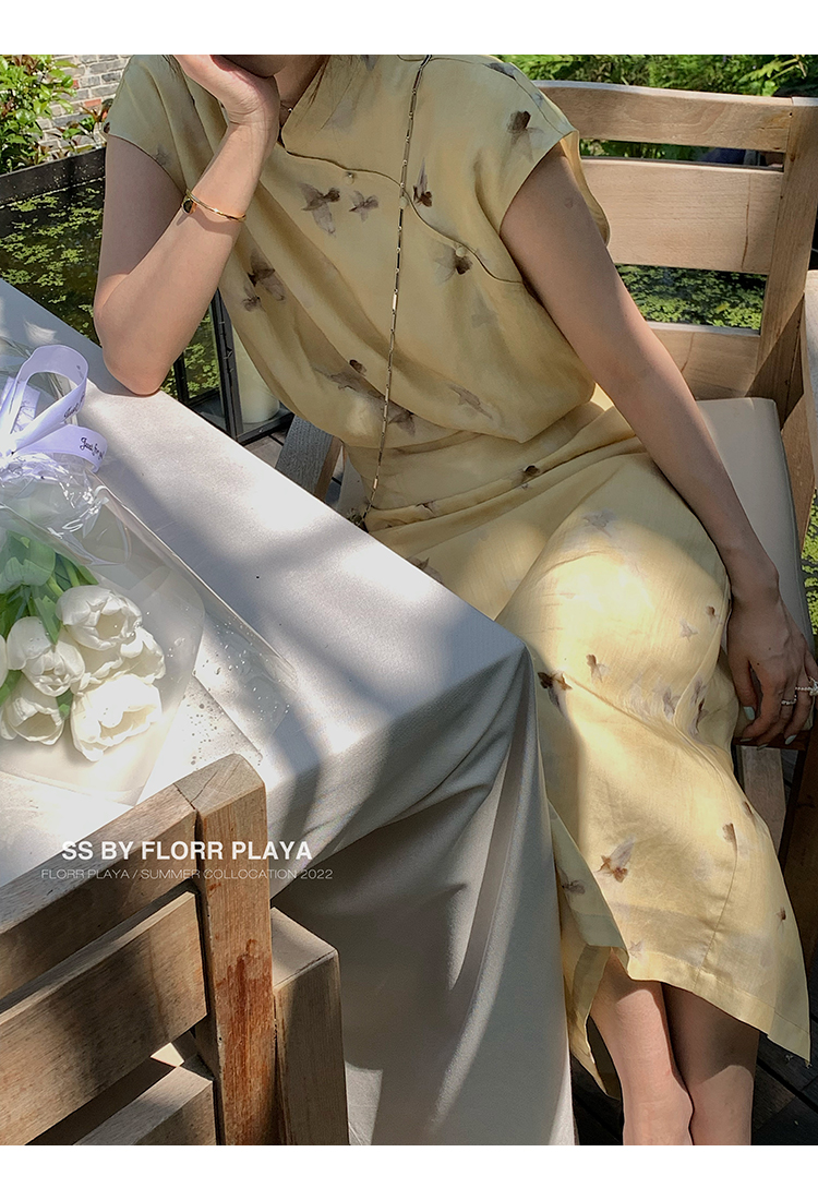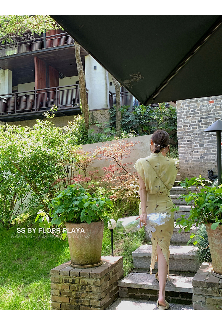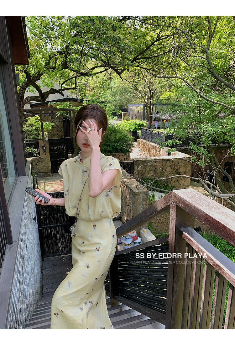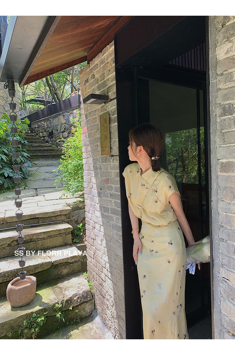 Asaya1001 - Hua Hua Yuan Bi Po Ningxiang Light Yellow New Chinese Short sleeved Dress for Women s Spring and Summer Cheongsam Improved Hip Wrapping Skirt