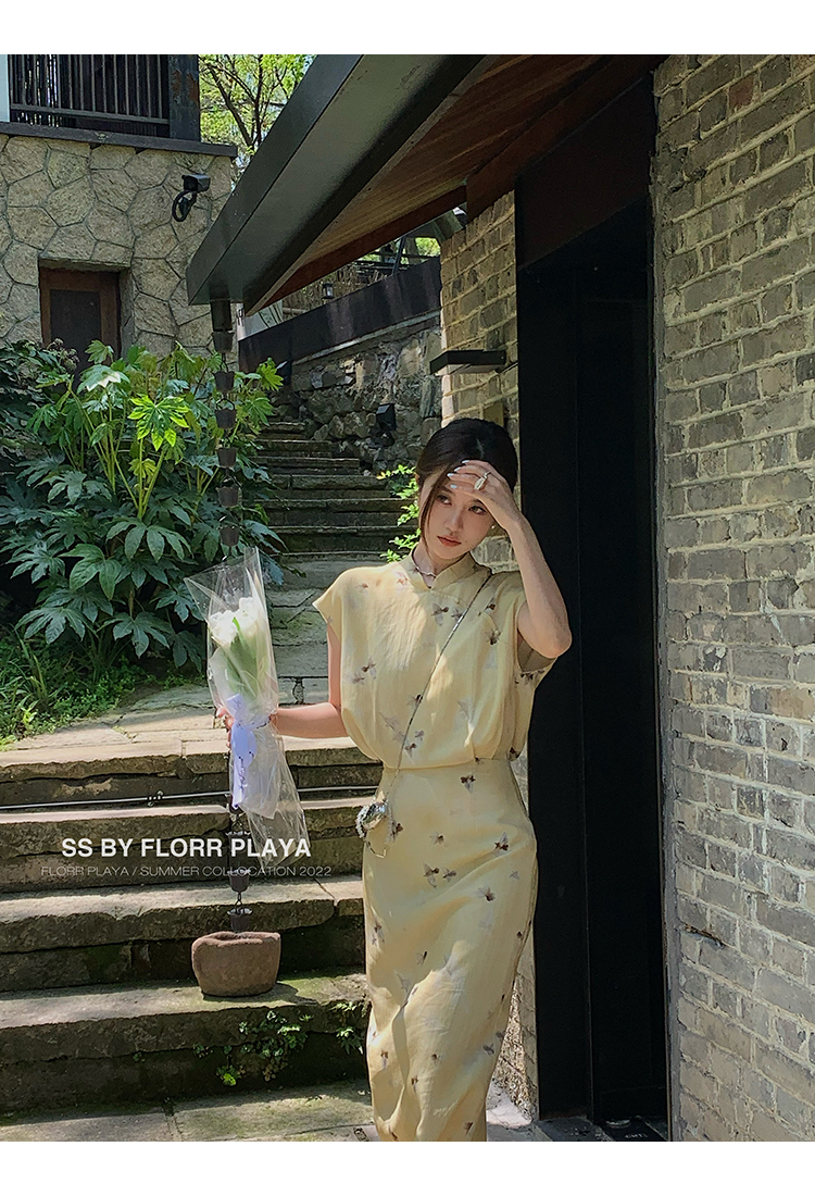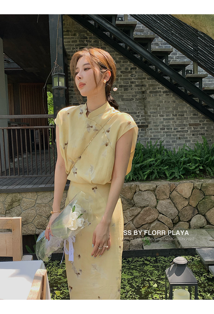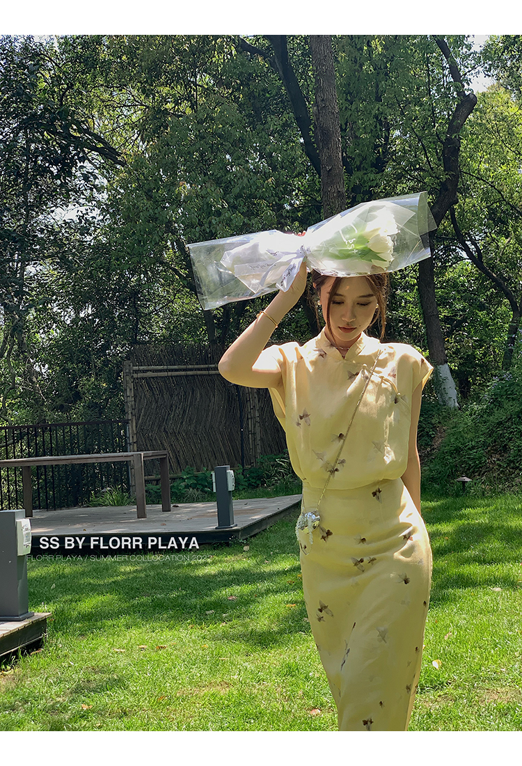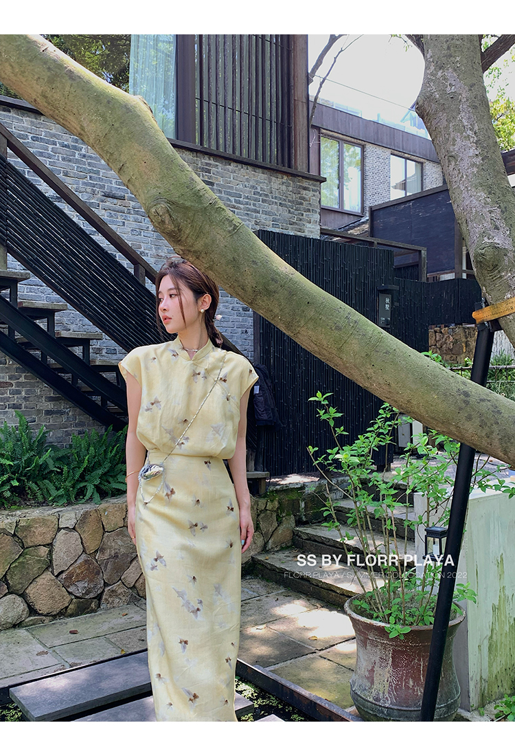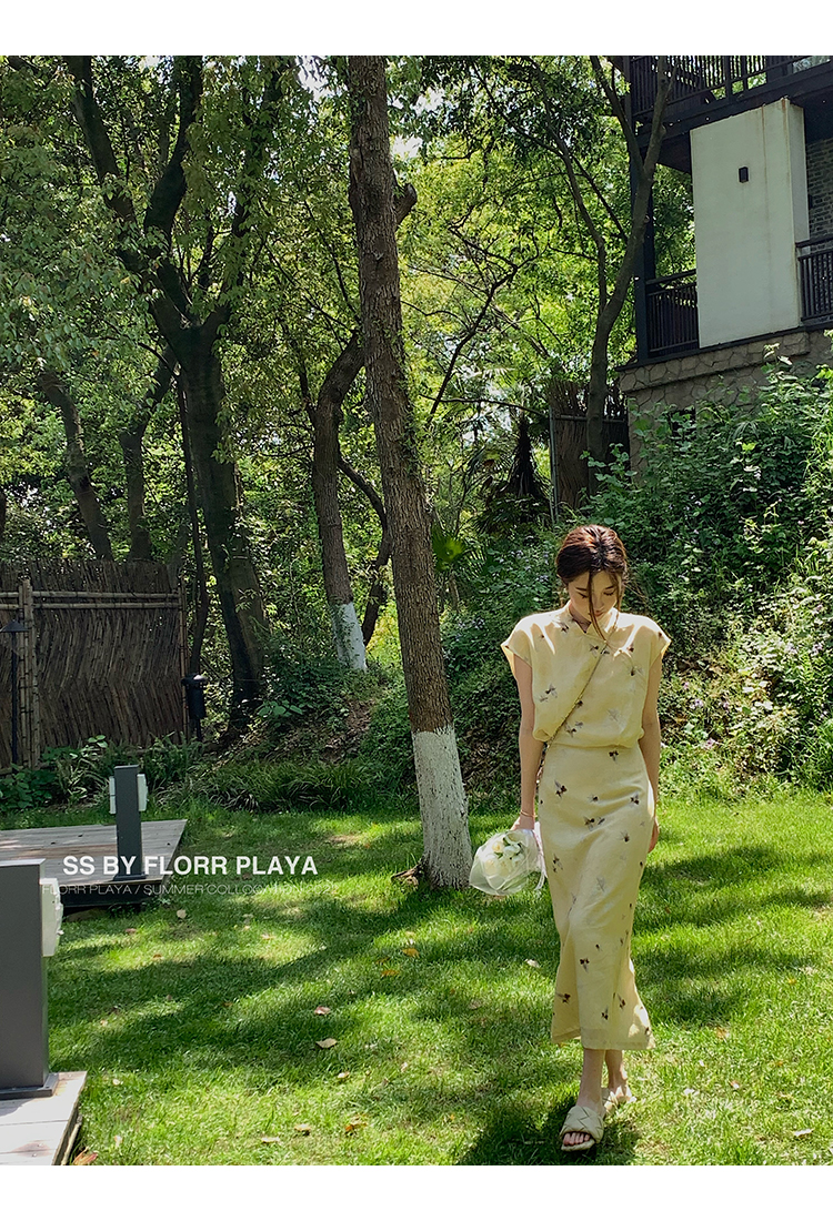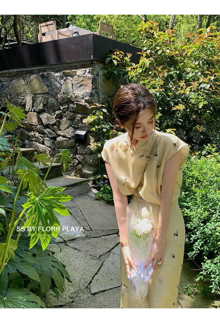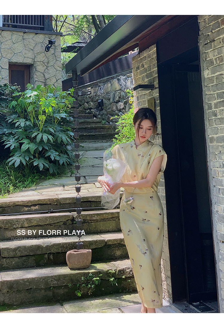 Asaya1001 - Hua Hua Yuan Bi Po Ningxiang Light Yellow New Chinese Short sleeved Dress for Women s Spring and Summer Cheongsam Improved Hip Wrapping Skirt