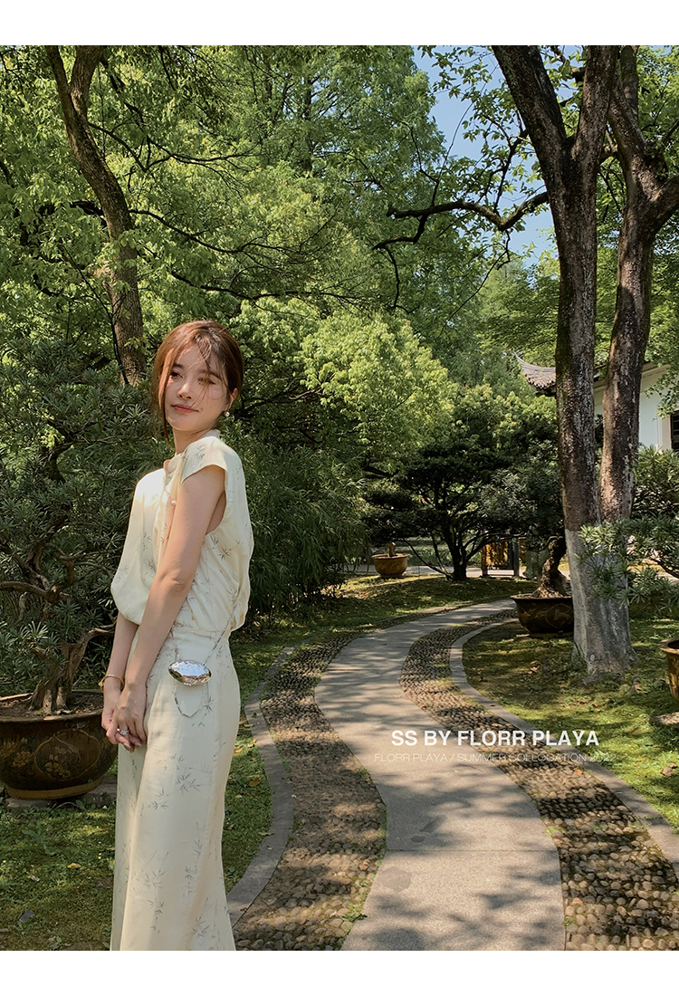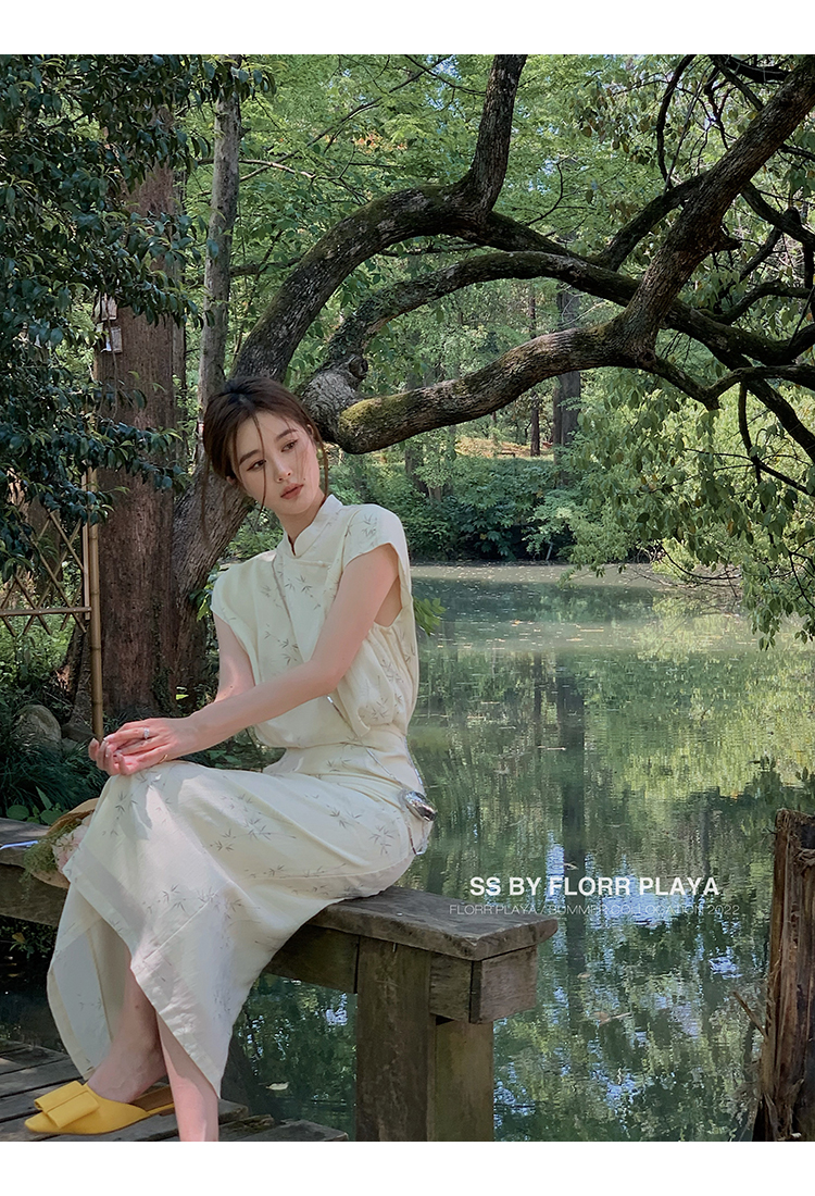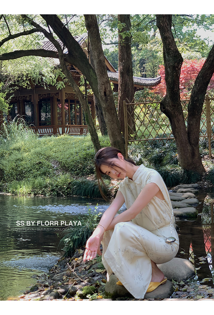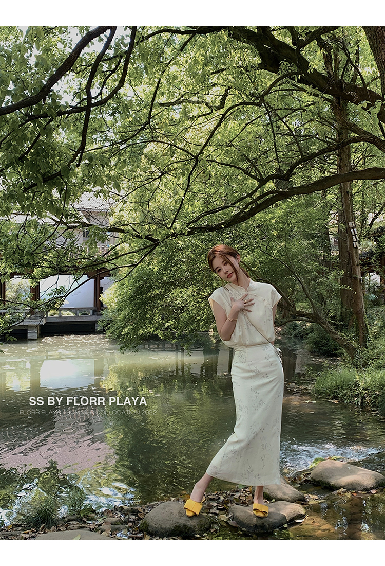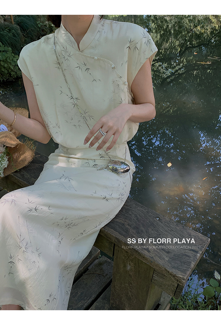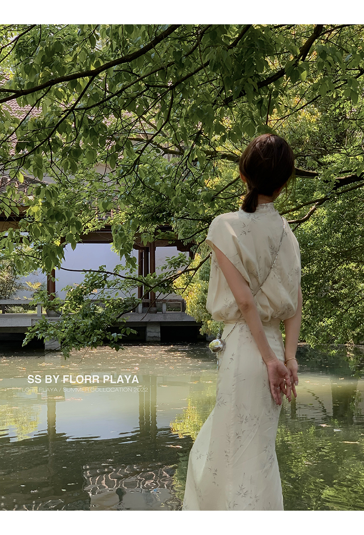 为了衬托这种自然不做作的感觉,面料我用的仿天丝竹节麻底布,舒适透气,垂坠感也好。打了好几块底布最后选择了这一块抗皱性非常强的底布!再进行数码印花工艺,这种工艺的优点就是层次丰富颜色自然柔和。小立领的设计是国风的代表,领圈大小经过反复调试使其显的脖子纤细的同时又不会卡脖,不会立的很高,那样会突兀不日常,也对脖子短的mm不太友好。前片是假半襟的设计配上小圆扣,在后中放了隐拉方便穿脱。
