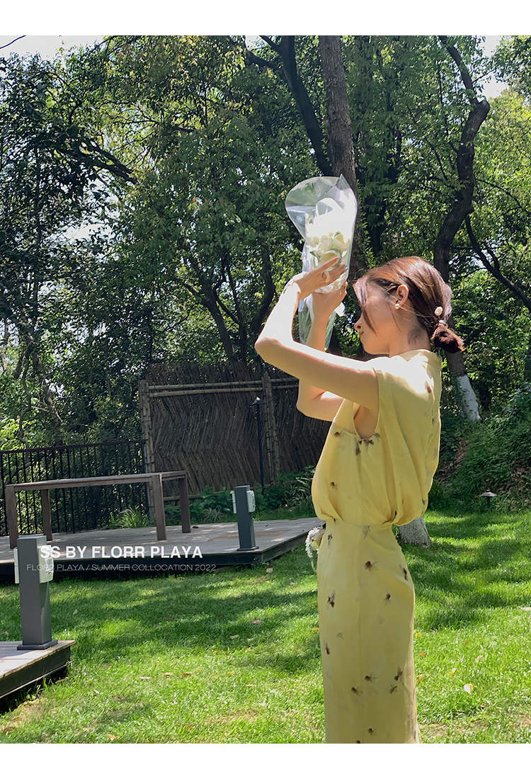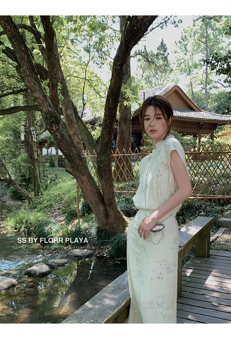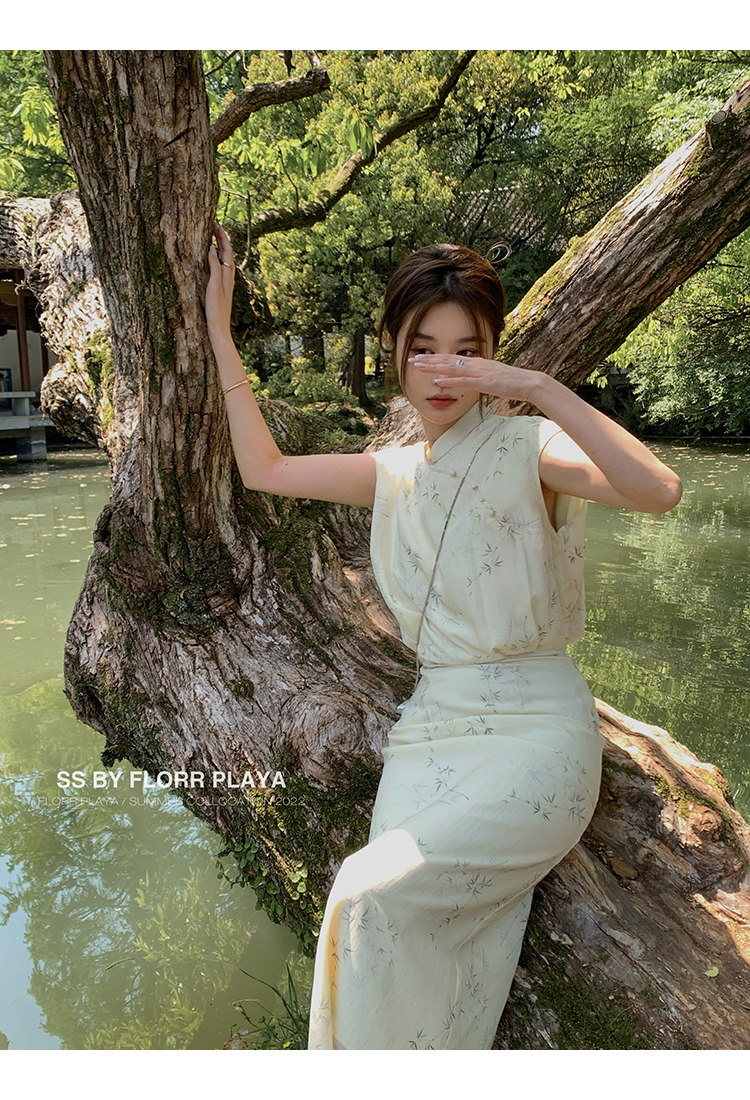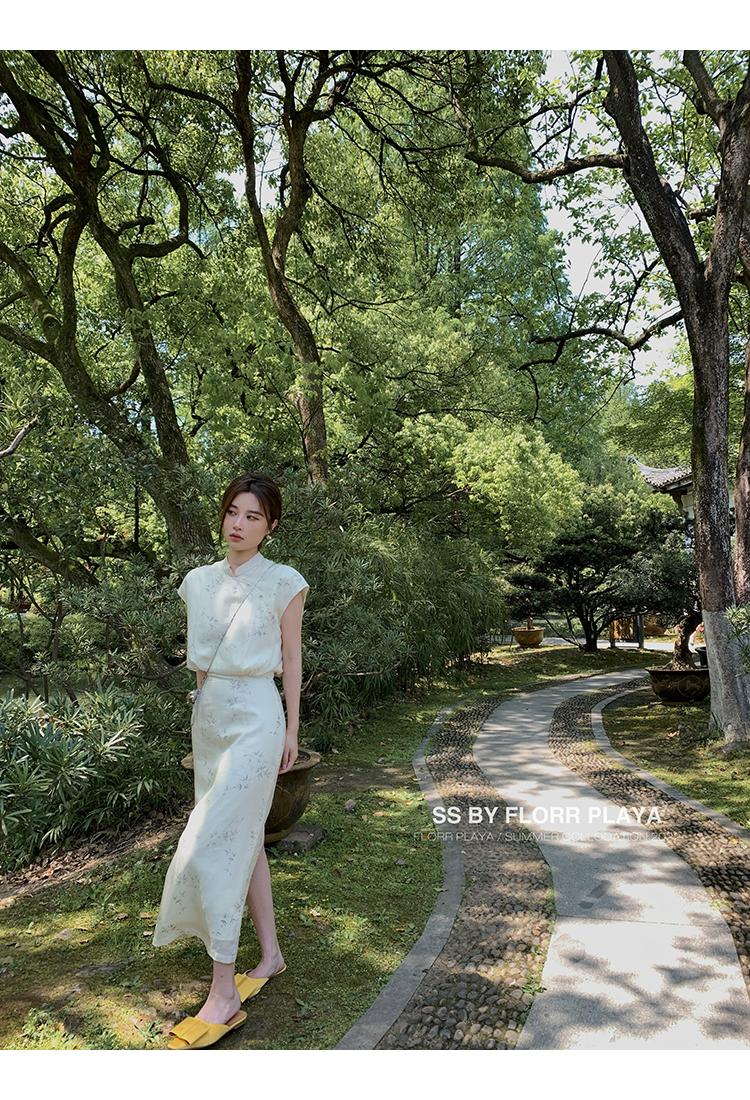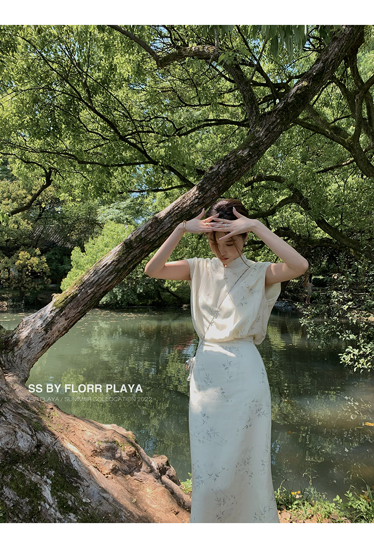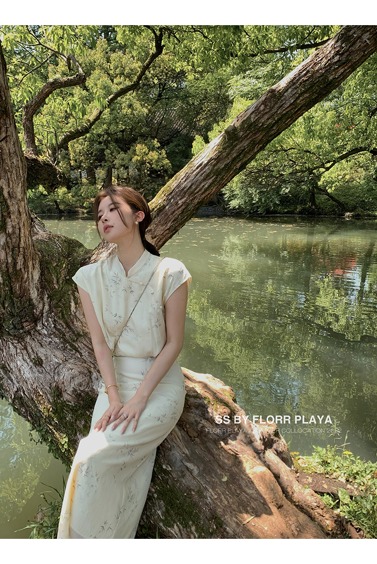为了衬托这种自然不做作的感觉,面料我用的仿天丝竹节麻底布,舒适透气,垂坠感也好。打了好几块底布最后选择了这一块抗皱性非常强的底布!再进行数码印花工艺,这种工艺的优点就是层次丰富颜色自然柔和。小立领的设计是国风的代表,领圈大小经过反复调试使其显的脖子纤细的同时又不会卡脖,不会立的很高,那样会突兀不日常,也对脖子短的mm不太友好。前片是假半襟的设计配上小圆扣,在后中放了隐拉方便穿脱。