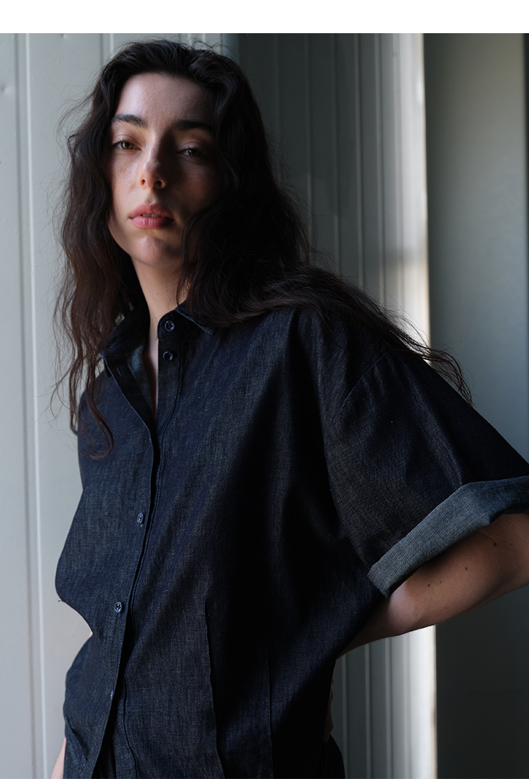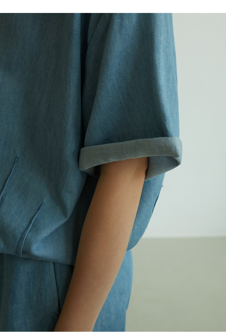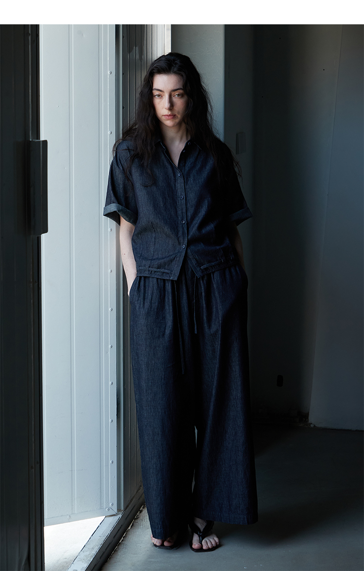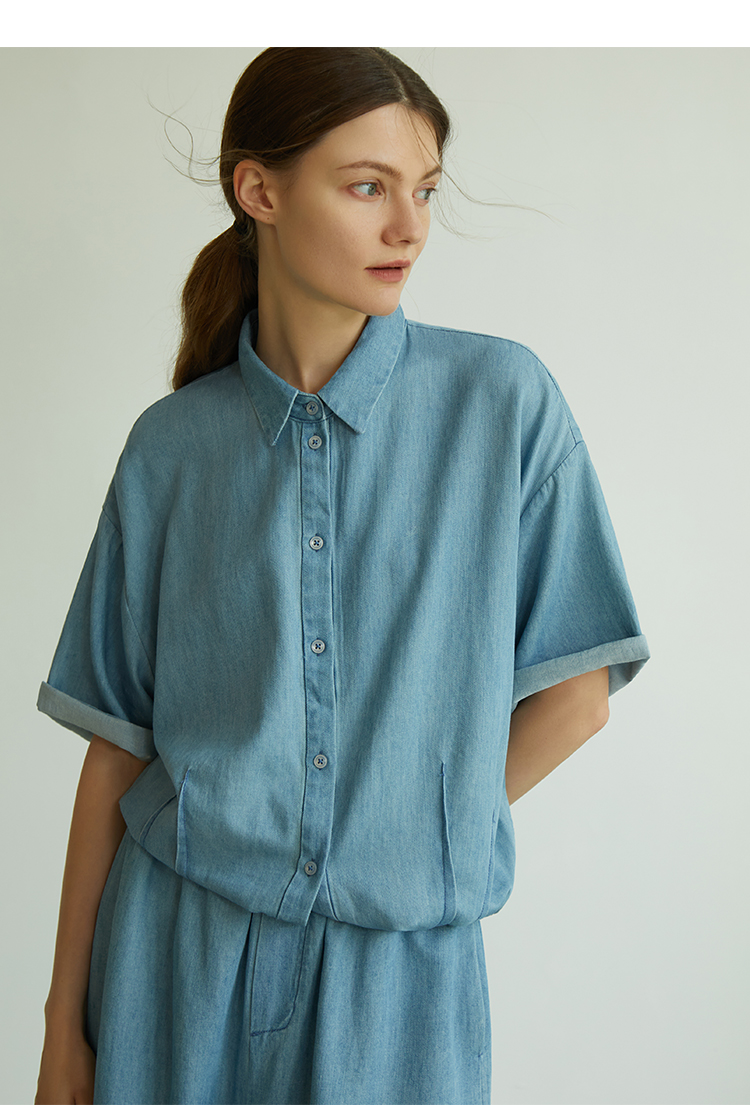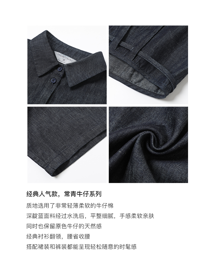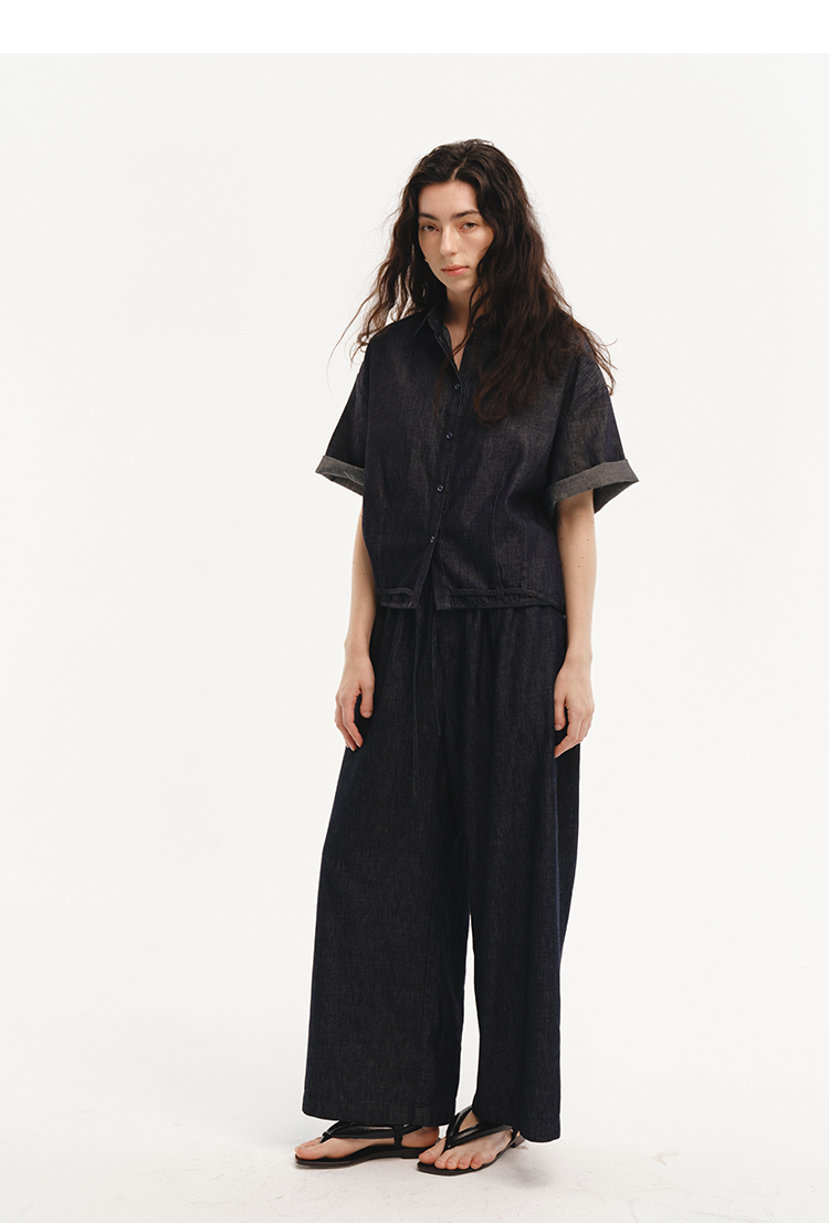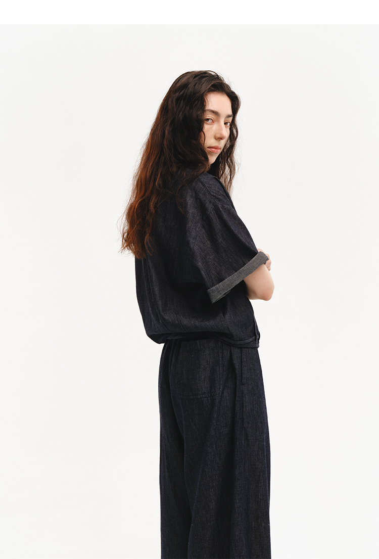Asaya1399 - ItoshIroshI deep indigo washed denim cotton thin soft classic lapel short drawstring loose shirt jacket