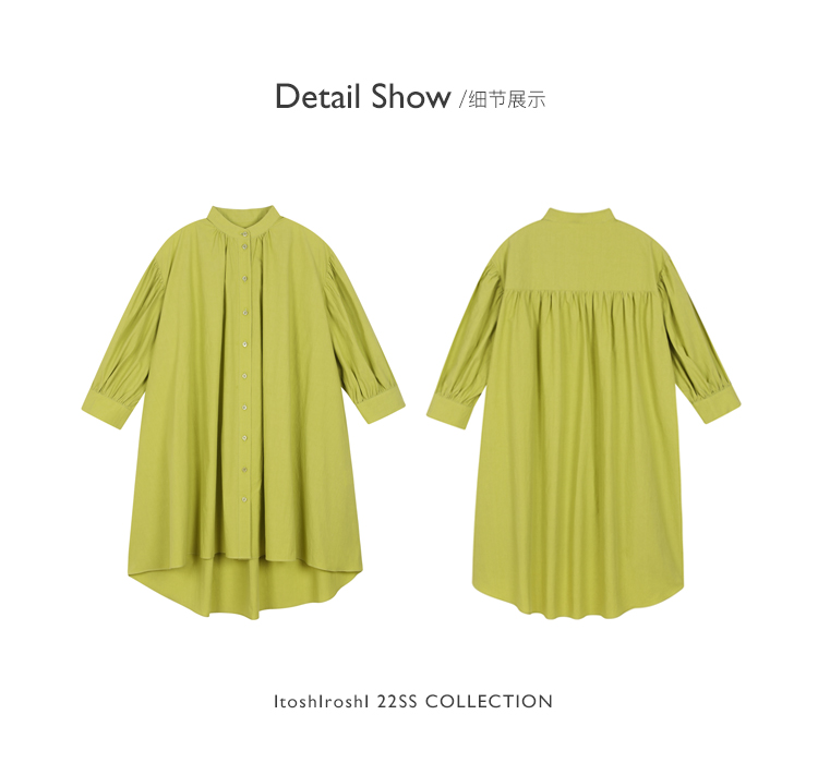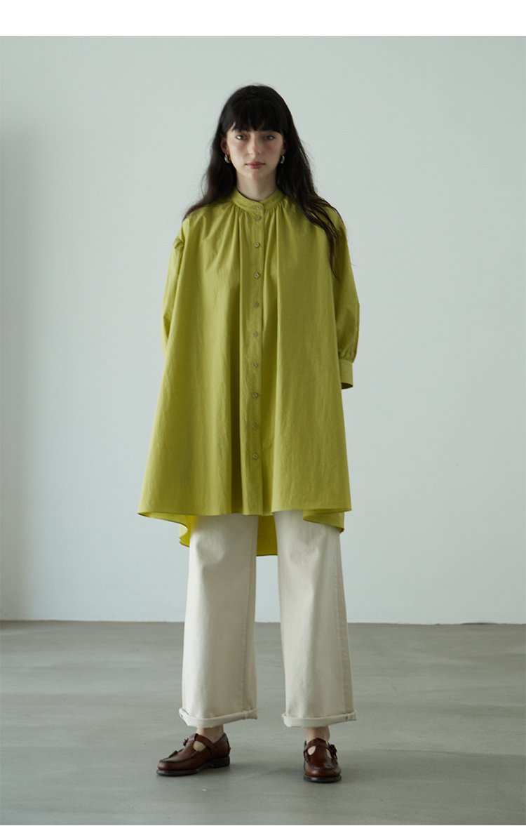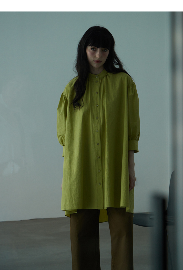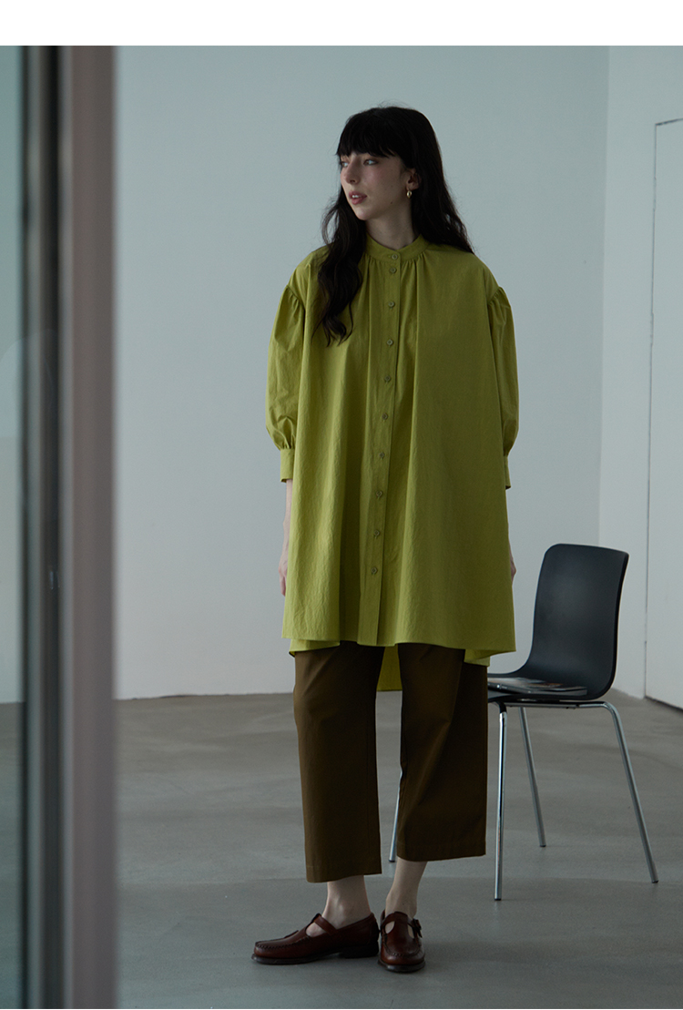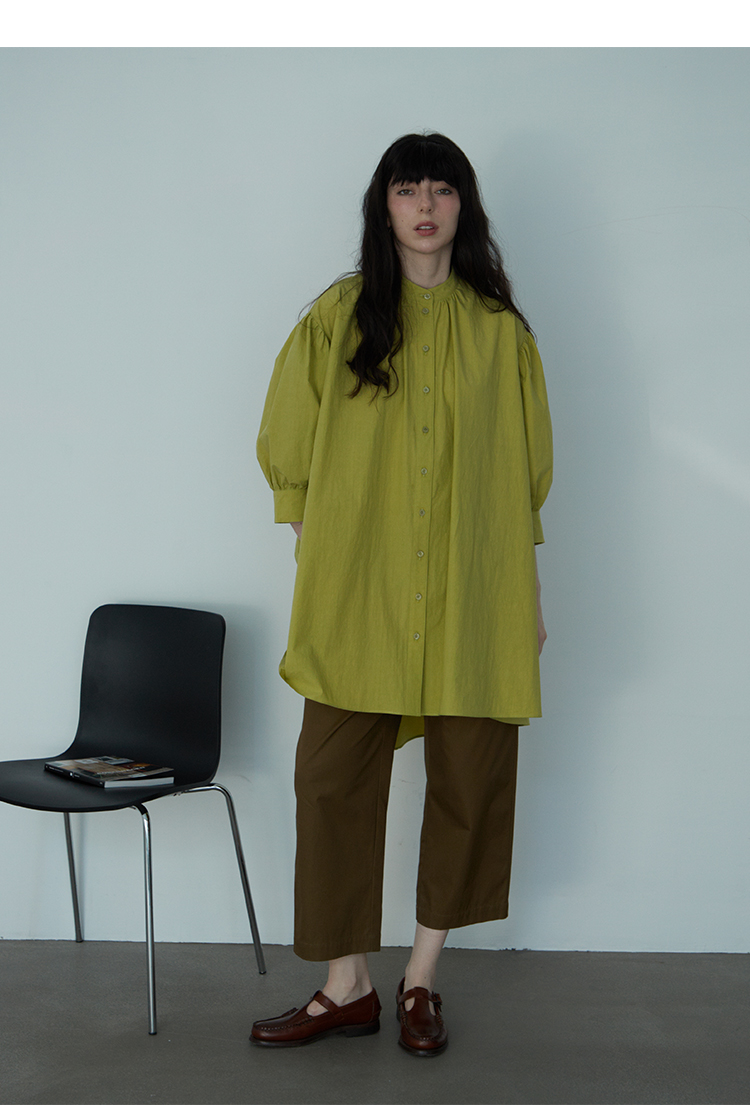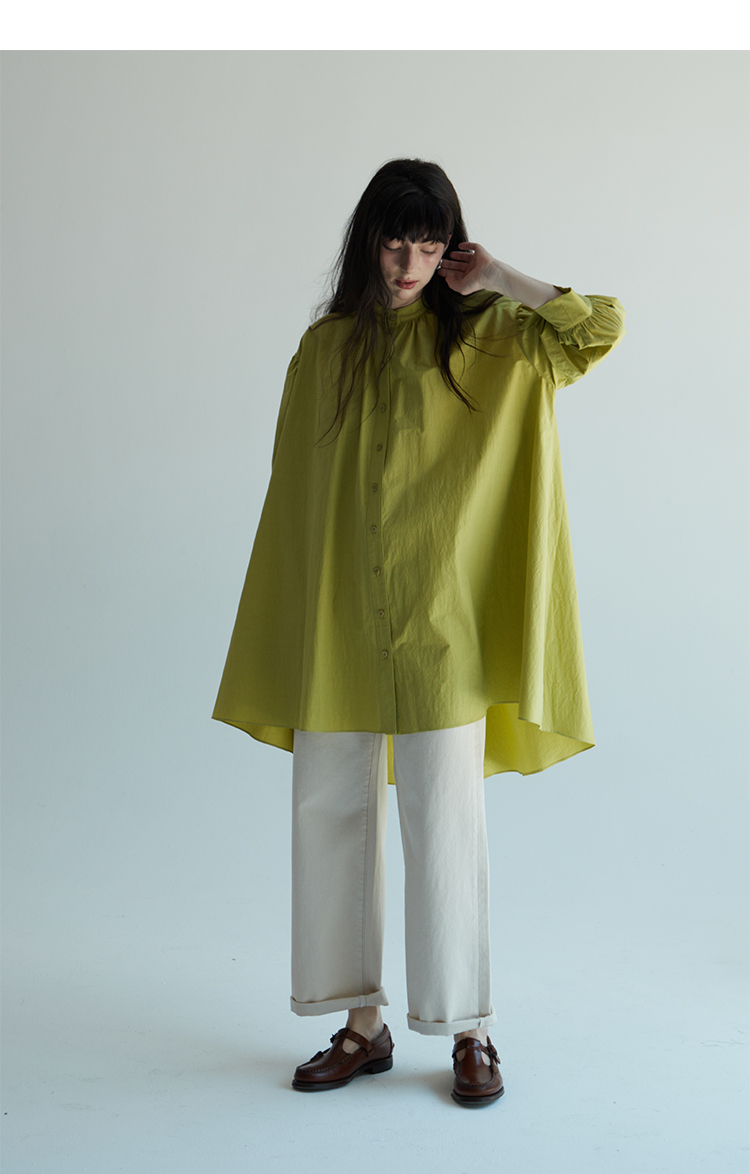 Asaya1397 - ItoshIroshI standing collar mustard yellow green silhouette A line long back short seven quarter lantern sleeves open collar pleated shirt