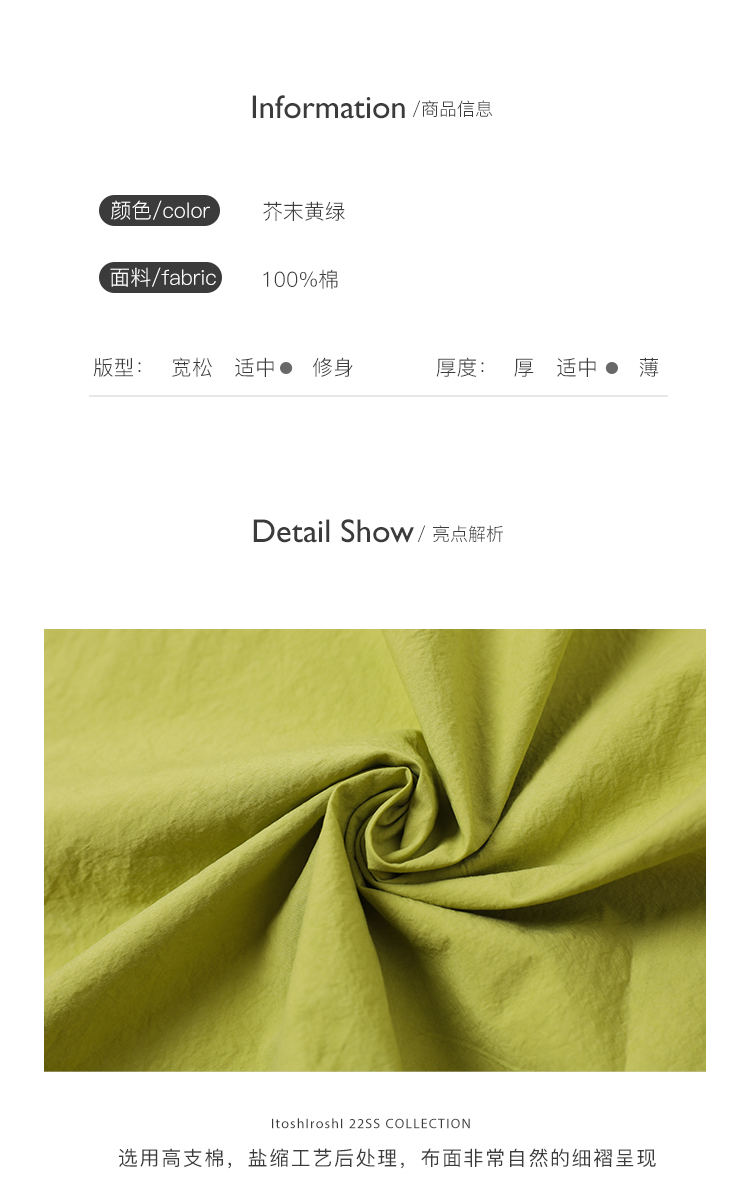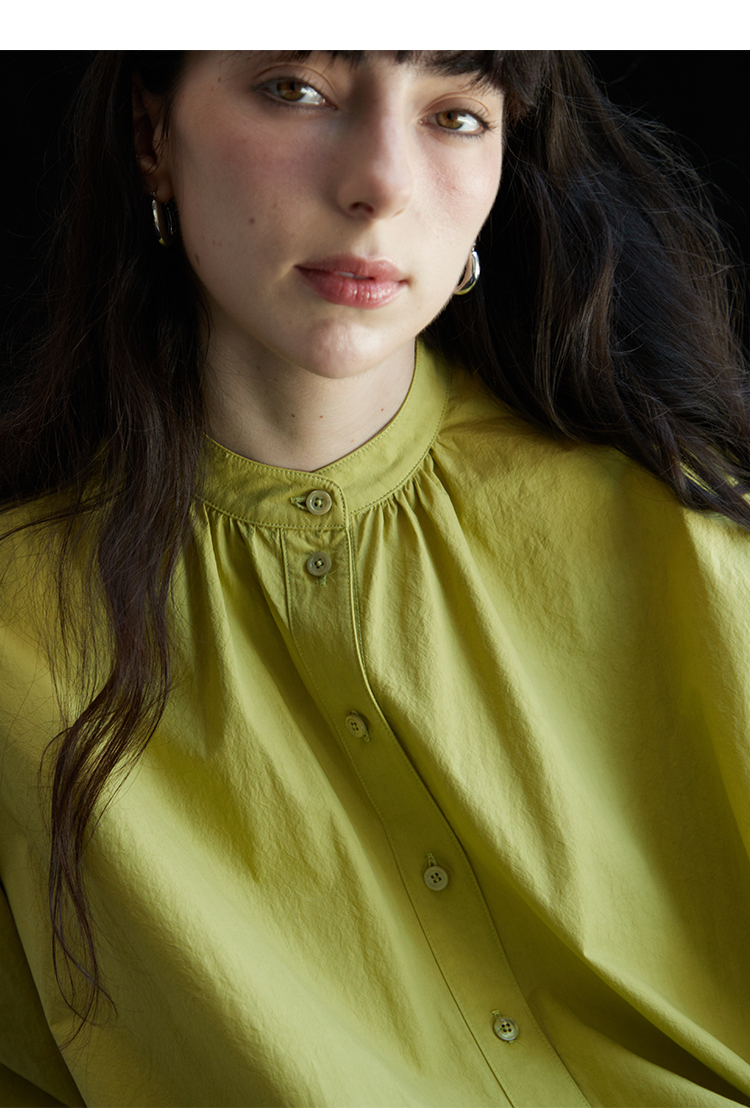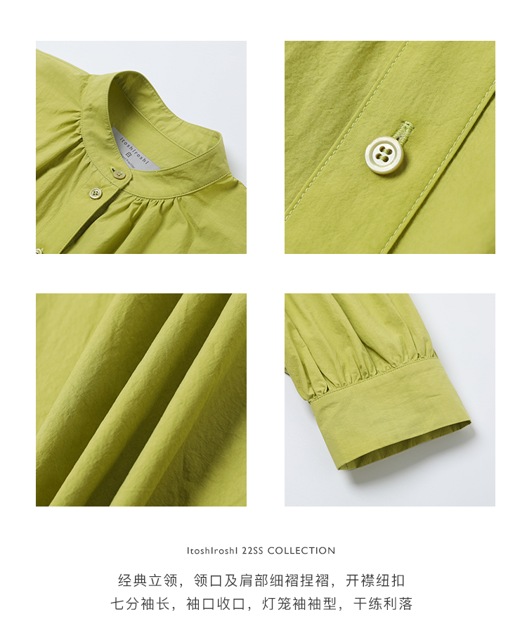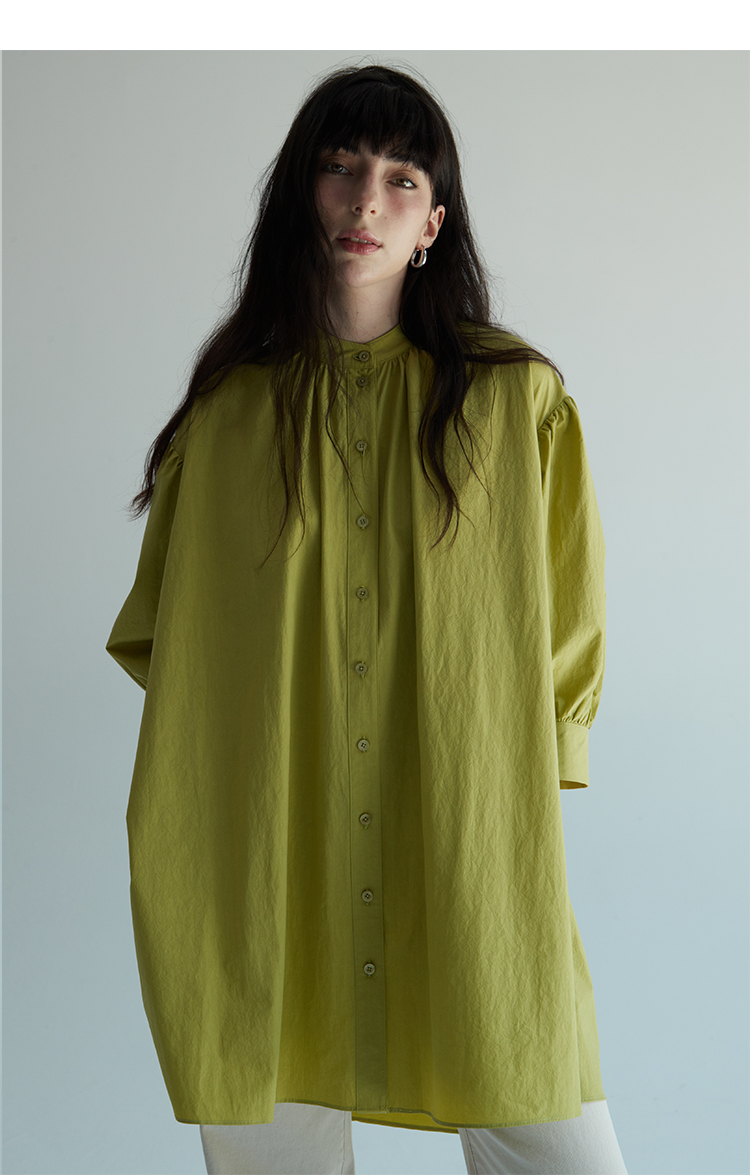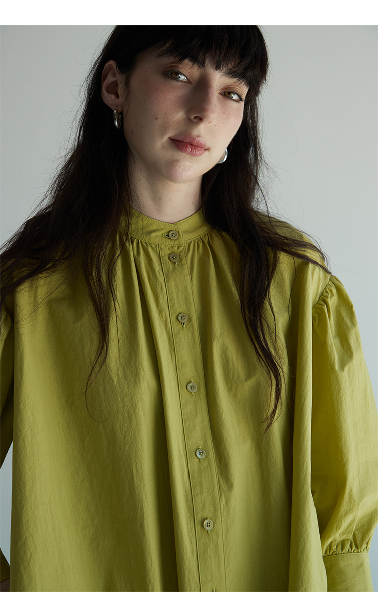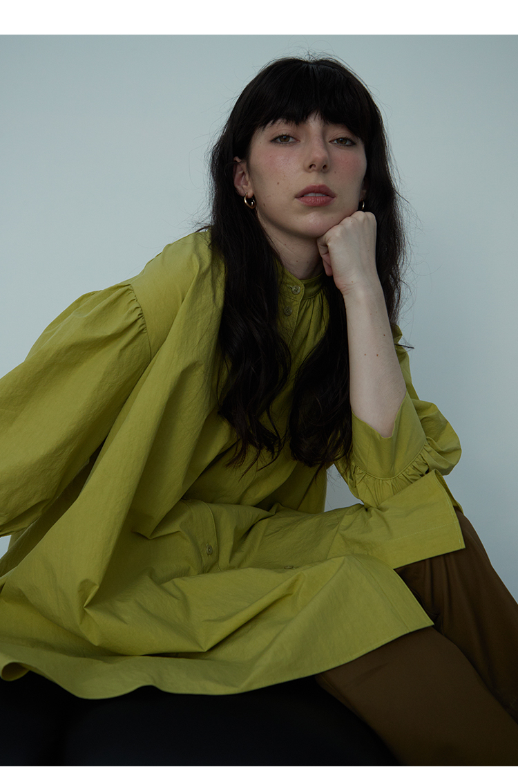 Asaya1397 - ItoshIroshI standing collar mustard yellow green silhouette A line long back short seven quarter lantern sleeves open collar pleated shirt