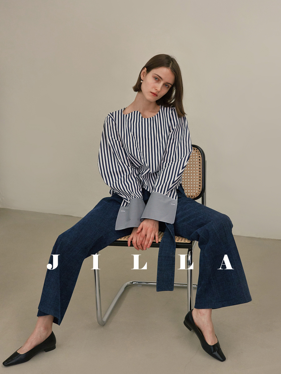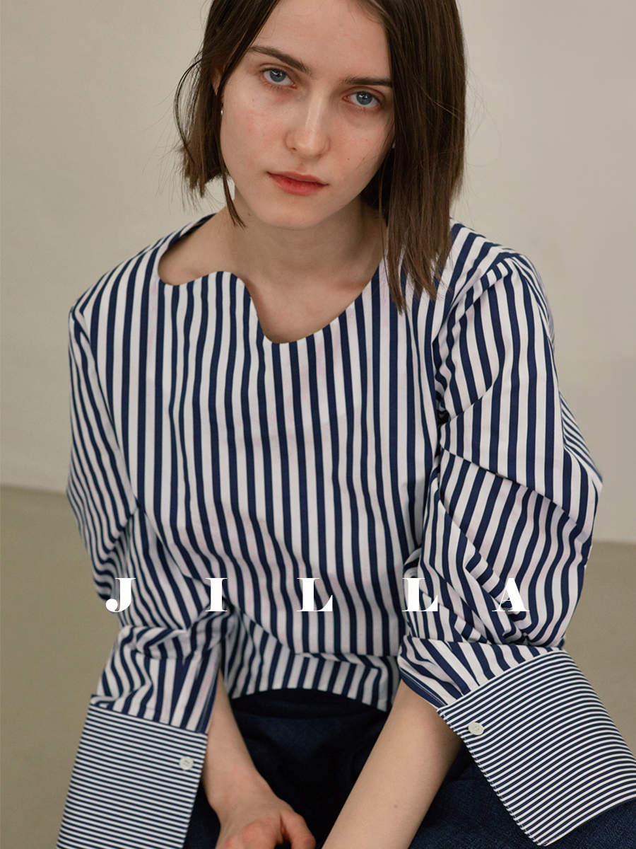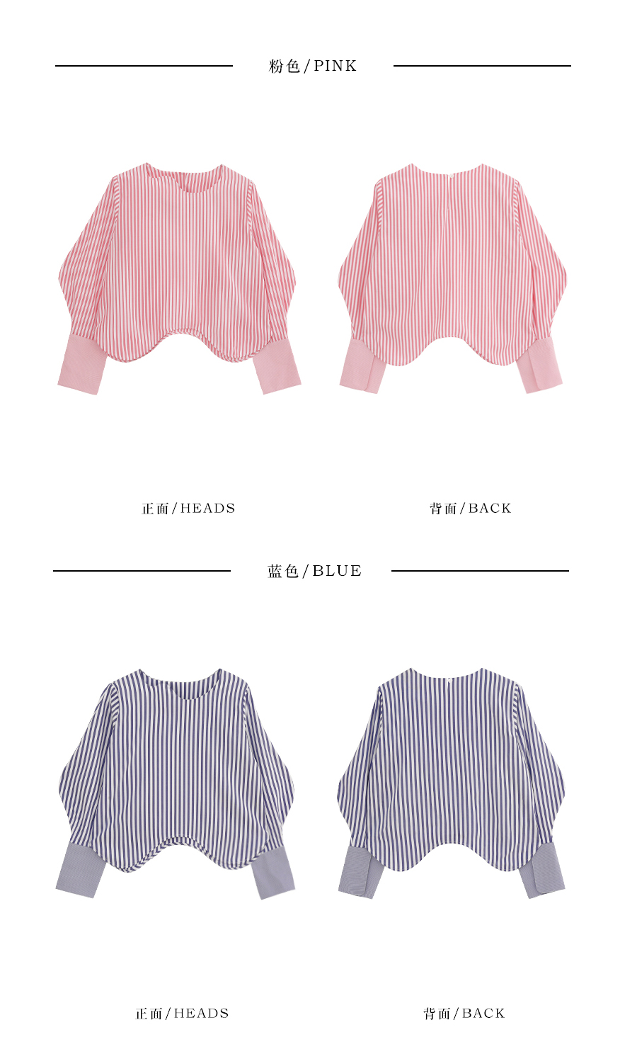 Asaya2133 : Stripped long-sleeved irregular wave neckline striped shirt