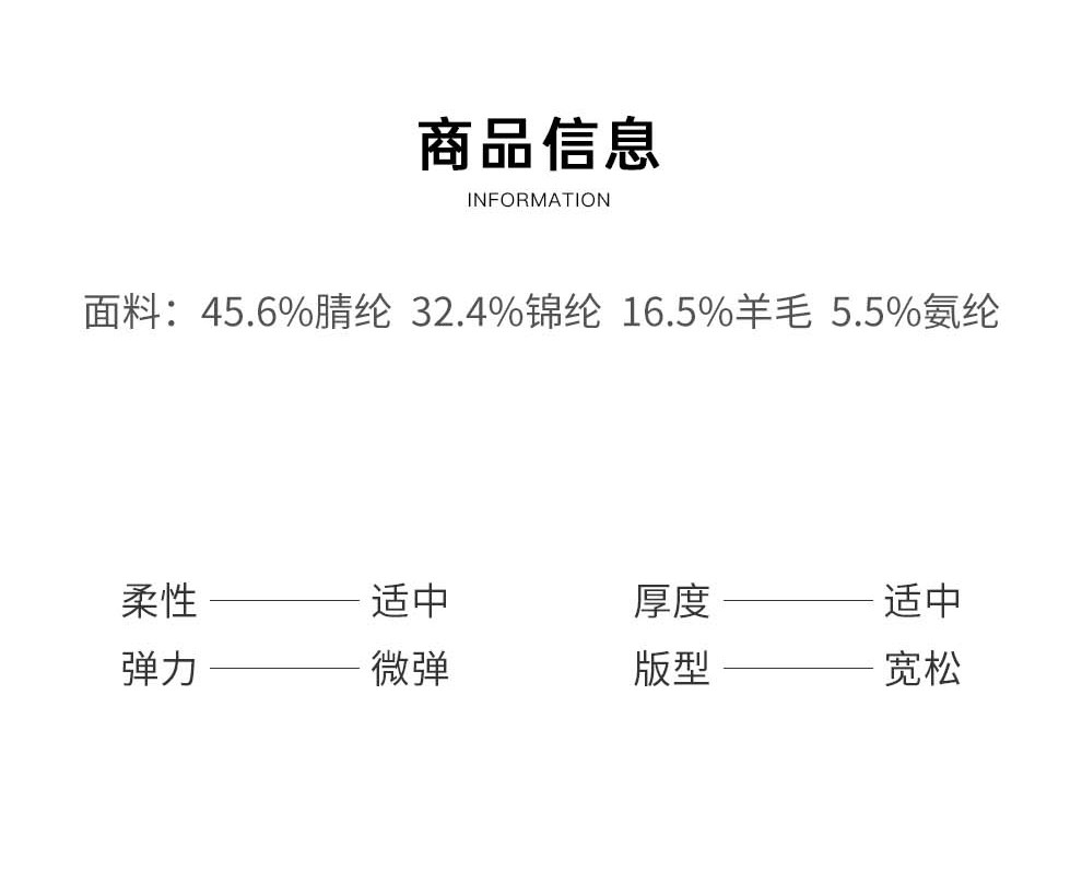 | Material composition | Polyacrylonitrile fiber (acrylic) 45.6%, polyamide fiber (nylon) 32.4%, wool 16.5%, polyurethane elastic fiber (spandex) 5.5%. |
