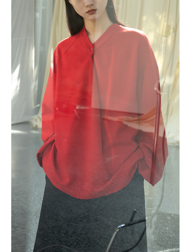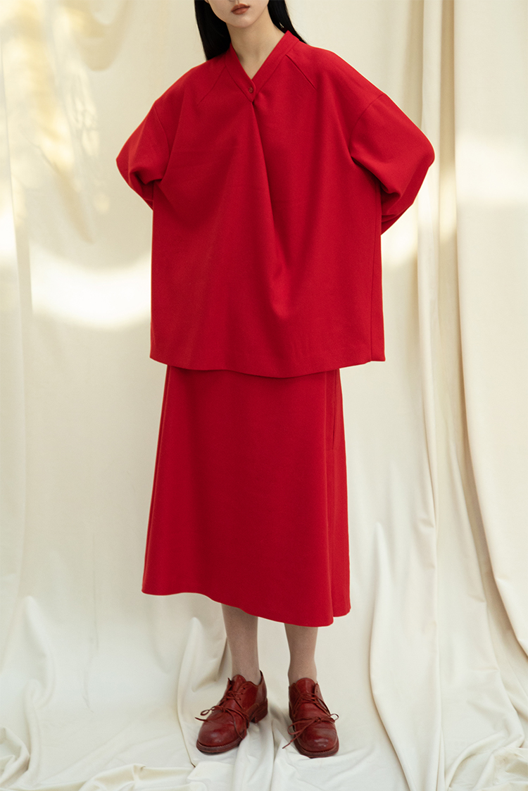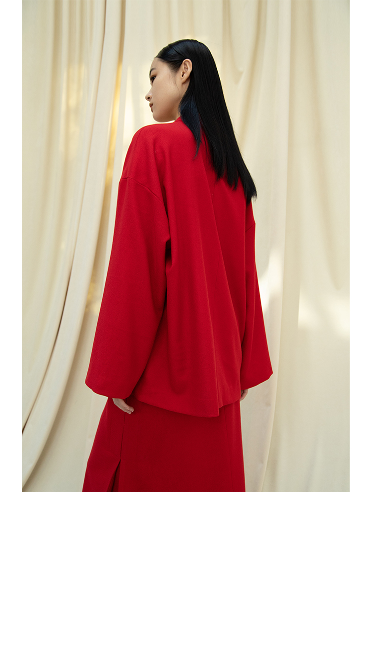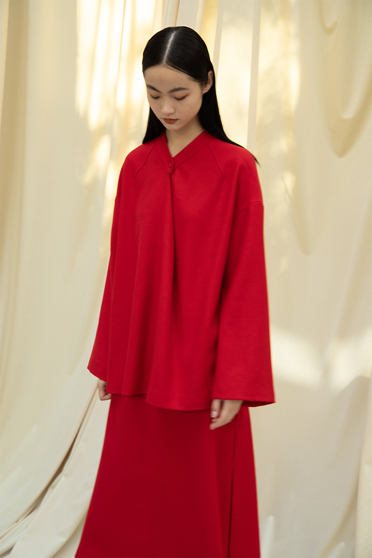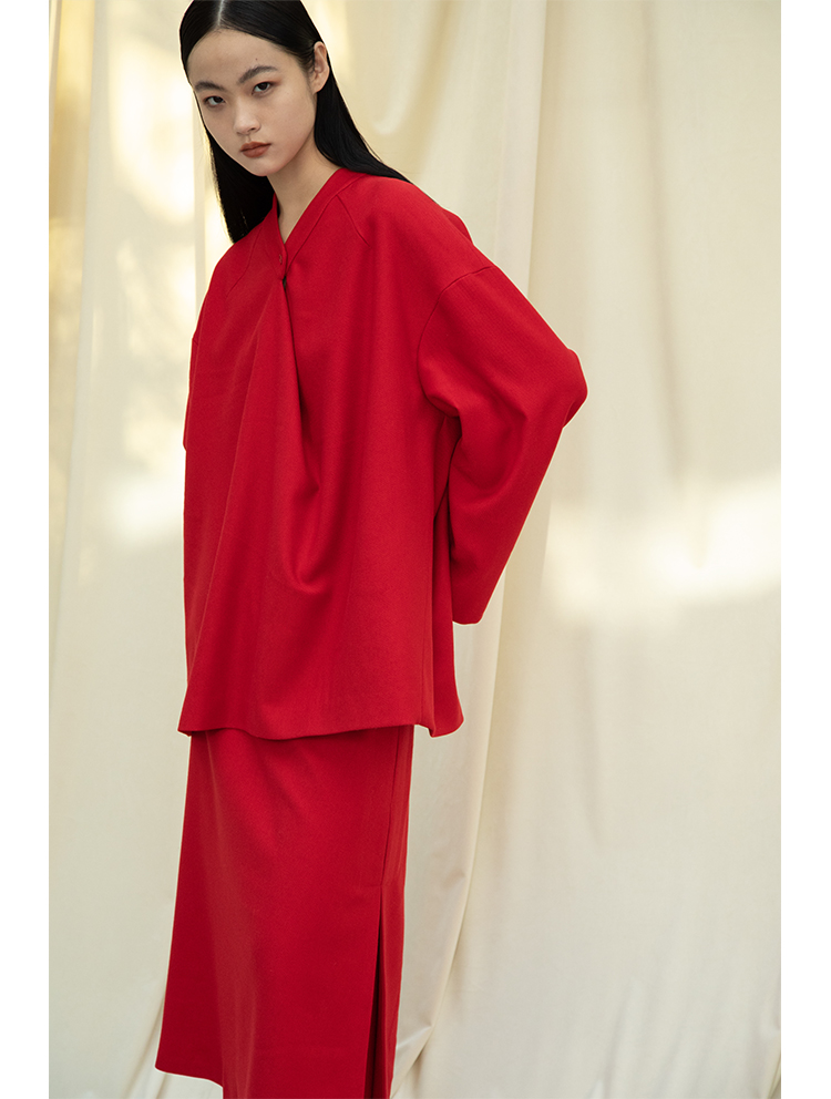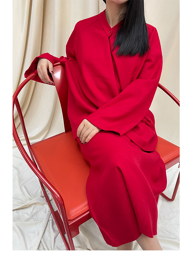 Asaya1438 - Knitted fabric three dimensional cutting Chinese elements high cold and bright red shirt set