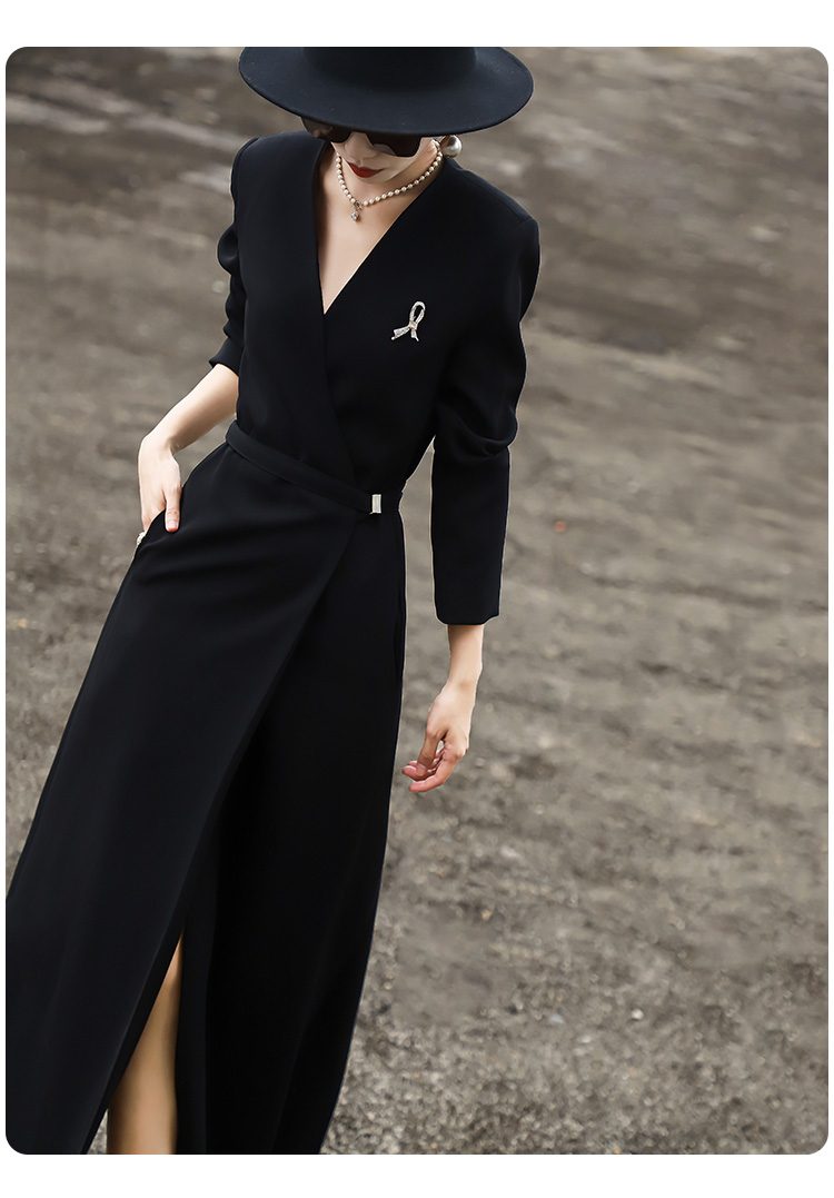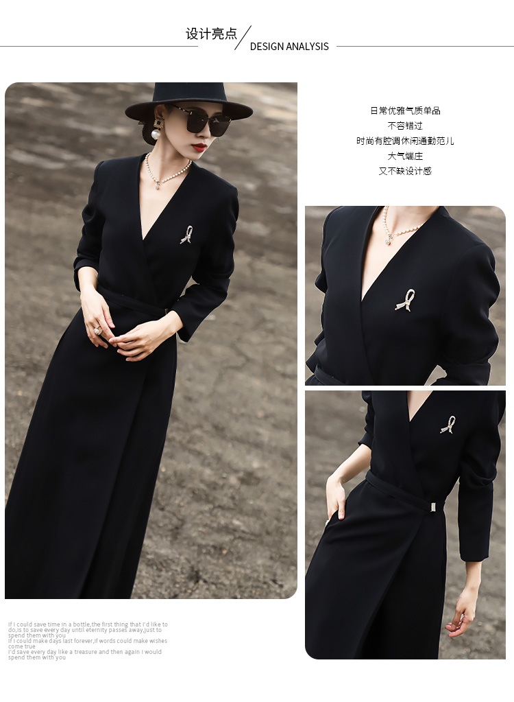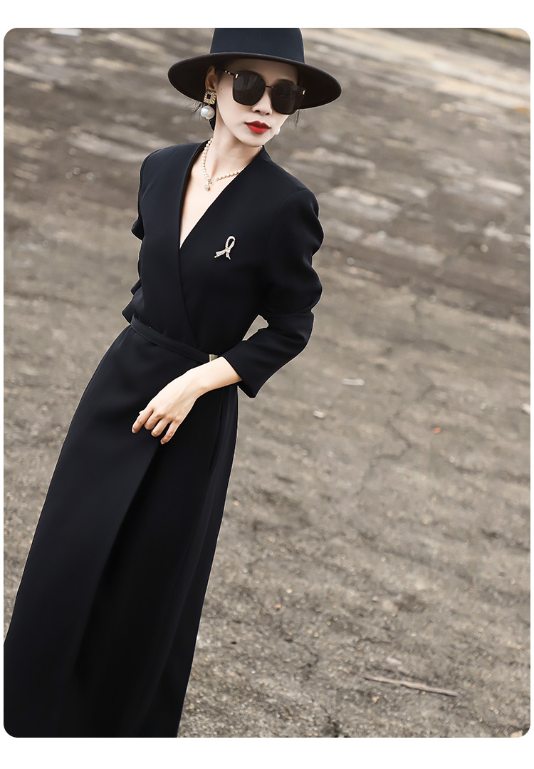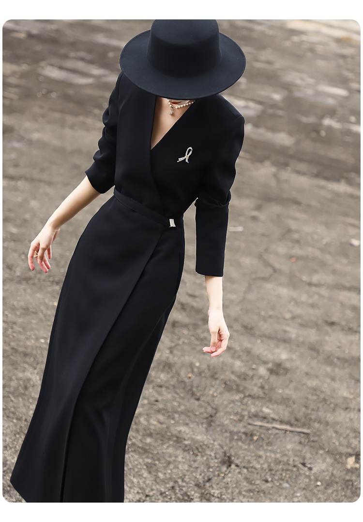 ASAYA2972 New temperament commuter slim V-neck acetate black suit dress