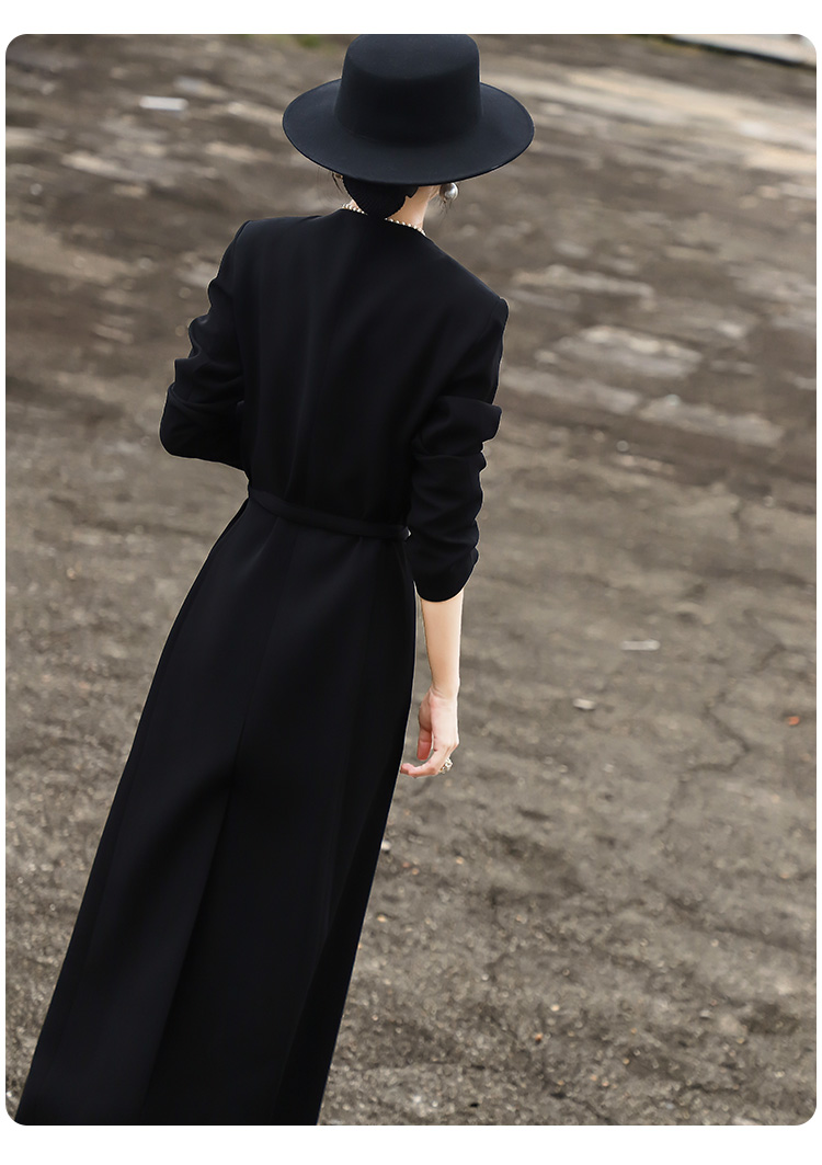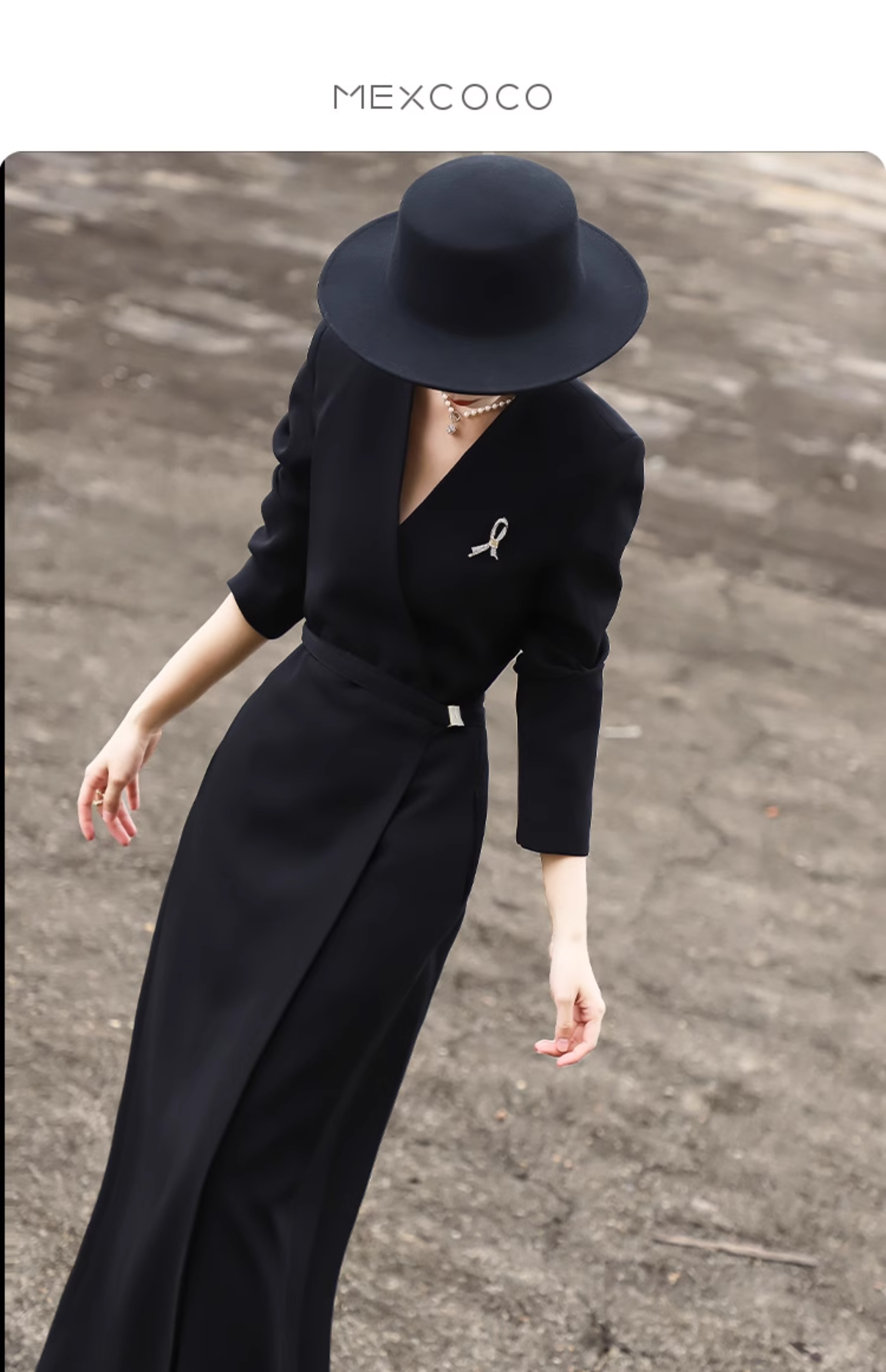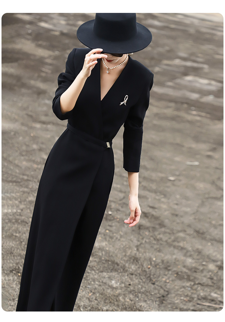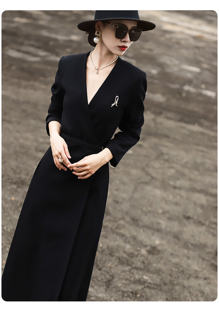 ASAYA2972 New temperament commuter slim V-neck acetate black suit dress