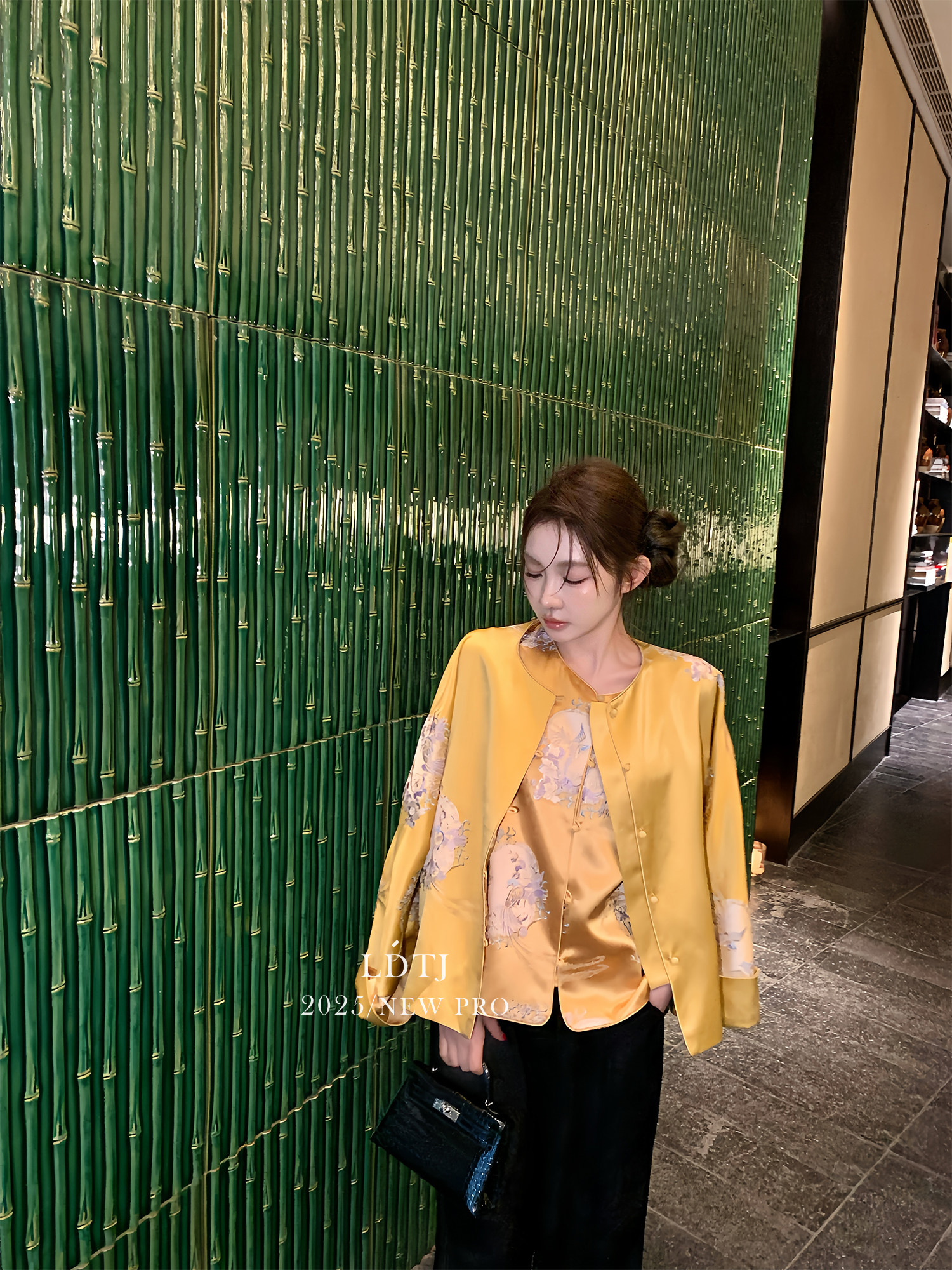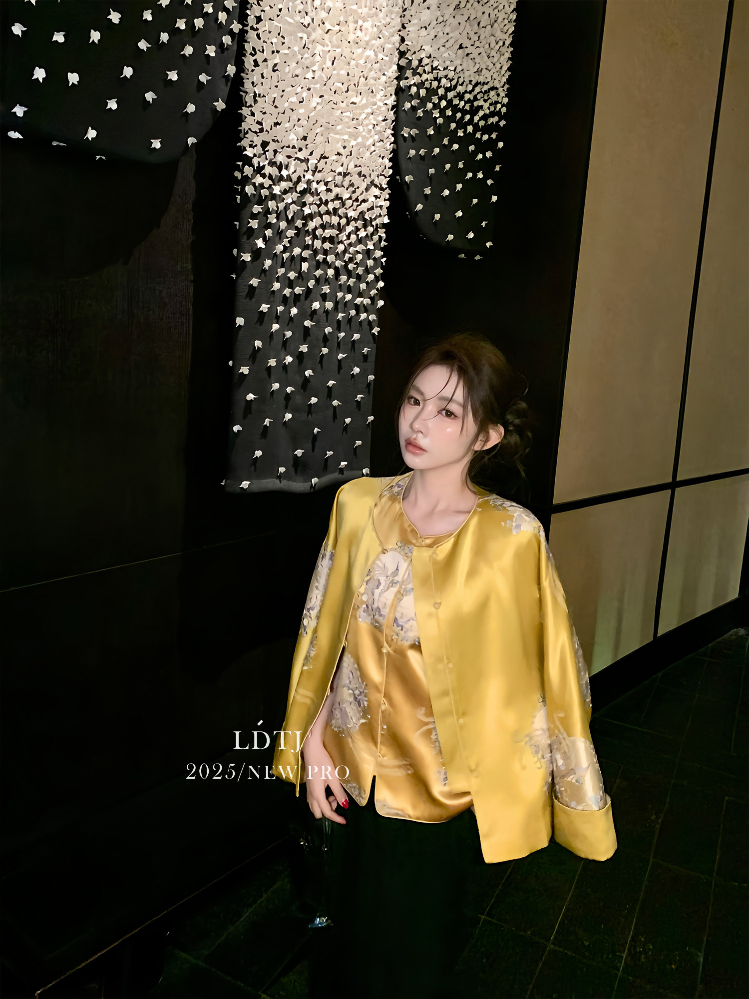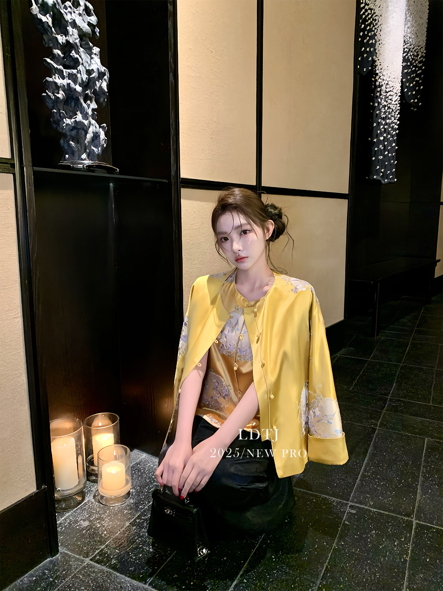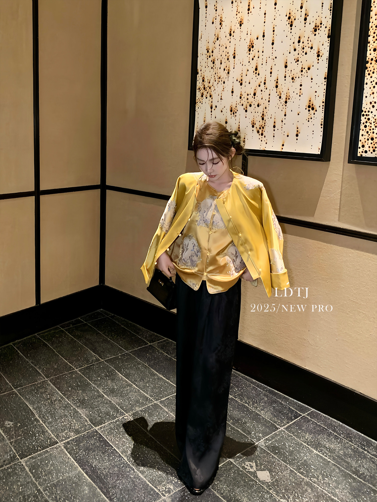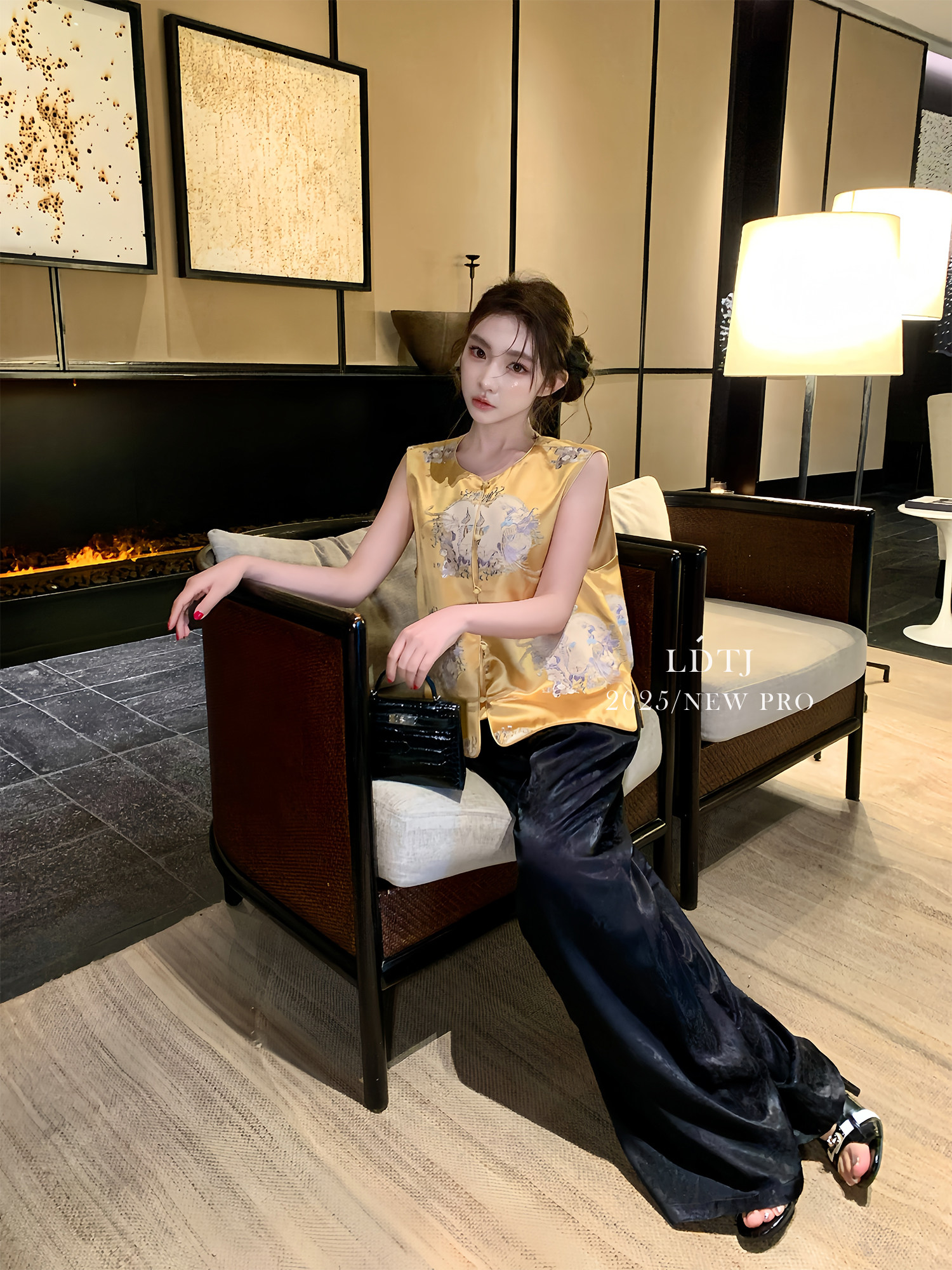 | color classification | Yellow embroidered buckle vest with 76% acetic acid+heavy embroidery technology+24% polyester, yellow embroidered buckle jacket with 76% acetic acid+heavy embroidery technology+24% polyester, smoked black pants with 63% acetic acid jacquard+35% polyester, cloud apricot pants with 63% acetic acid jacquard+35% polyester |