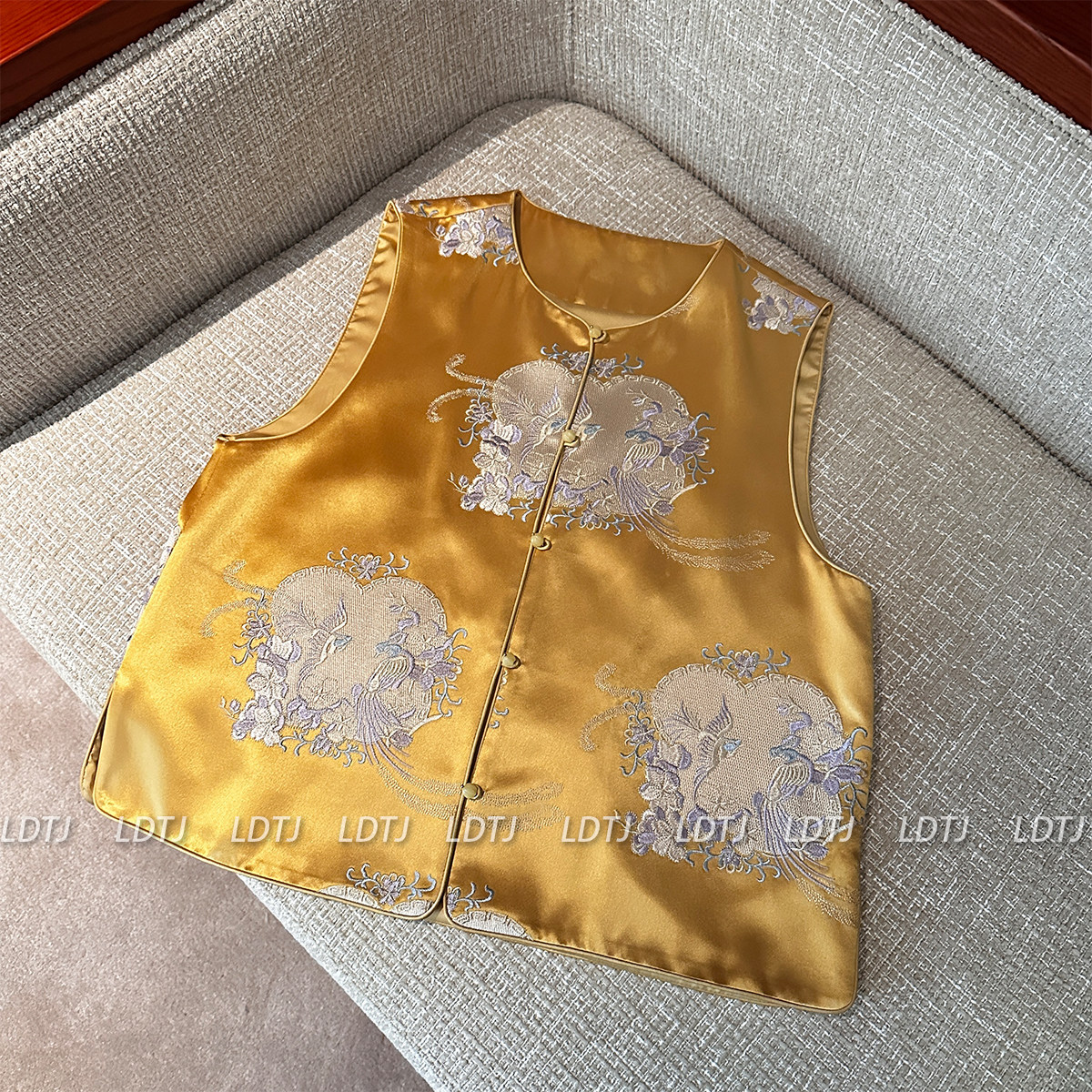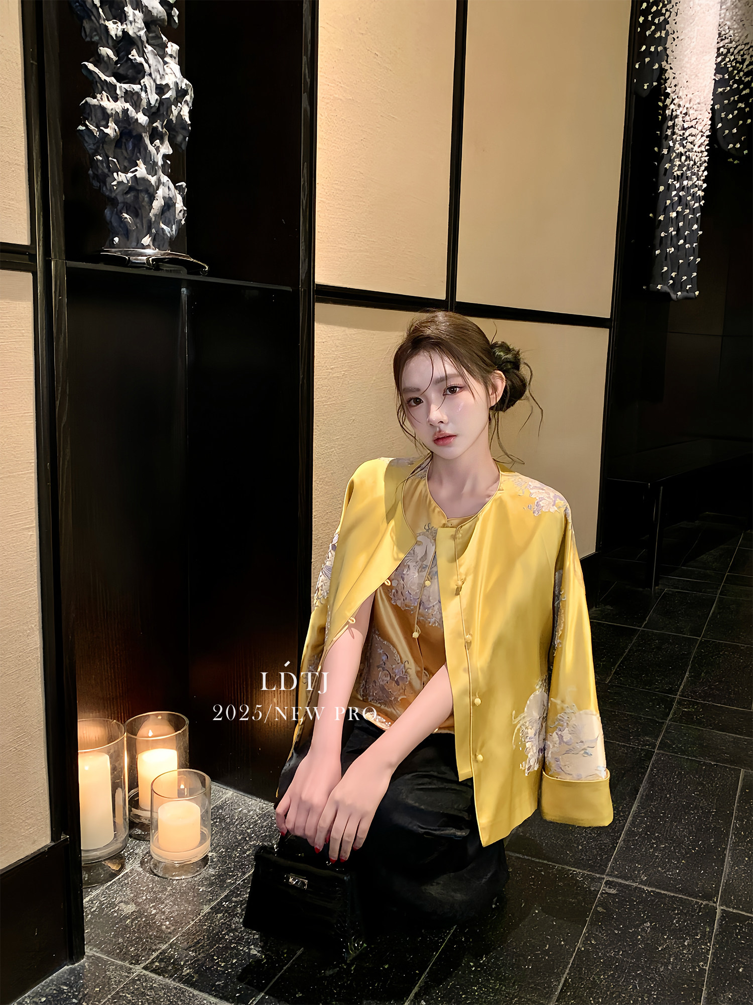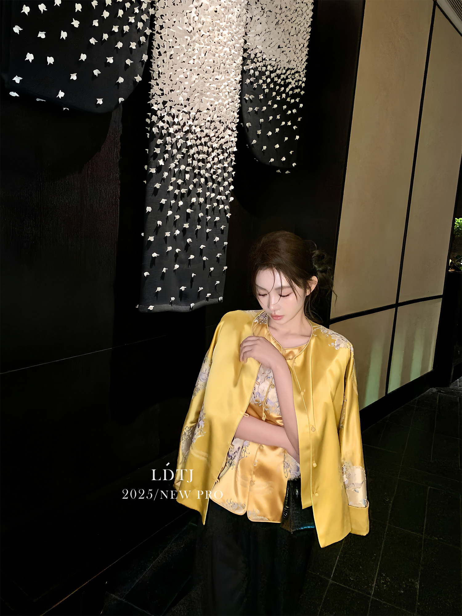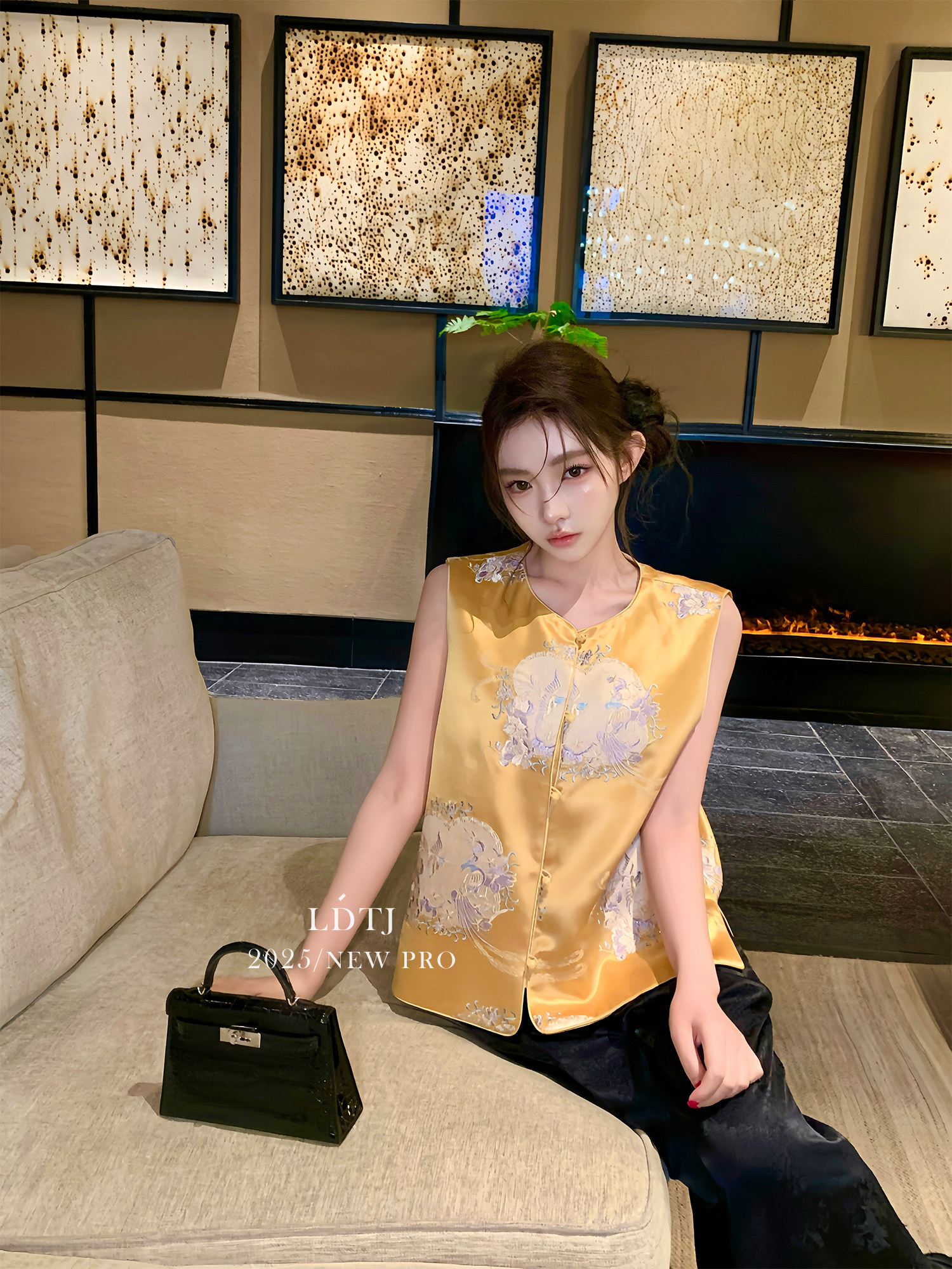 | color classification | Yellow embroidered buckle vest with 76% acetic acid+heavy embroidery technology+24% polyester, yellow embroidered buckle jacket with 76% acetic acid+heavy embroidery technology+24% polyester, smoked black pants with 63% acetic acid jacquard+35% polyester, cloud apricot pants with 63% acetic acid jacquard+35% polyester |