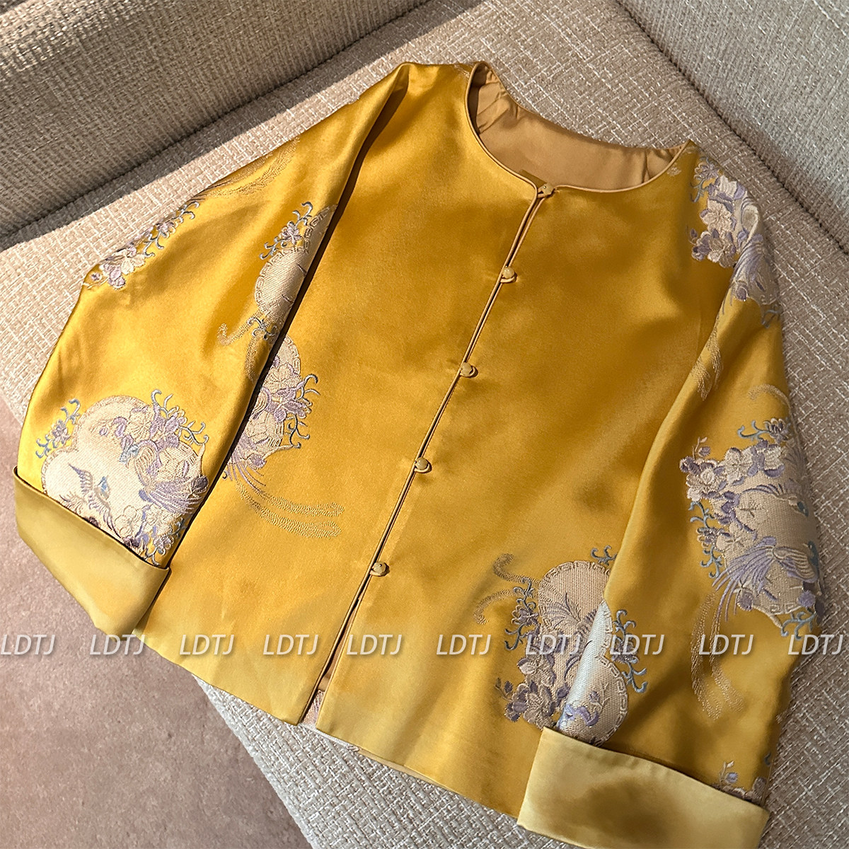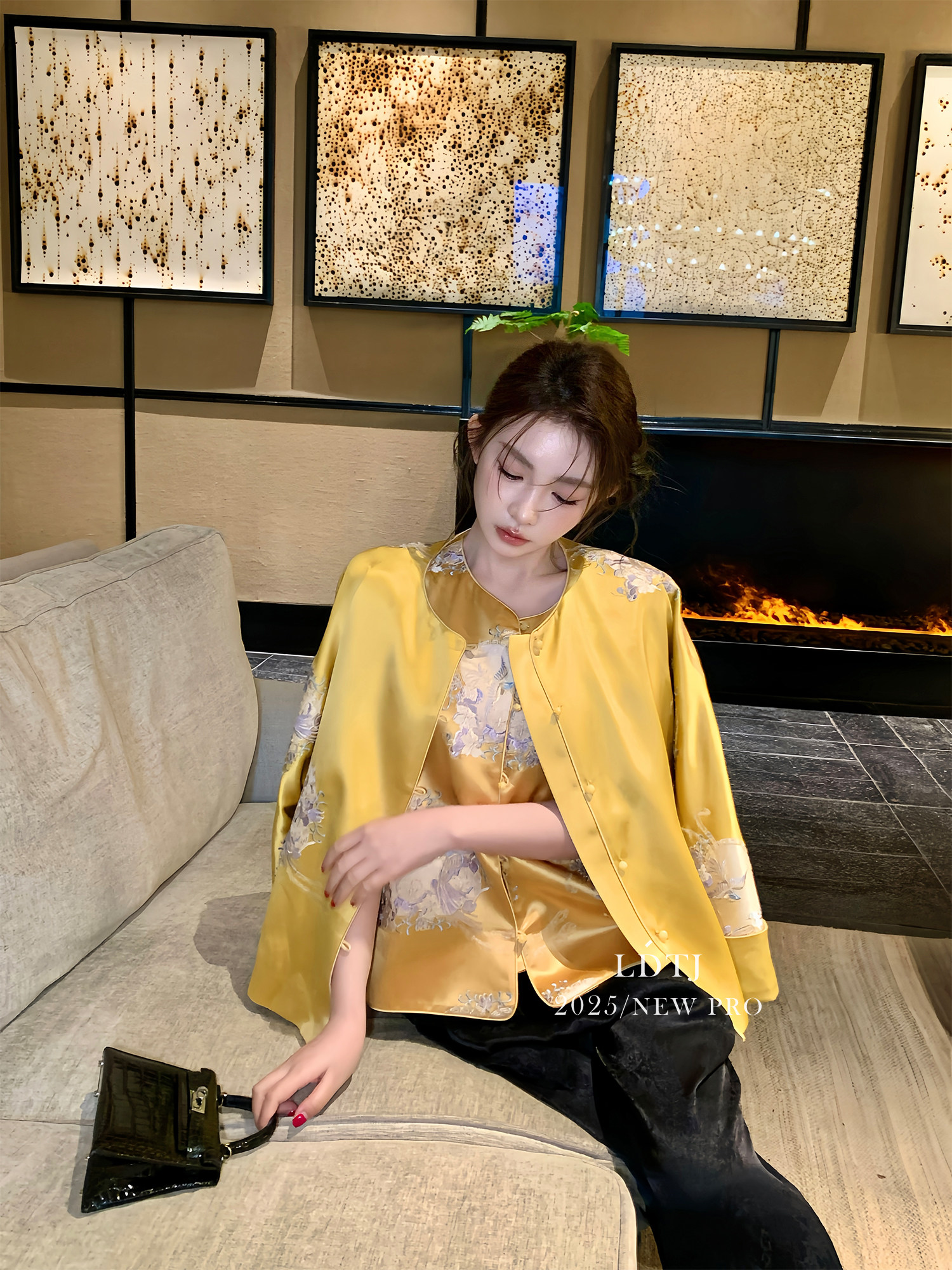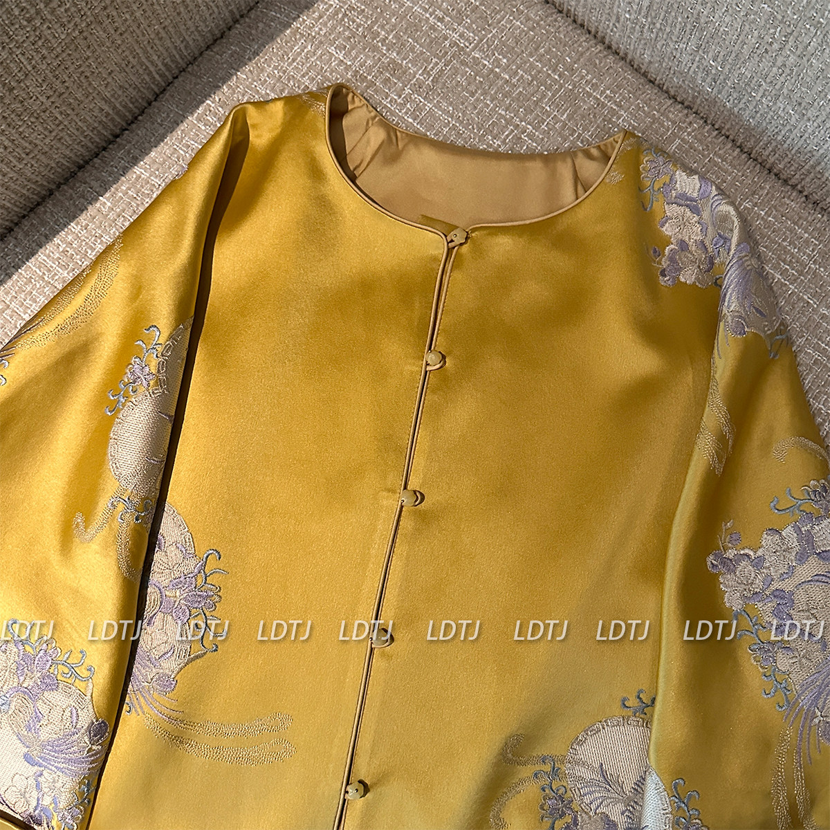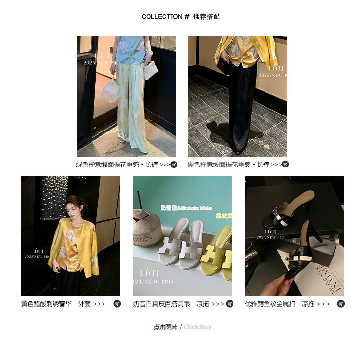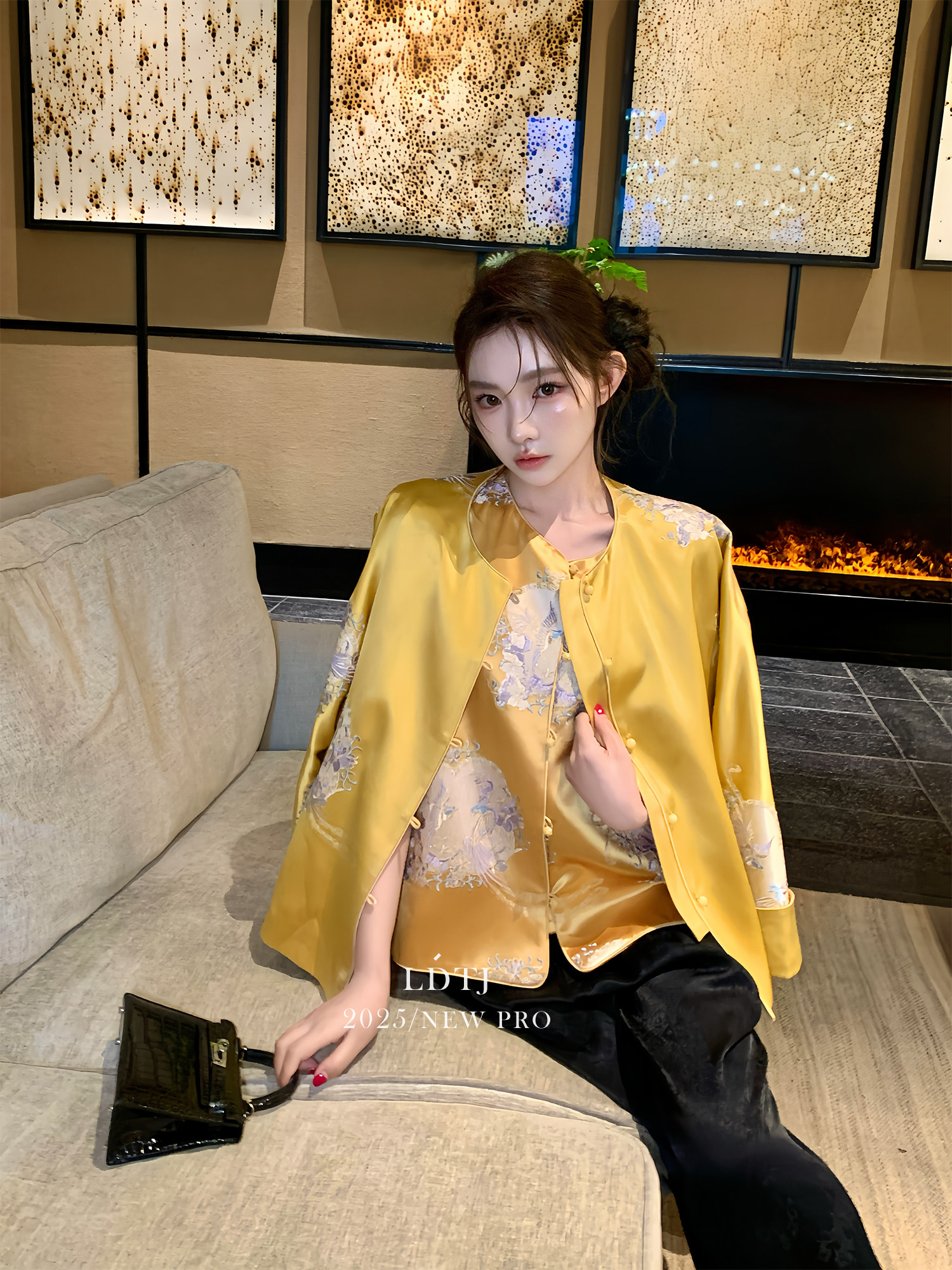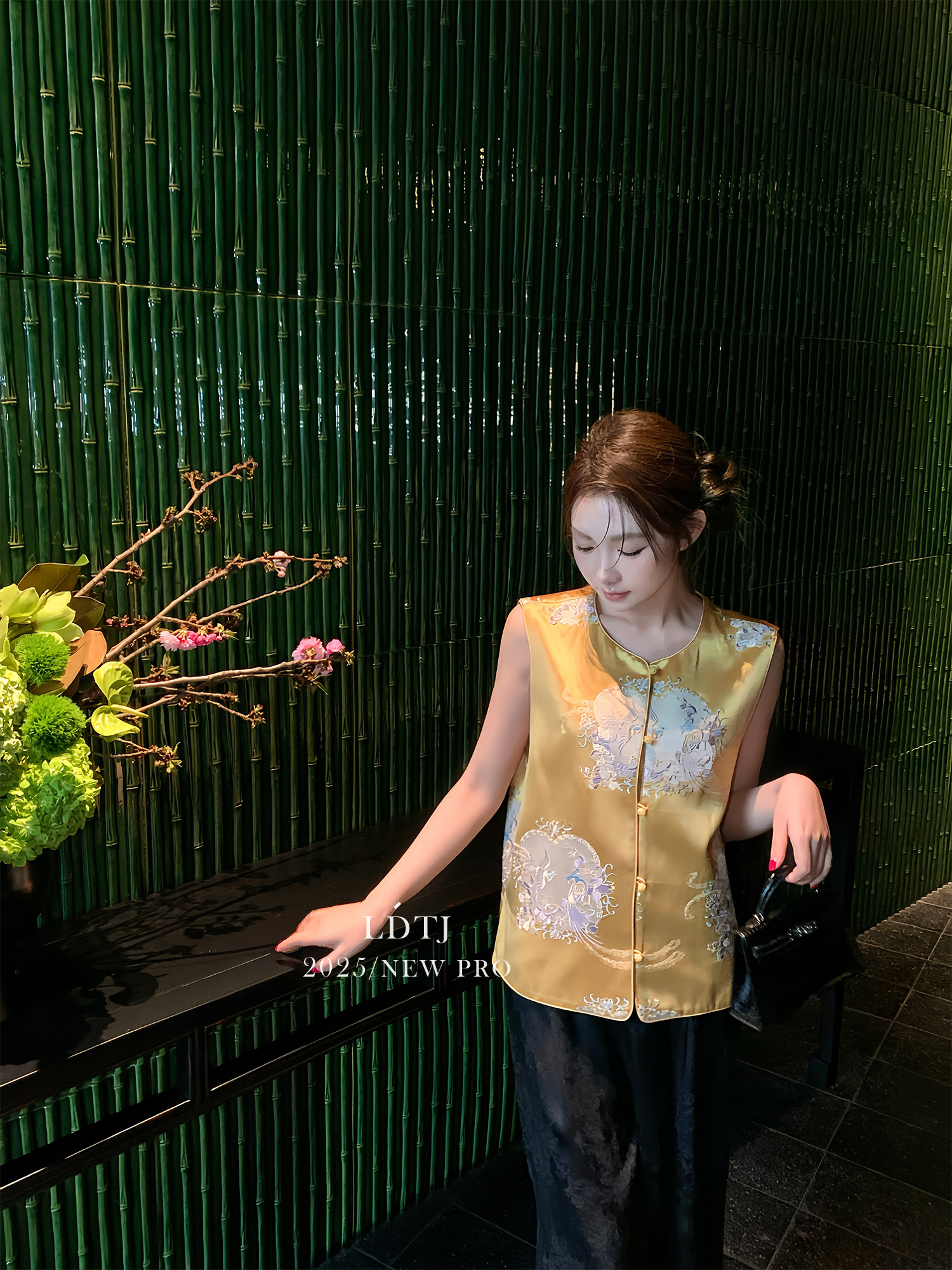 | color classification | Yellow embroidered buckle vest with 76% acetic acid+heavy embroidery technology+24% polyester, yellow embroidered buckle jacket with 76% acetic acid+heavy embroidery technology+24% polyester, smoked black pants with 63% acetic acid jacquard+35% polyester, cloud apricot pants with 63% acetic acid jacquard+35% polyester |