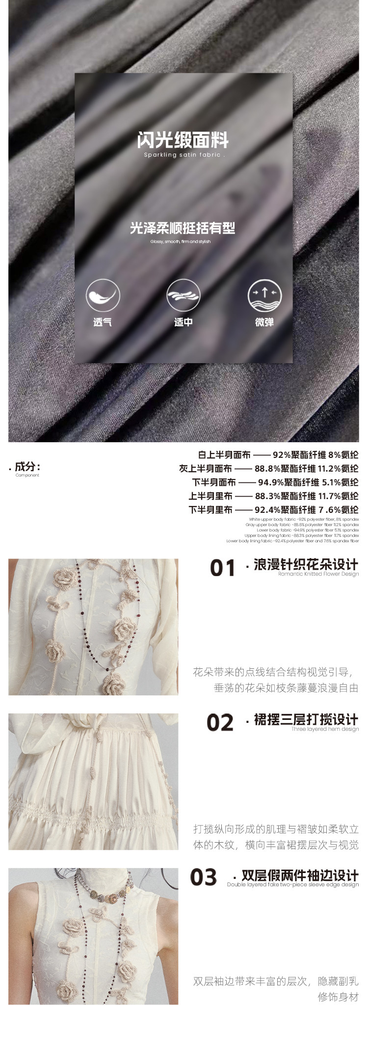 | Material composition | Polyethylene terephthalate (polyester) 91.5% polyurethane elastic fiber (spandex) 8.5% |