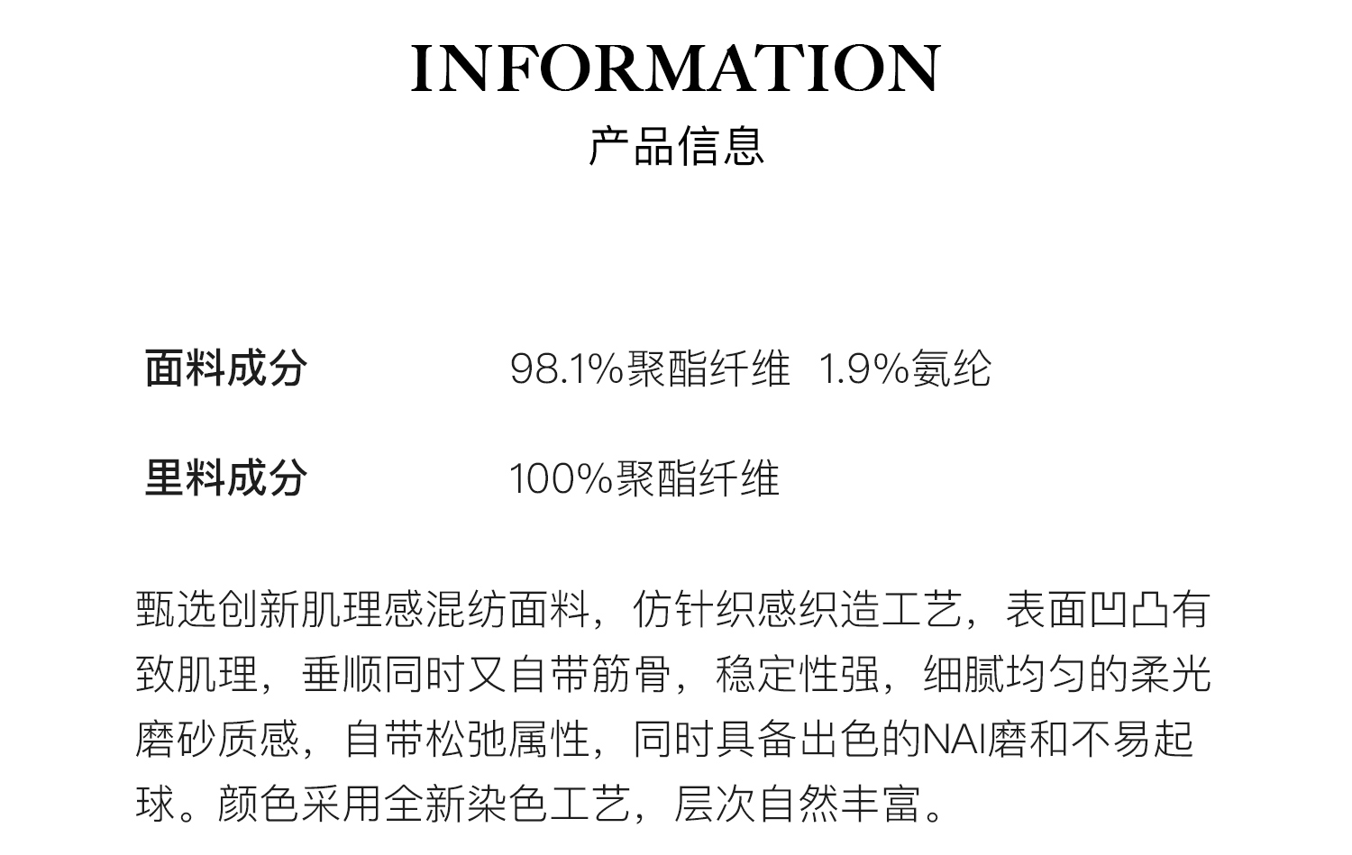 Material composition | Polyester fiber 98.1% polyurethane elastic fiber (spandex) 1.9% |