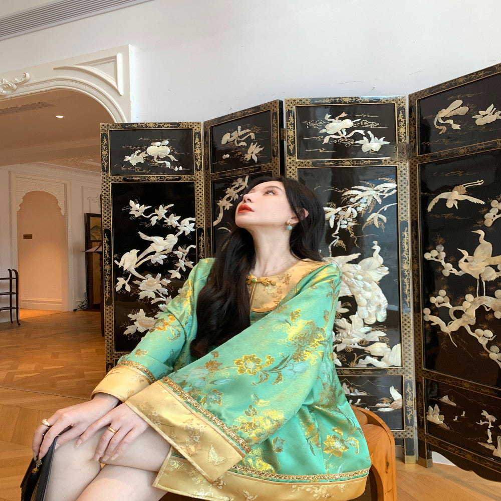 ASAYA-3793: Floating Green Gilded Jacquard Top 🌿