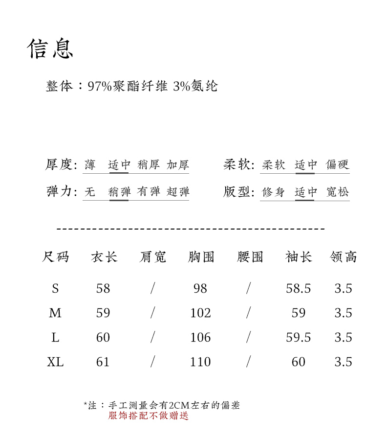 Material composition | Polyester fiber 97% polyurethane elastic fiber (spandex) 3% |