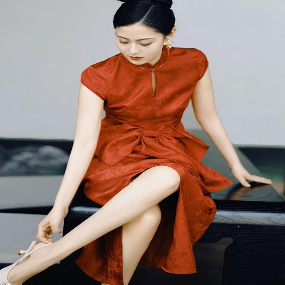 SAYA3997👗 Refined Elegance: Red Cheongsam with a Statement Bow🎀